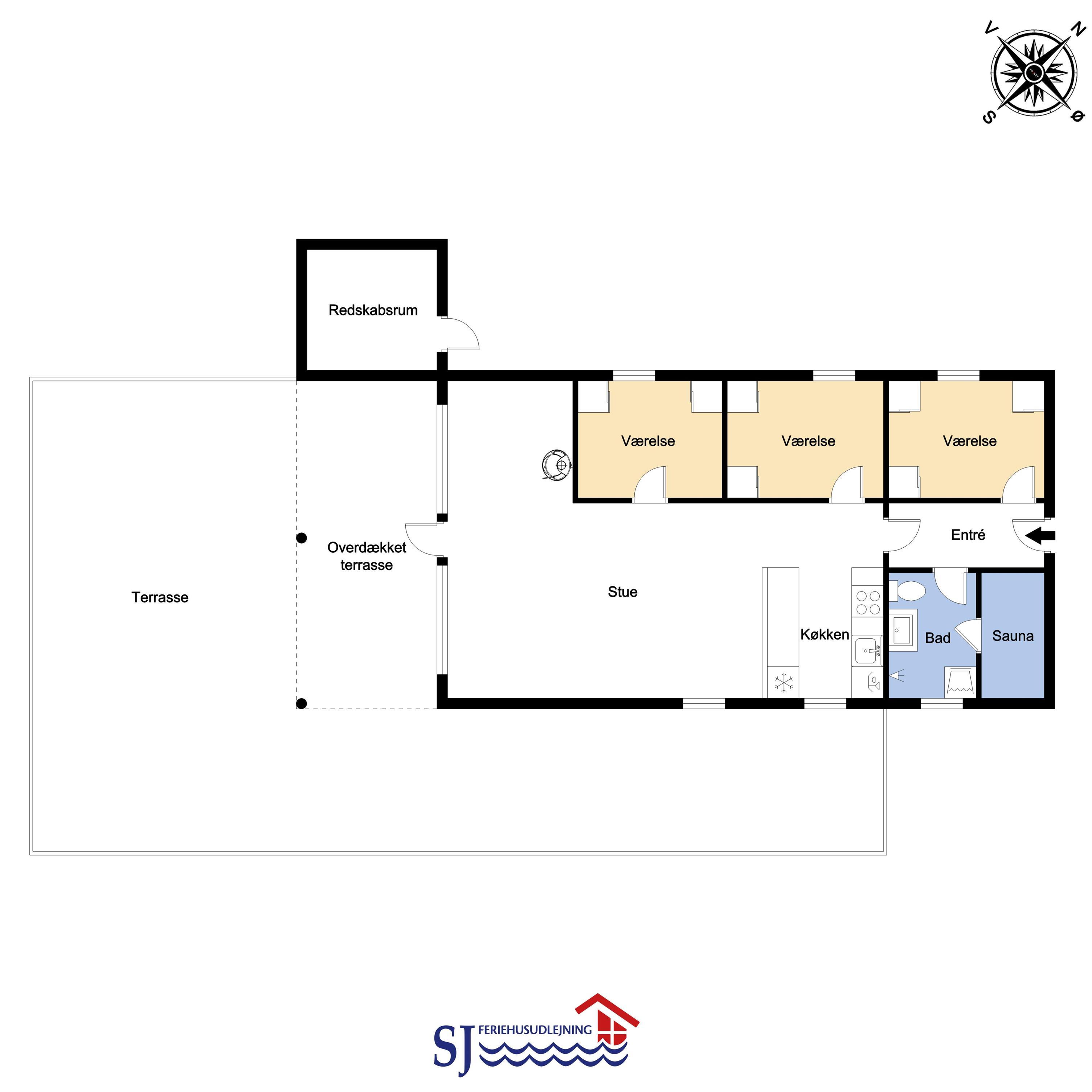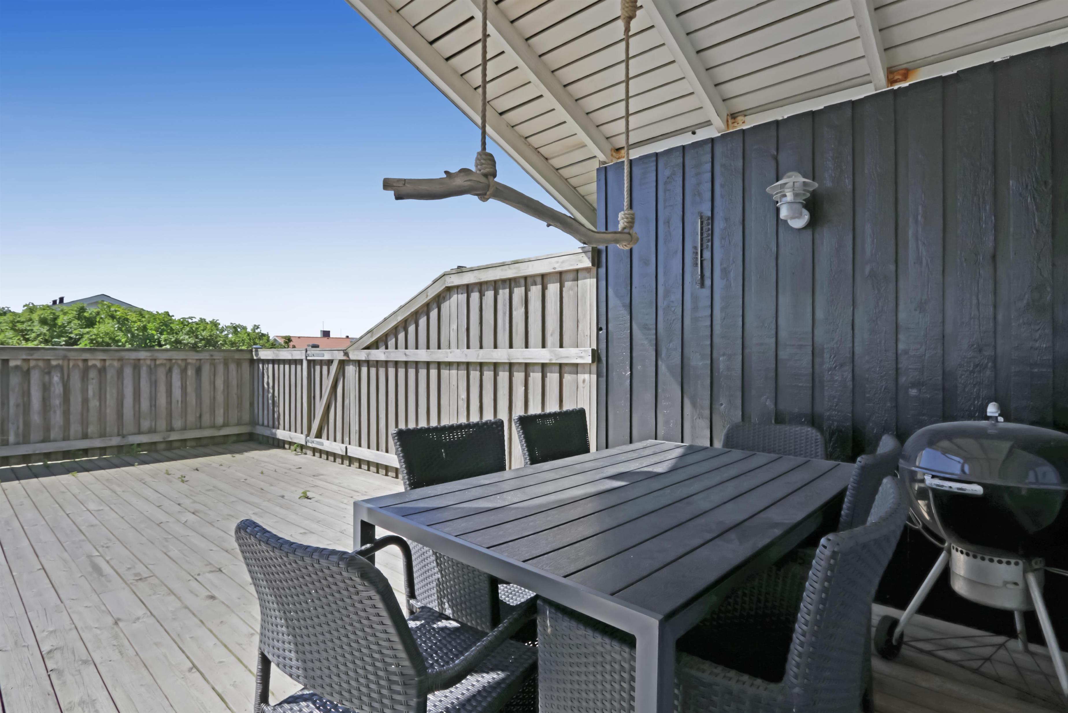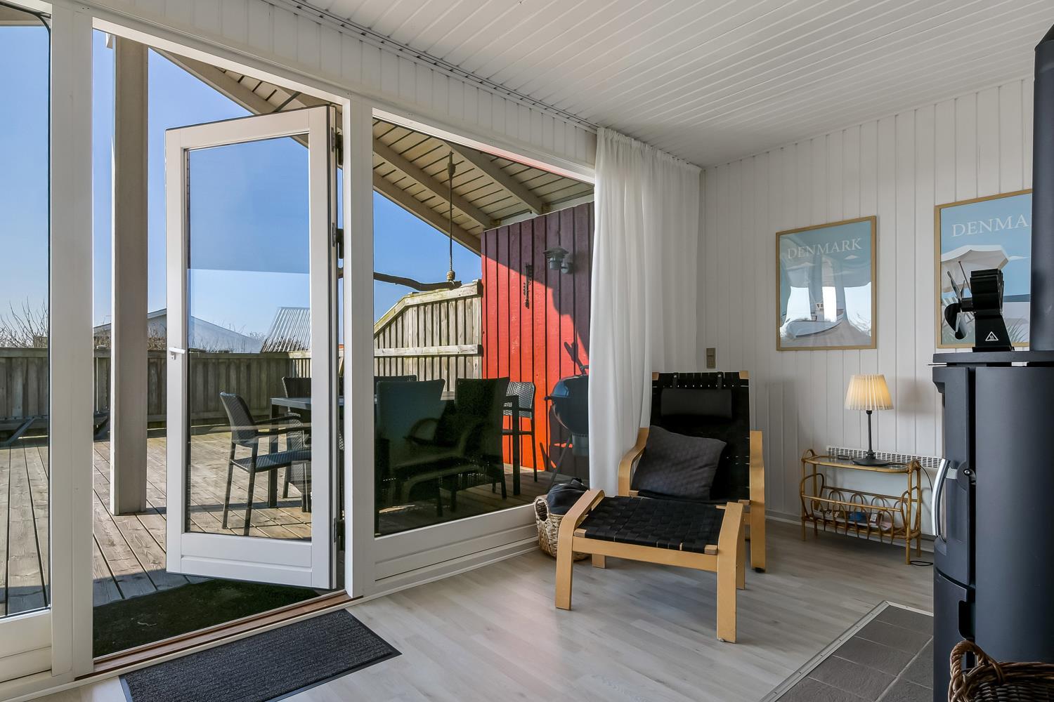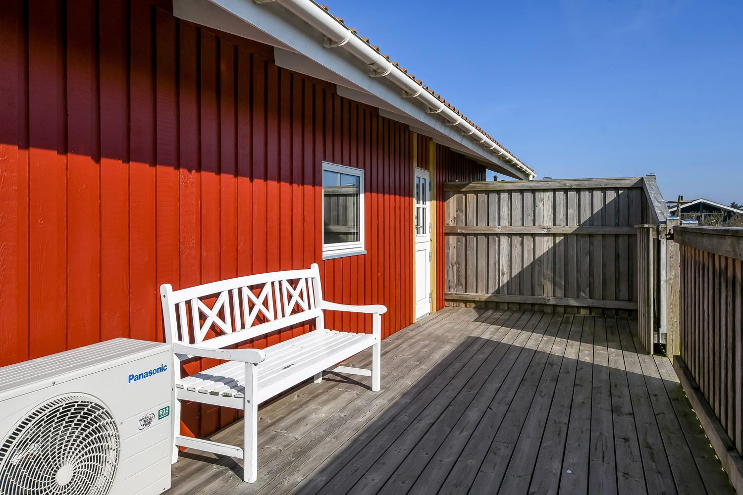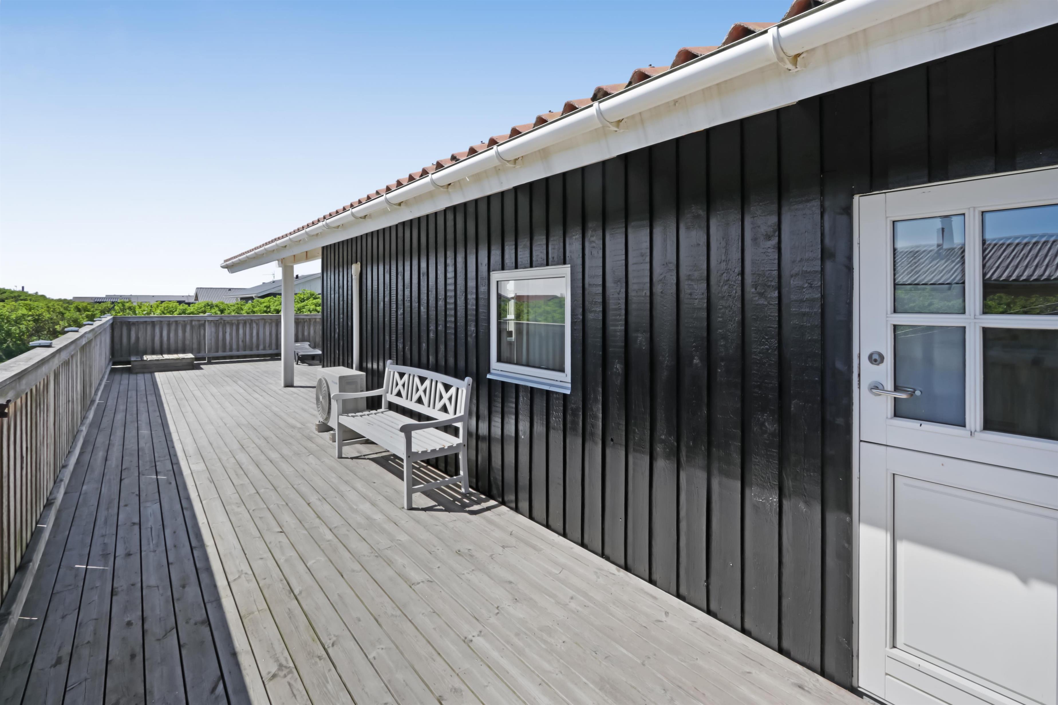 Udgang til flot, stor og delvis overdækket træterrasse med havemøbler, solvogne og grill. Velholdt, indhegnet grund med gynger og sandkasse samt mange muligheder for udendørs aktivitet. Et flot feriehus med god plads og en fantastisk velplejet grund. Medbringes børn og husdyr, er det optimalt, at de kan løbe rundt på den indhegnede gund. Tæt ved restaurant, indkøb samt Vesterhavet. Området er karakteriseret med ekseptionel natur, som udover det brusende Vesterhav også byder på barske klitter og smukke lyngarealer.
