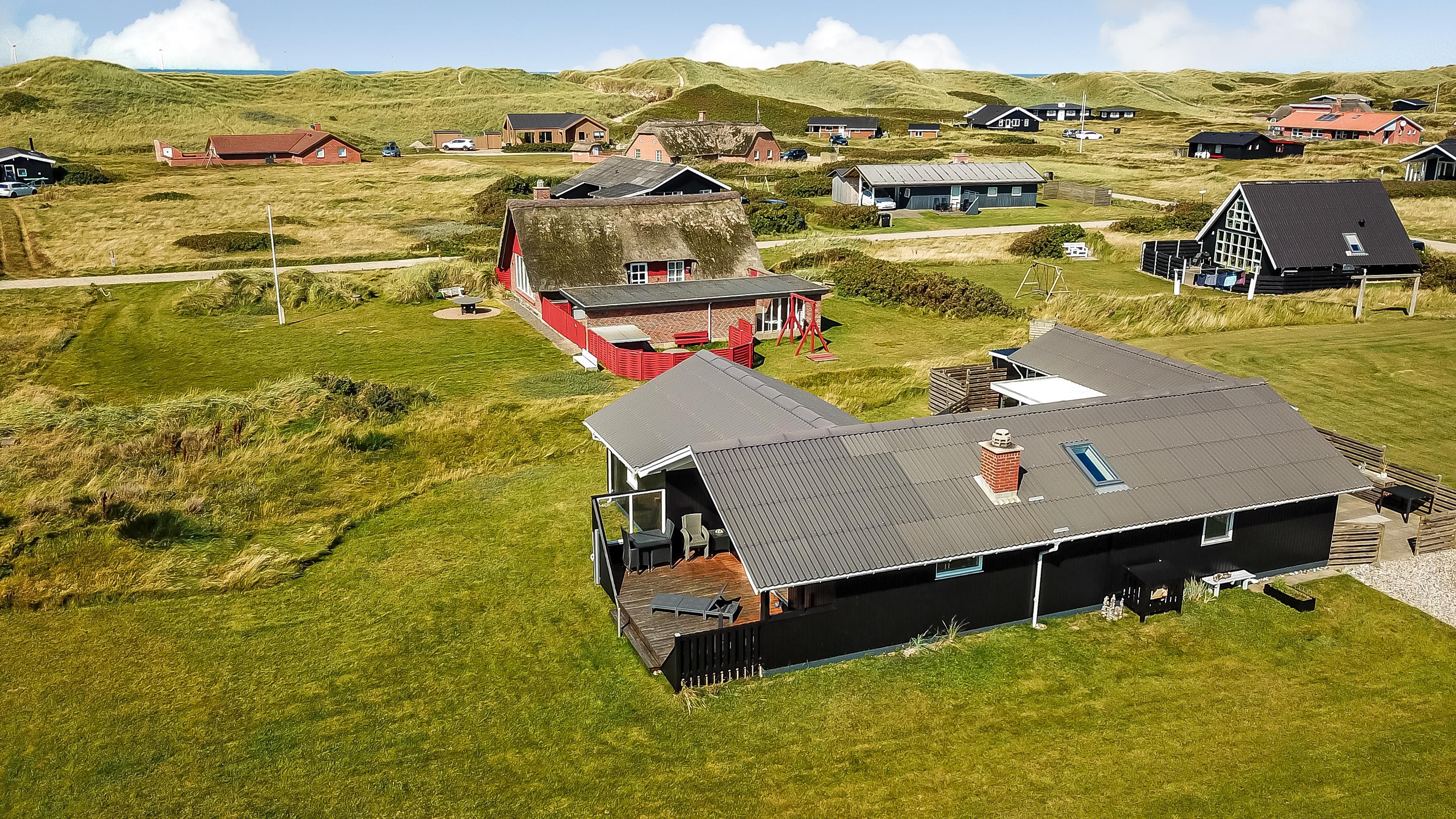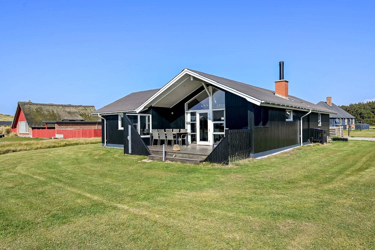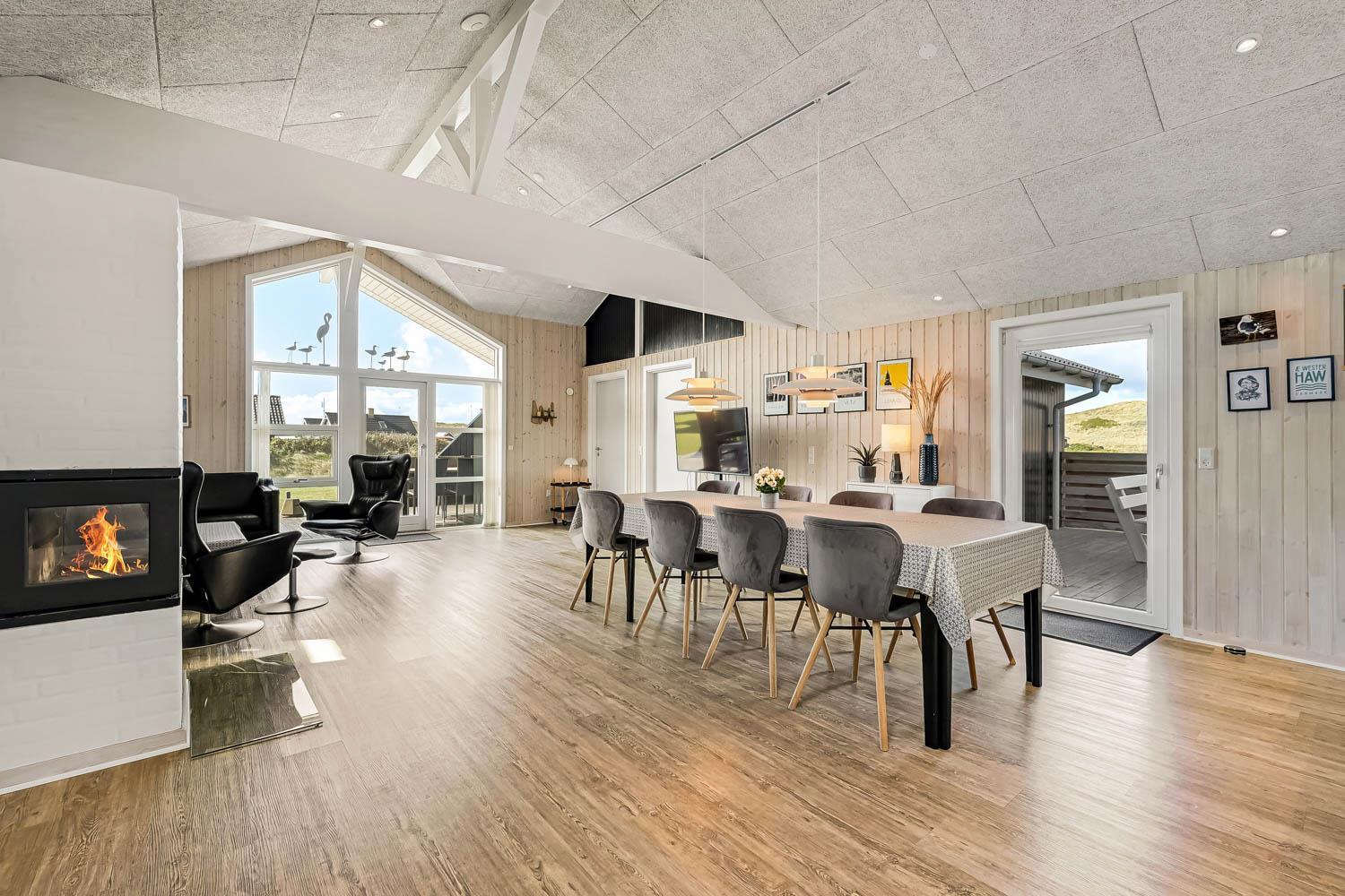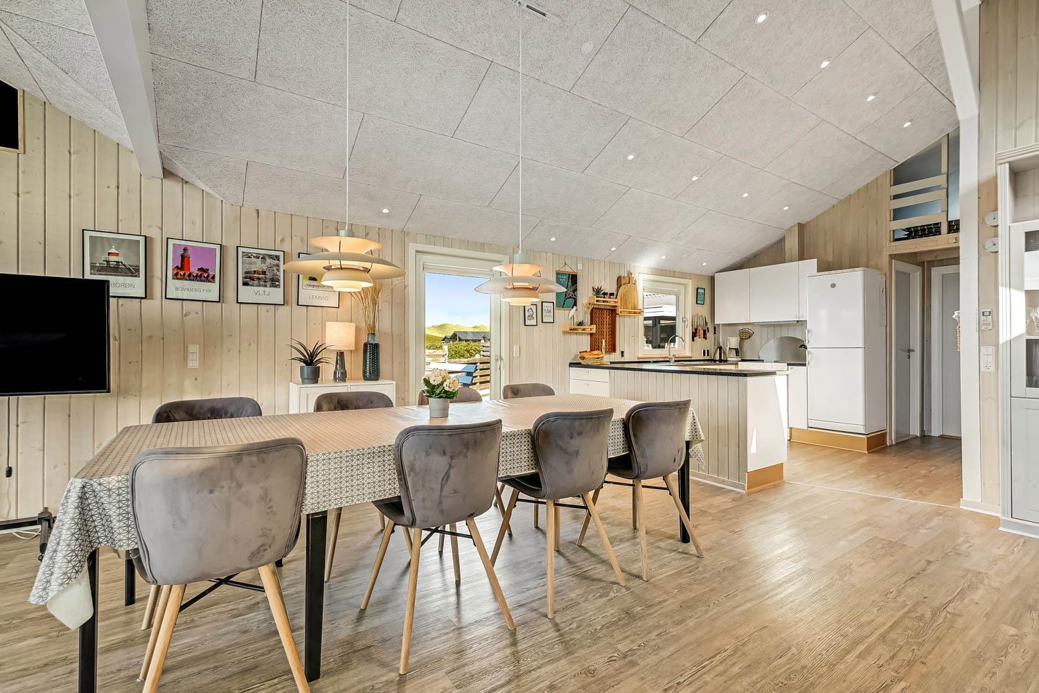 Dette velbeliggende feriehus har 4 soverum (1DS, 1DS, 1DS + 1K). Huset er 120m2 stort og det store lyse opholdsrum er åbent til kip med fantastisk lysindfald fra ovenlysvindue og store vinduespartier, hvorfra der er udsigt til klitterne mod havet. Huset er indrettet med indgang med vaskemaskine, 4 soverum, badeværelse med brus samt åbent og velindrettet køkken i forbindelse med stue. Køkken og stue er et helt fantastisk rum med opgang til stor lys hems. Der er også en hyggelig brændeovn og huset kan desuden opvarmes med varmepumpe og el-radiatorer. Huset er altid rart og varmt uanset vejr og årstid. I det veludstyrede køkken er der kaffemaskine, varmluftsovn, keramiskkogeplade, mikroovn, opvaskemaskine og køleskab med fryser. I stuen er der spisebord, tv-hjørne med sofaarrangement, TV med danske og tyske kanaler samt Chromecast og wi-fi. Max 1 husdyr tilladt.