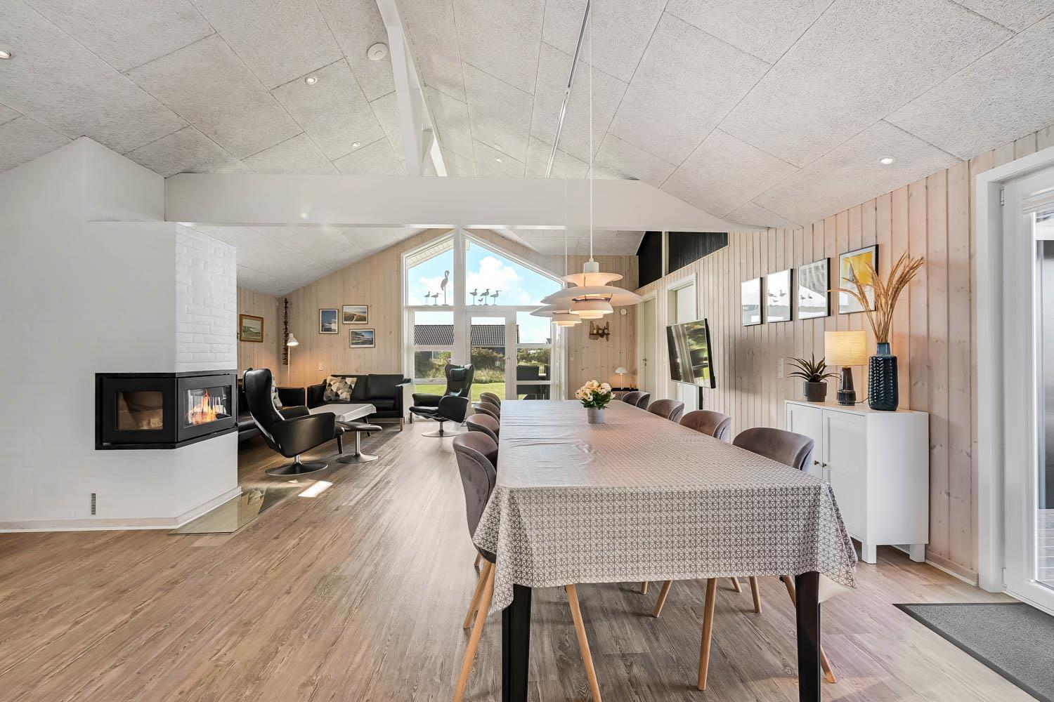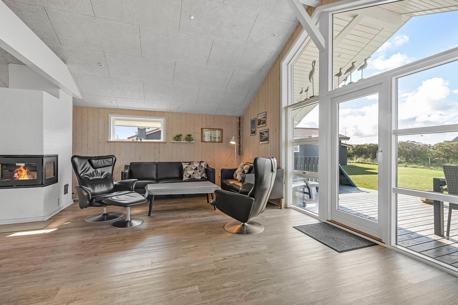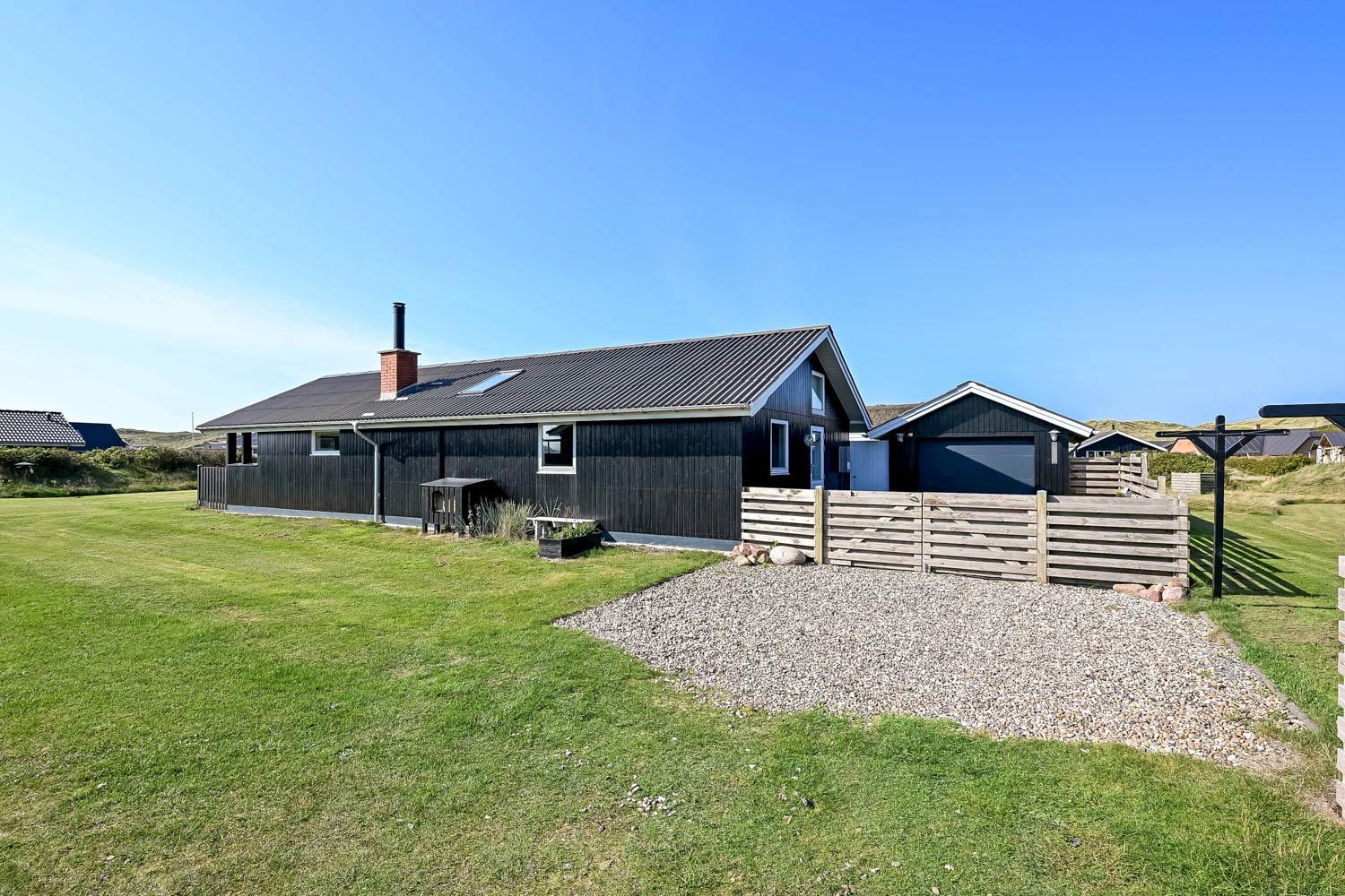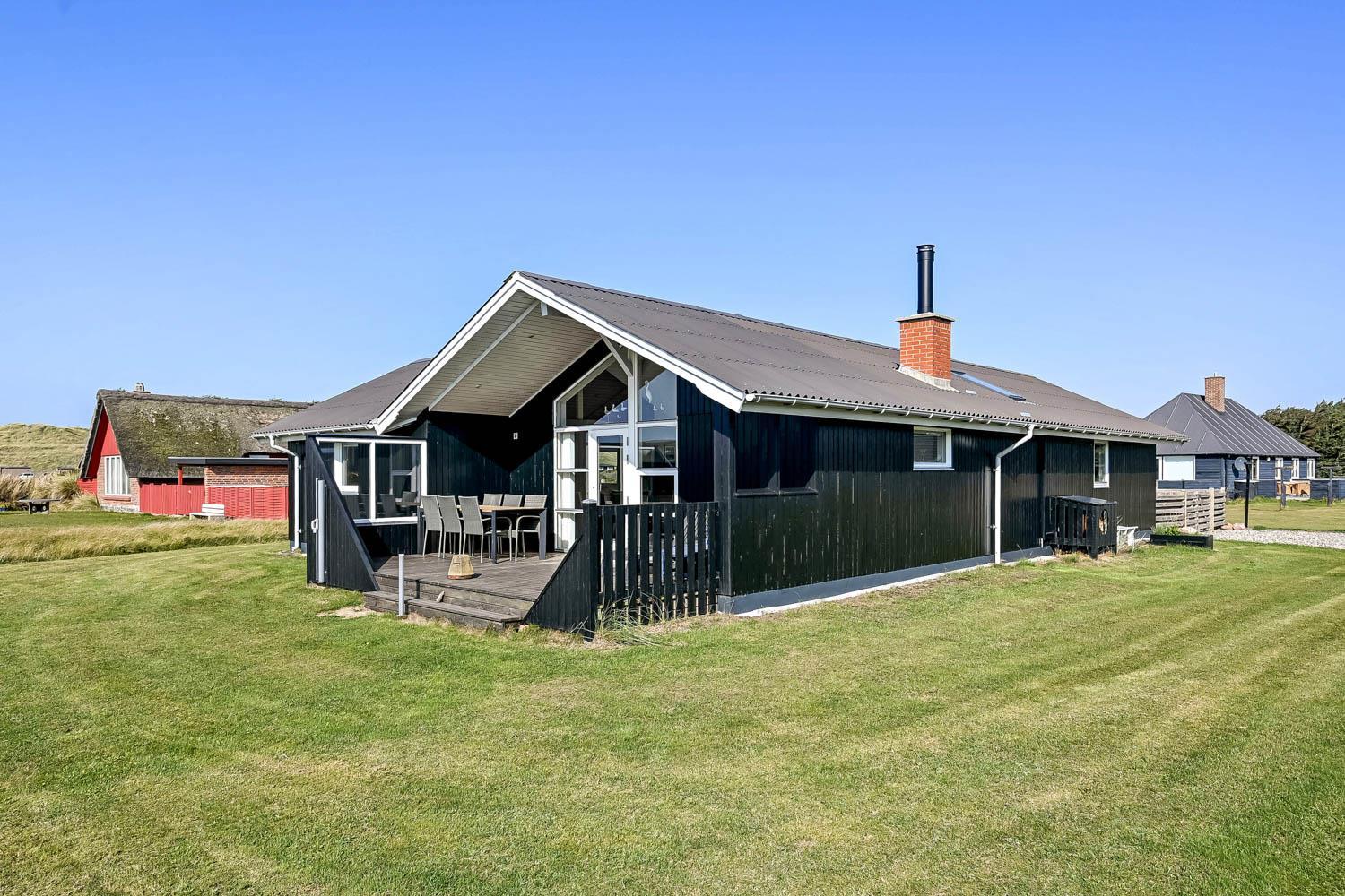 Dette velbeliggende feriehus har 4 soverum (1DS, 1DS, 1DS + 1K). Huset er 120m2 stort og det store lyse opholdsrum er åbent til kip med fantastisk lysindfald fra ovenlysvindue og store vinduespartier, hvorfra der er udsigt til klitterne mod havet. Huset er indrettet med indgang med vaskemaskine, 4 soverum, badeværelse med brus samt åbent og velindrettet køkken i forbindelse med stue. Køkken og stue er et helt fantastisk rum med opgang til stor lys hems. Der er også en hyggelig brændeovn og huset kan desuden opvarmes med varmepumpe og el-radiatorer. Huset er altid rart og varmt uanset vejr og årstid. I det veludstyrede køkken er der kaffemaskine, varmluftsovn, keramiskkogeplade, mikroovn, opvaskemaskine og køleskab med fryser. I stuen er der spisebord, tv-hjørne med sofaarrangement, TV med danske og tyske kanaler samt Chromecast og wi-fi. Max 1 husdyr tilladt.