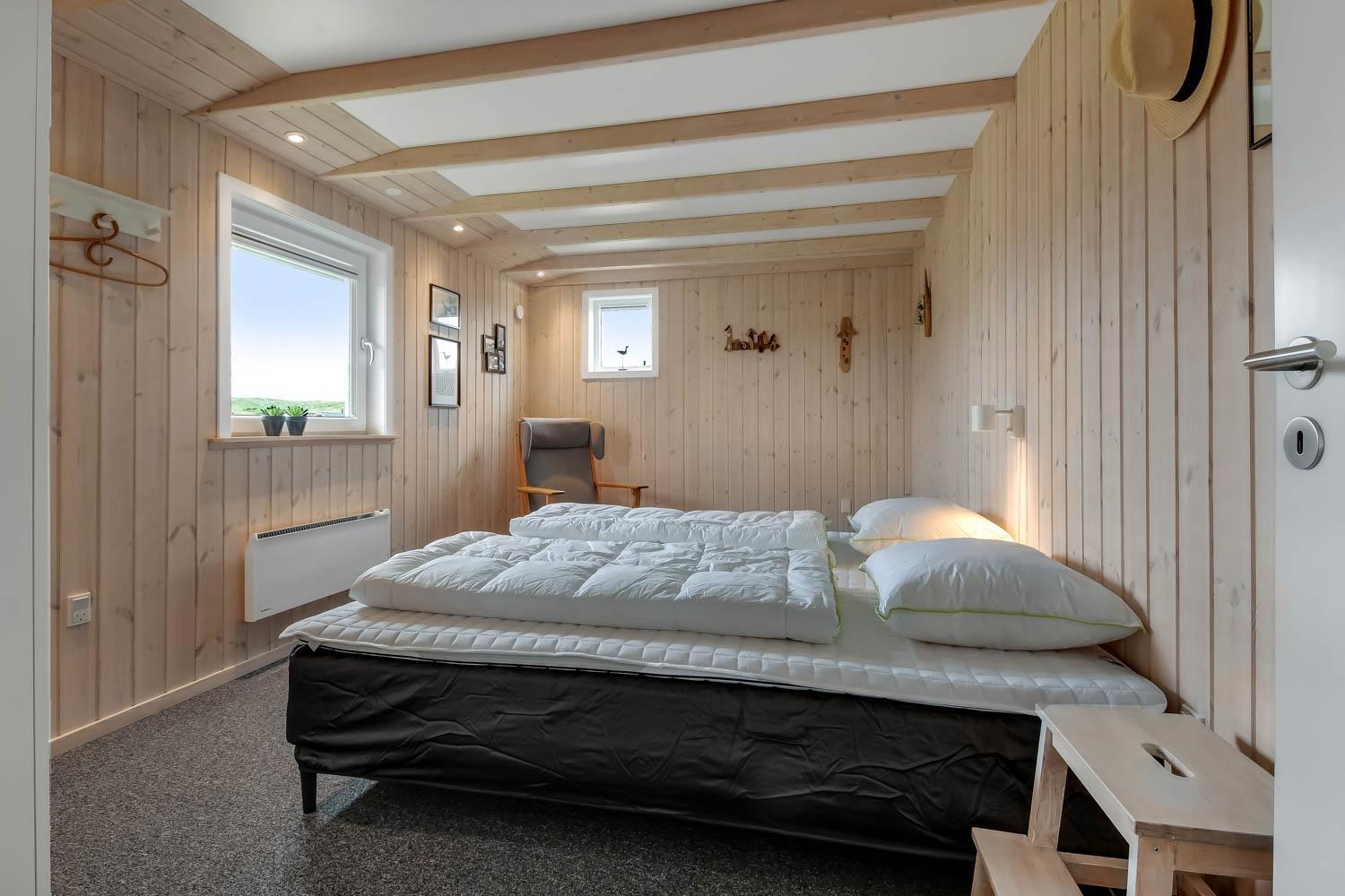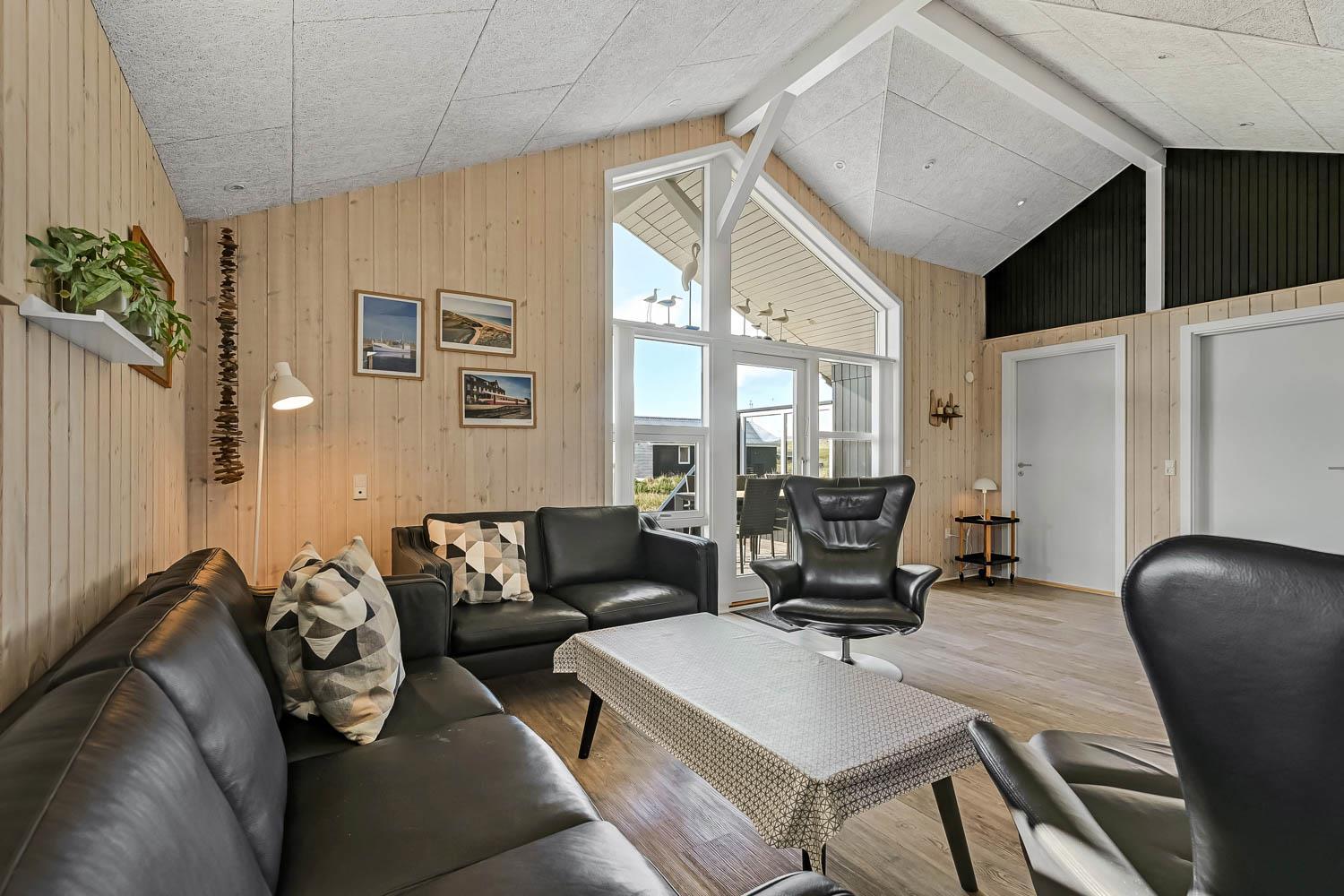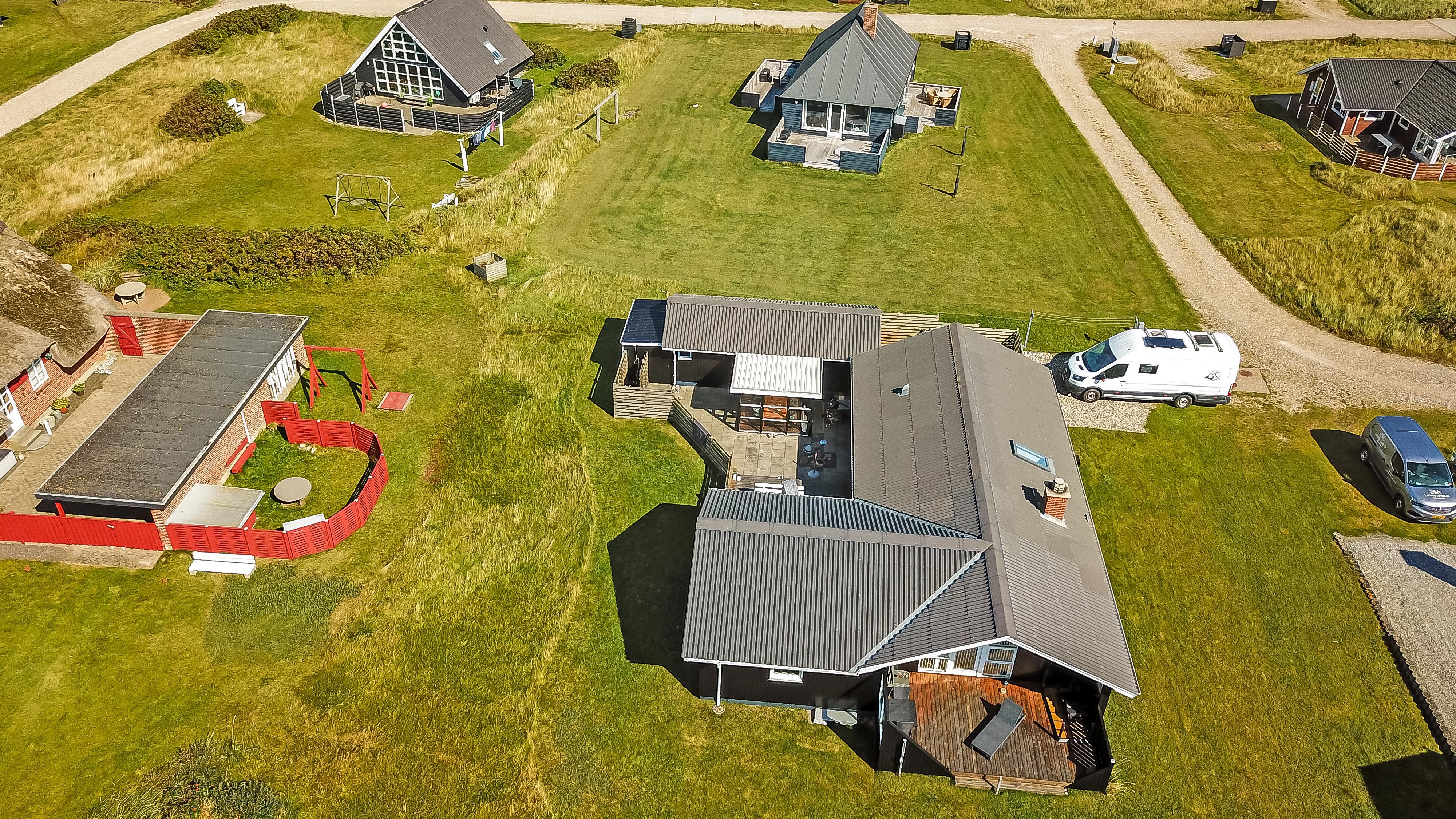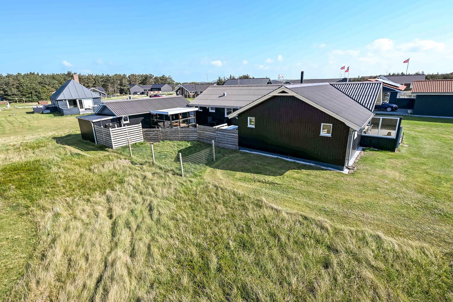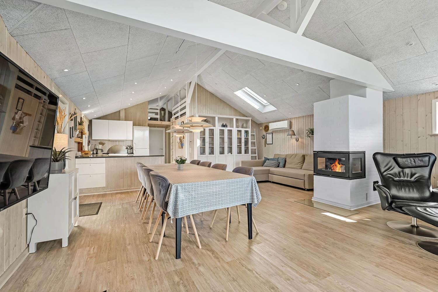 Dette velbeliggende feriehus har 4 soverum (1DS, 1DS, 1DS + 1K). Huset er 120m2 stort og det store lyse opholdsrum er åbent til kip med fantastisk lysindfald fra ovenlysvindue og store vinduespartier, hvorfra der er udsigt til klitterne mod havet. Huset er indrettet med indgang med vaskemaskine, 4 soverum, badeværelse med brus samt åbent og velindrettet køkken i forbindelse med stue. Køkken og stue er et helt fantastisk rum med opgang til stor lys hems. Der er også en hyggelig brændeovn og huset kan desuden opvarmes med varmepumpe og el-radiatorer. Huset er altid rart og varmt uanset vejr og årstid. I det veludstyrede køkken er der kaffemaskine, varmluftsovn, keramiskkogeplade, mikroovn, opvaskemaskine og køleskab med fryser. I stuen er der spisebord, tv-hjørne med sofaarrangement, TV med danske og tyske kanaler samt Chromecast og wi-fi. Max 1 husdyr tilladt.