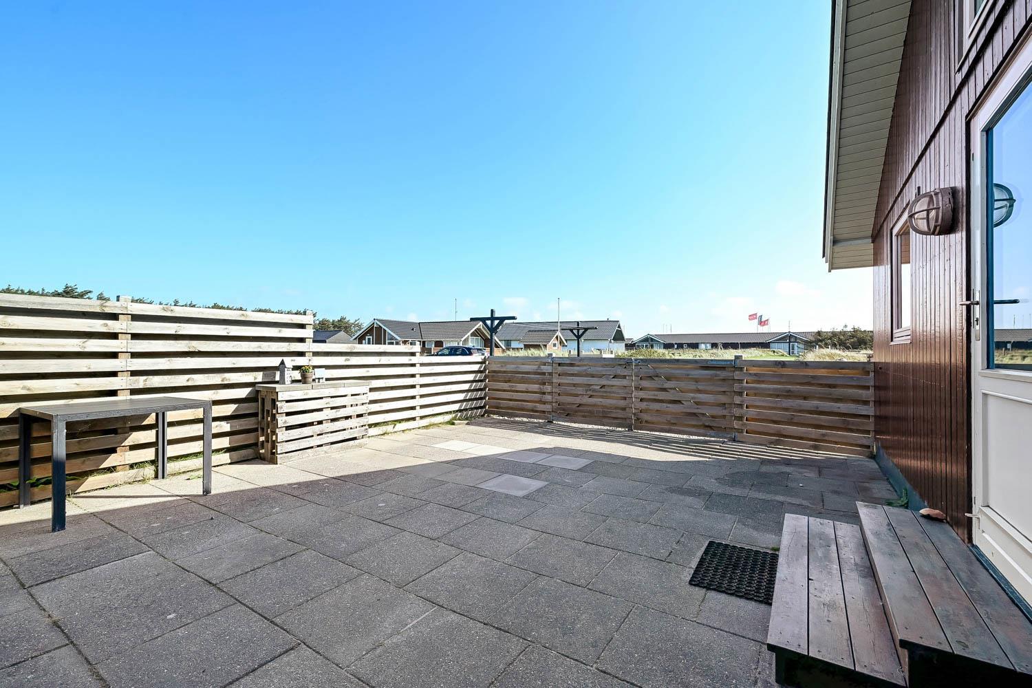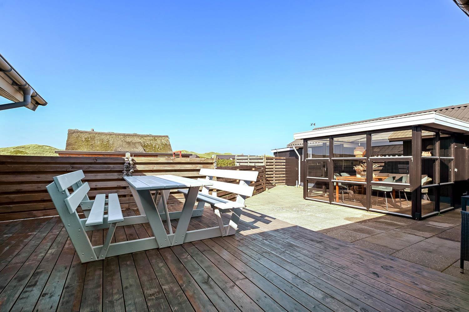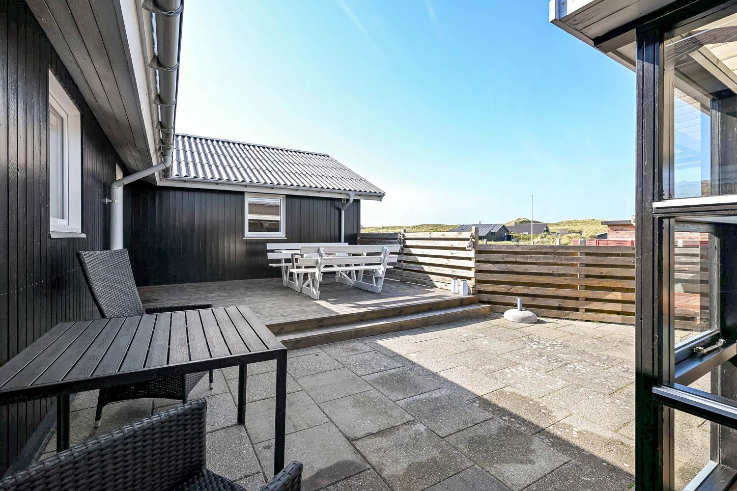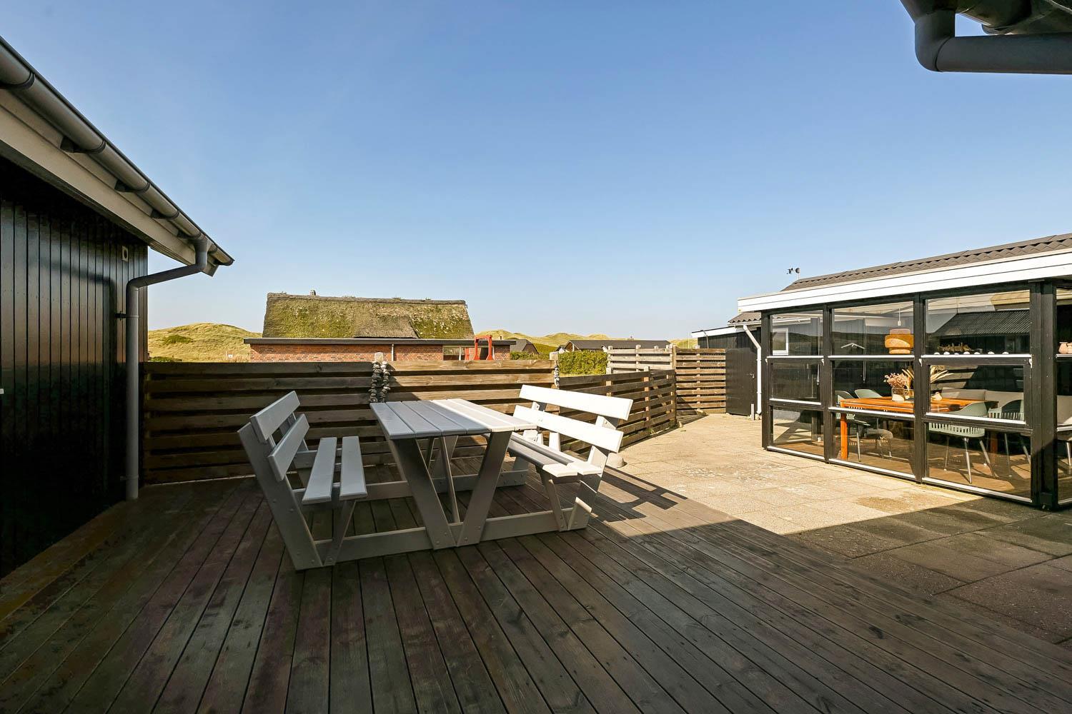 Der er fra stuen og fra entréen udgang til husets indhegnet terrasser mod både syd og vest og mulighed for at nyde solen hele dagen, desuden er der omkring det vestvendte terasseanlæg adgang til ude-bruser med koldt vand, sauna og fantastisk havestue med spiseplads og fantstisk udsigt til de høje klitter ved Vesterhavet. Grill og havemøbler kan rykkes rundt efter behov. Der er mulighed for opladning af el-bil i husets garage. Der er en hundegård.