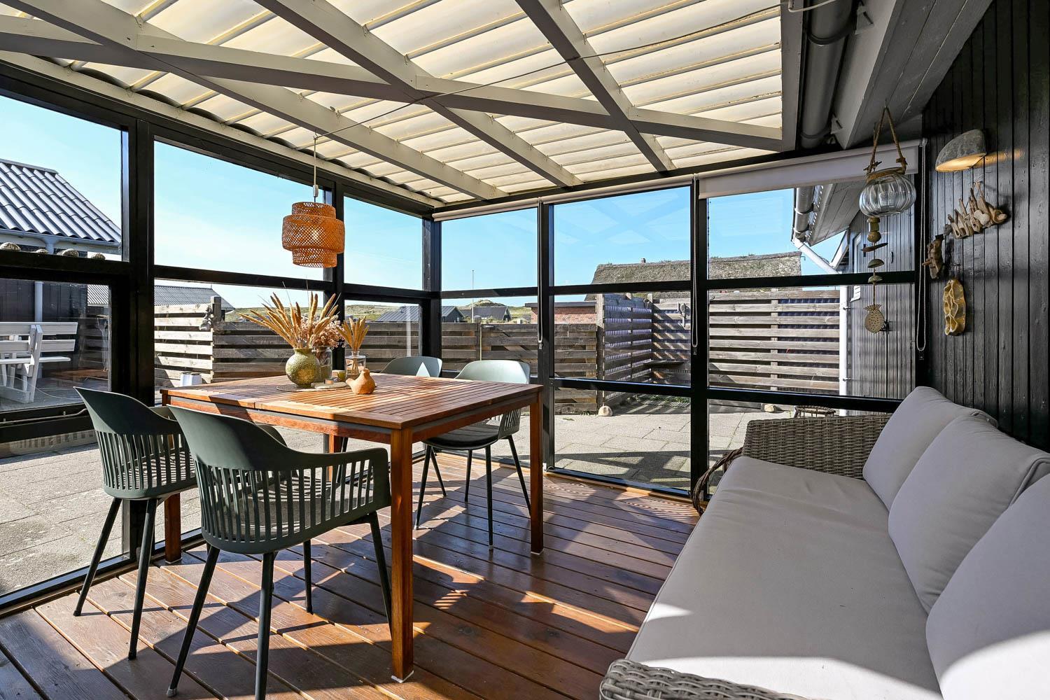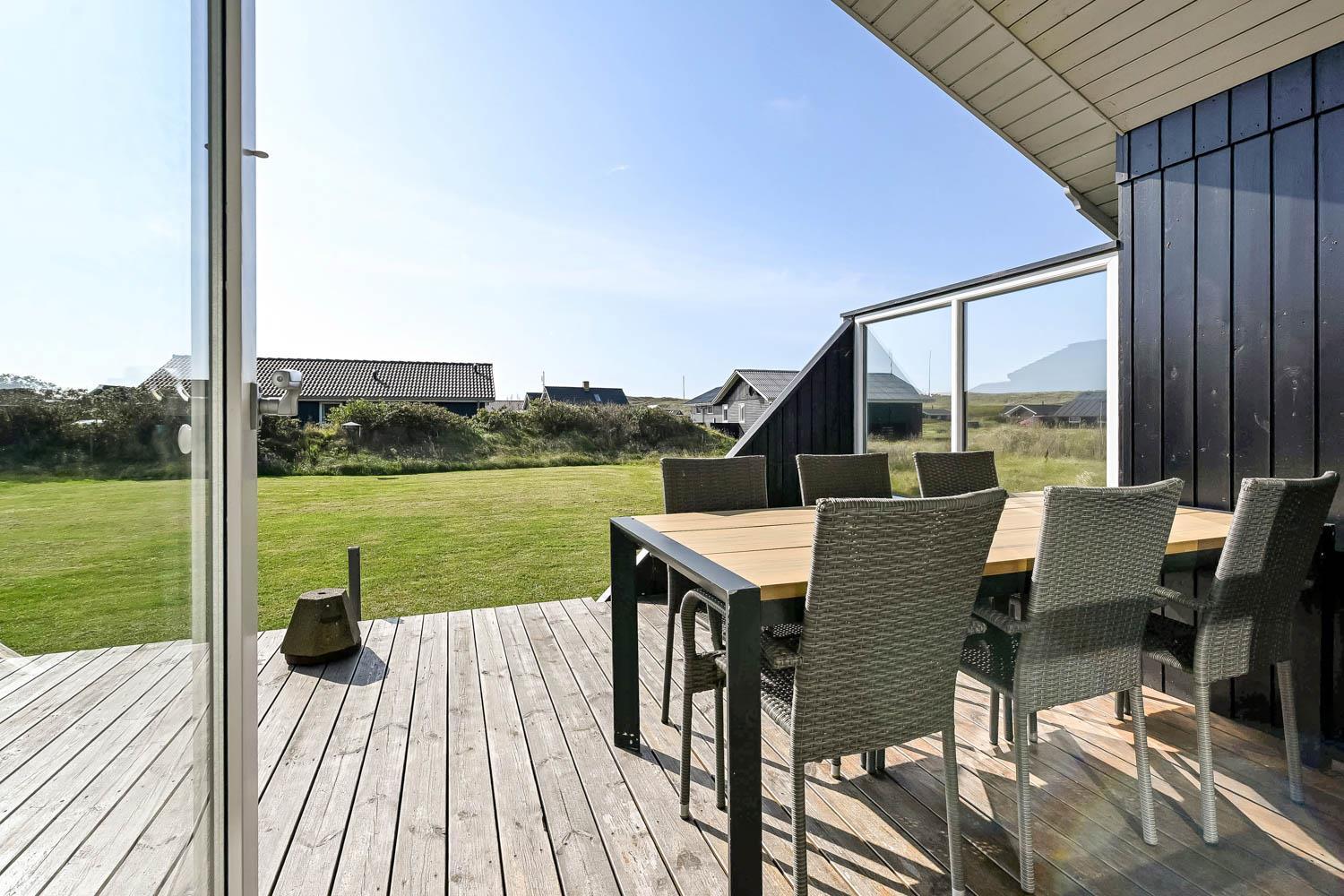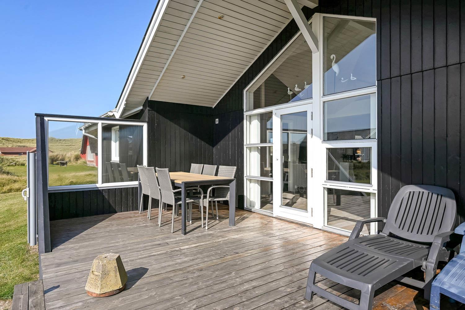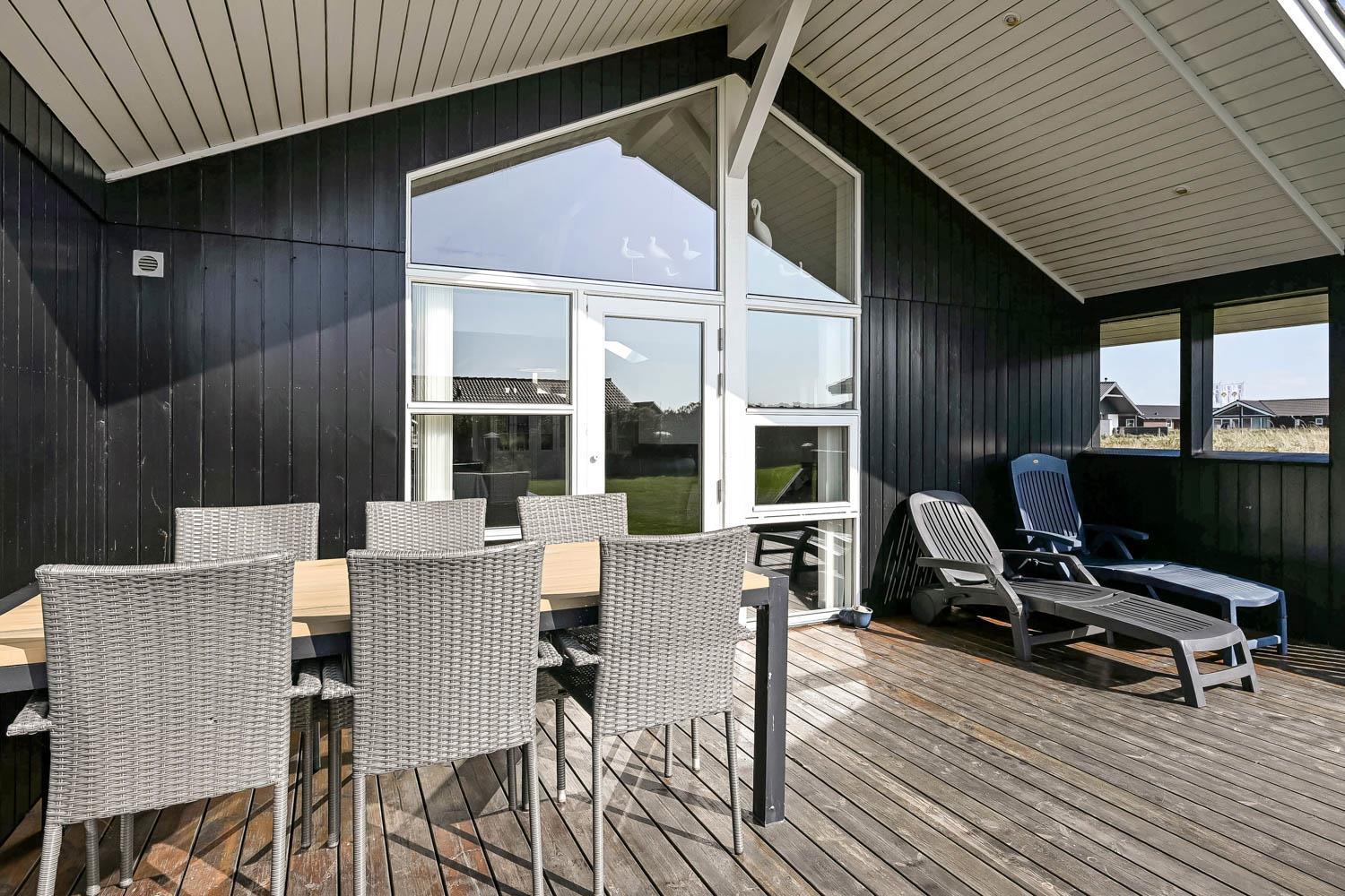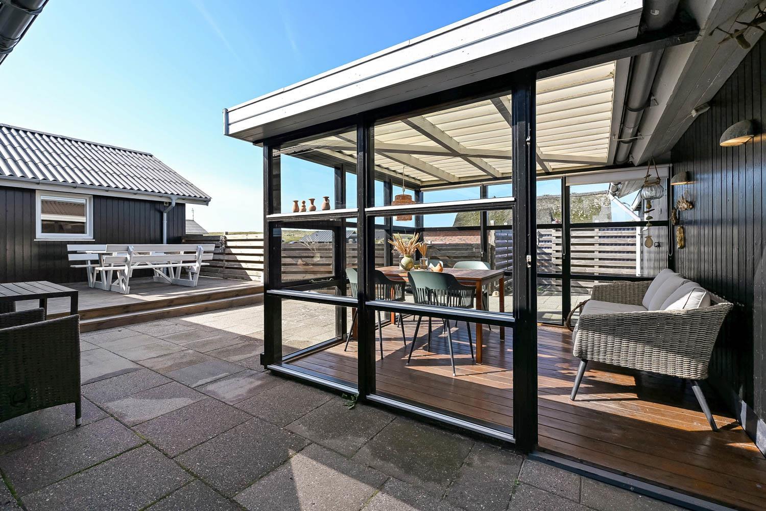 Der er fra stuen og fra entréen udgang til husets indhegnet terrasser mod både syd og vest og mulighed for at nyde solen hele dagen, desuden er der omkring det vestvendte terasseanlæg adgang til ude-bruser med koldt vand, sauna og fantastisk havestue med spiseplads og fantstisk udsigt til de høje klitter ved Vesterhavet. Grill og havemøbler kan rykkes rundt efter behov. Der er mulighed for opladning af el-bil i husets garage. Der er en hundegård.