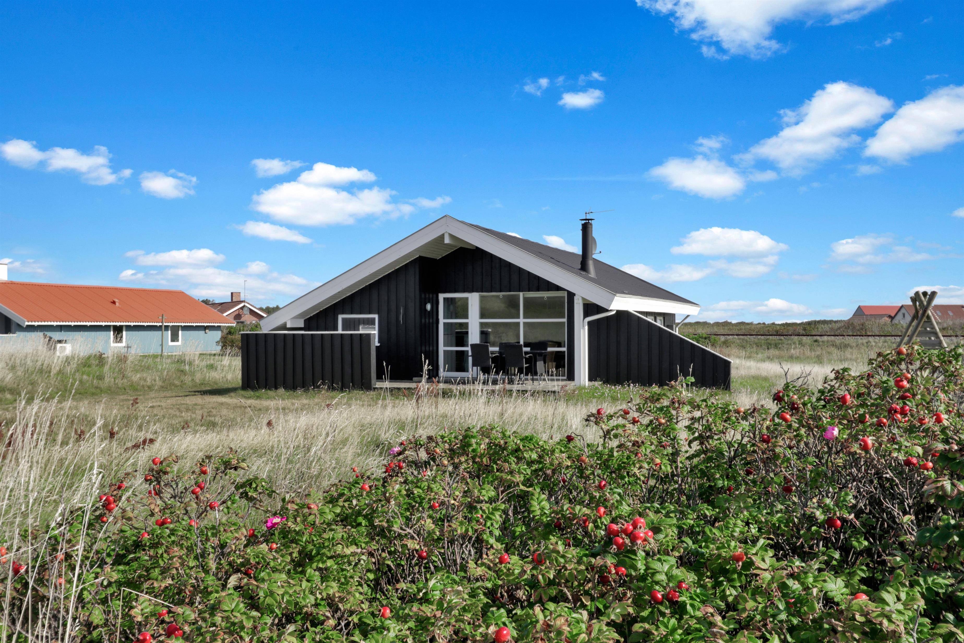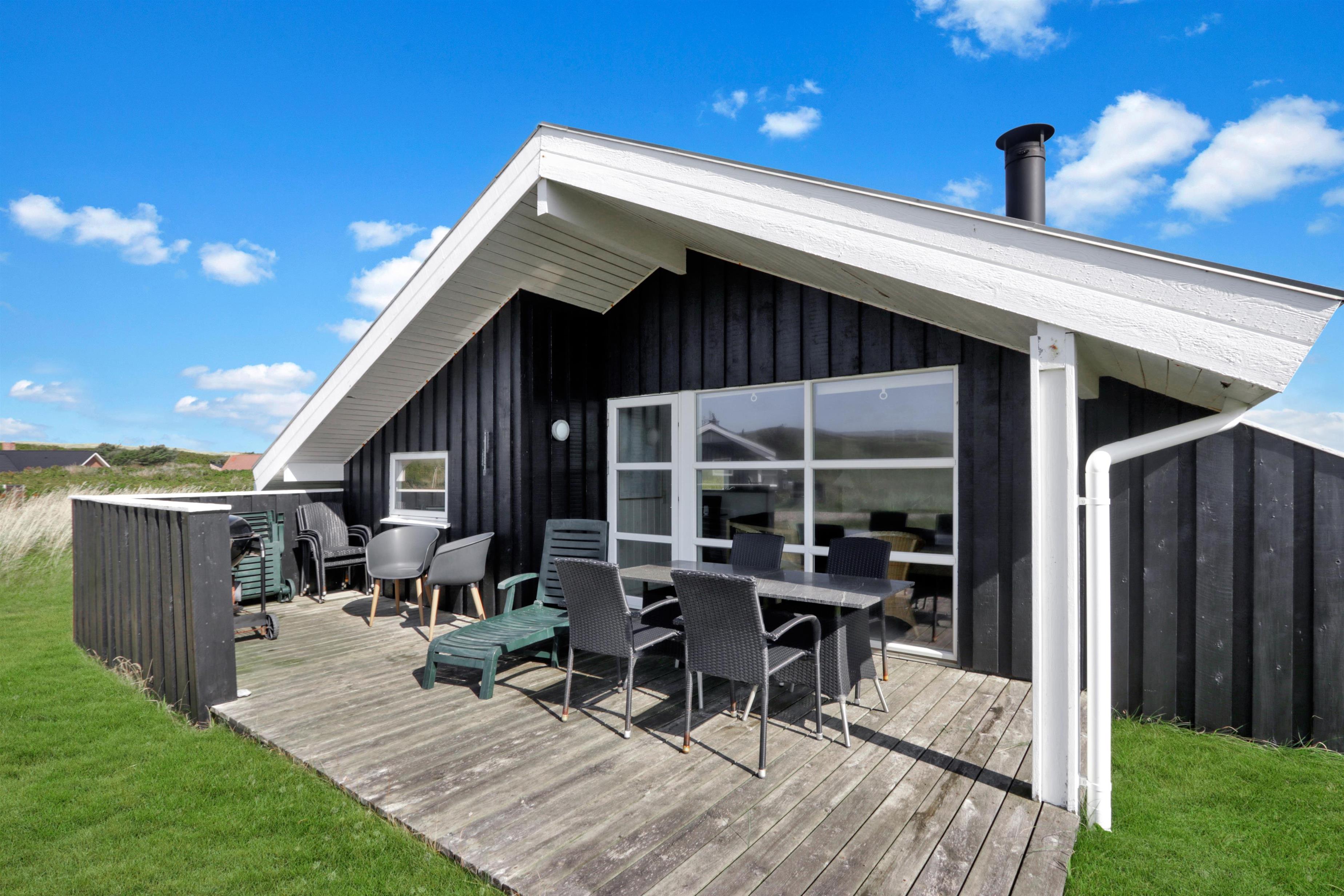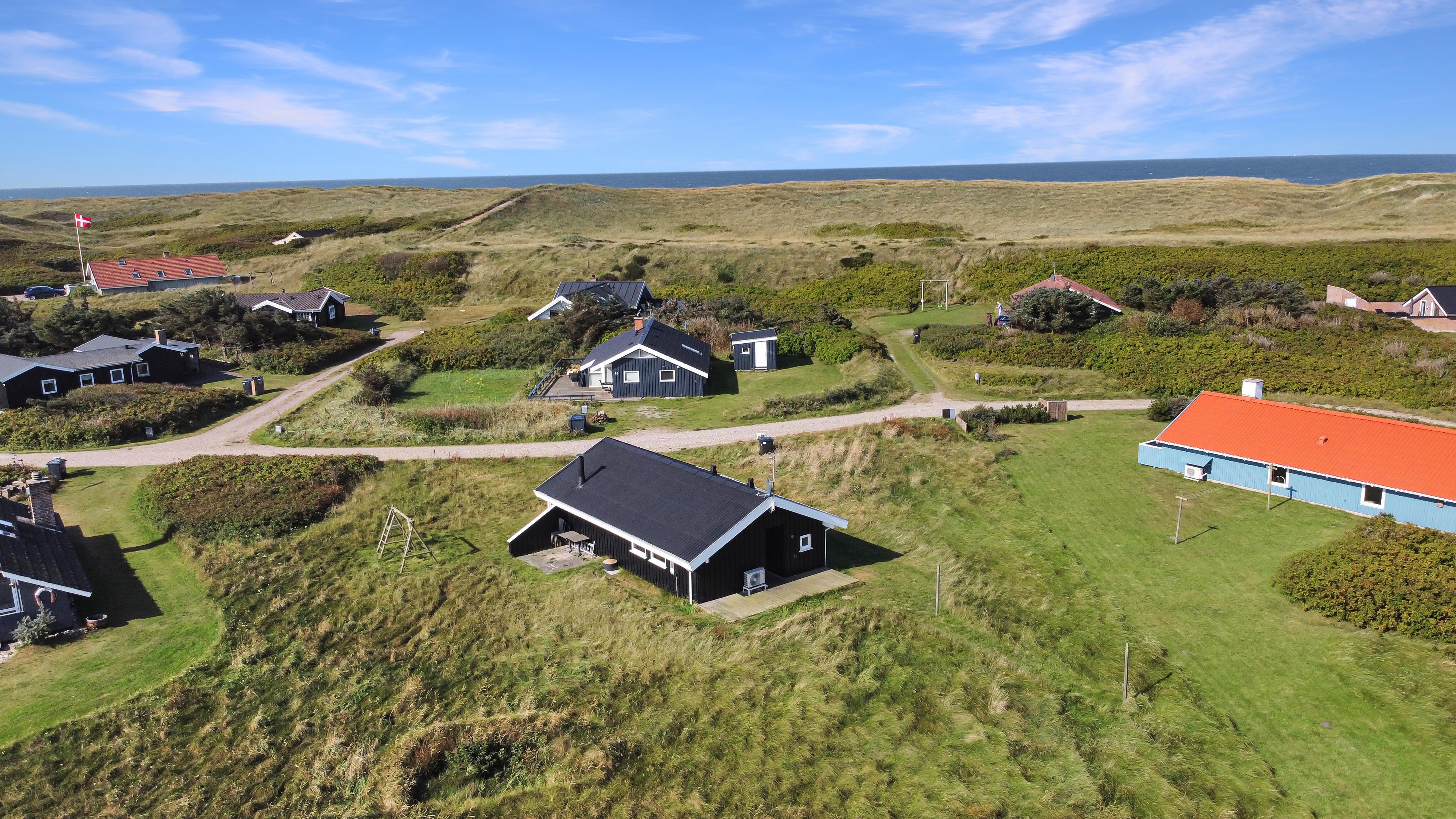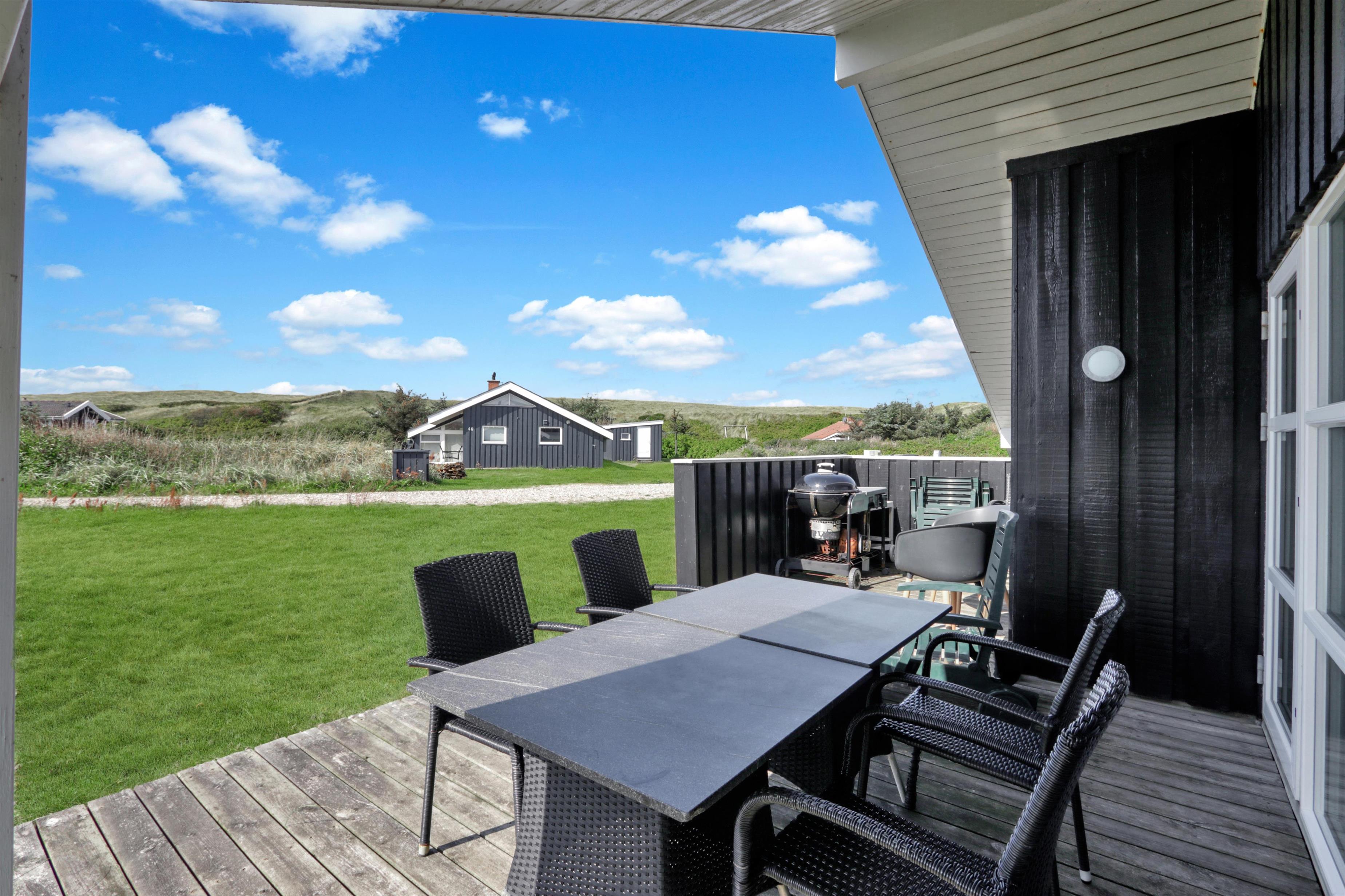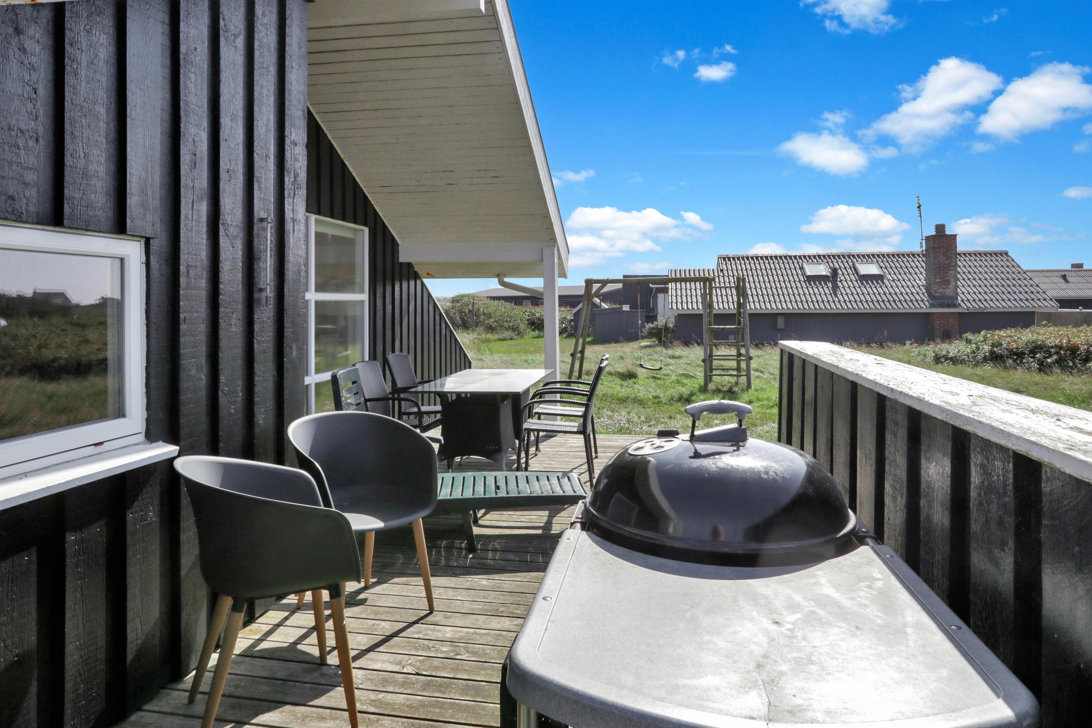 Sommerhuset er beliggende på en meget stille og rolig, blind vej, hvor det brusende Vesterhav kan høres fra de tre forskellige terrasser, som er placeret, så man får sol stort set hele dagen og aftenen med. Der er gode muligheder for læ, ligeledes på flere sider af huset. Der er komfortable havemøbler, samt to solvogne, grill og gyngestativ til børnene. Ligeledes er man ikke langt til cykelstien langs Strandvejen hvorfra man kan udnytte områdets mange cykelmuligheder. Benyt endelig også stranden til badning, drageflyvning, byg et sandslot eller gå en lang tur og få ro i sjælen.