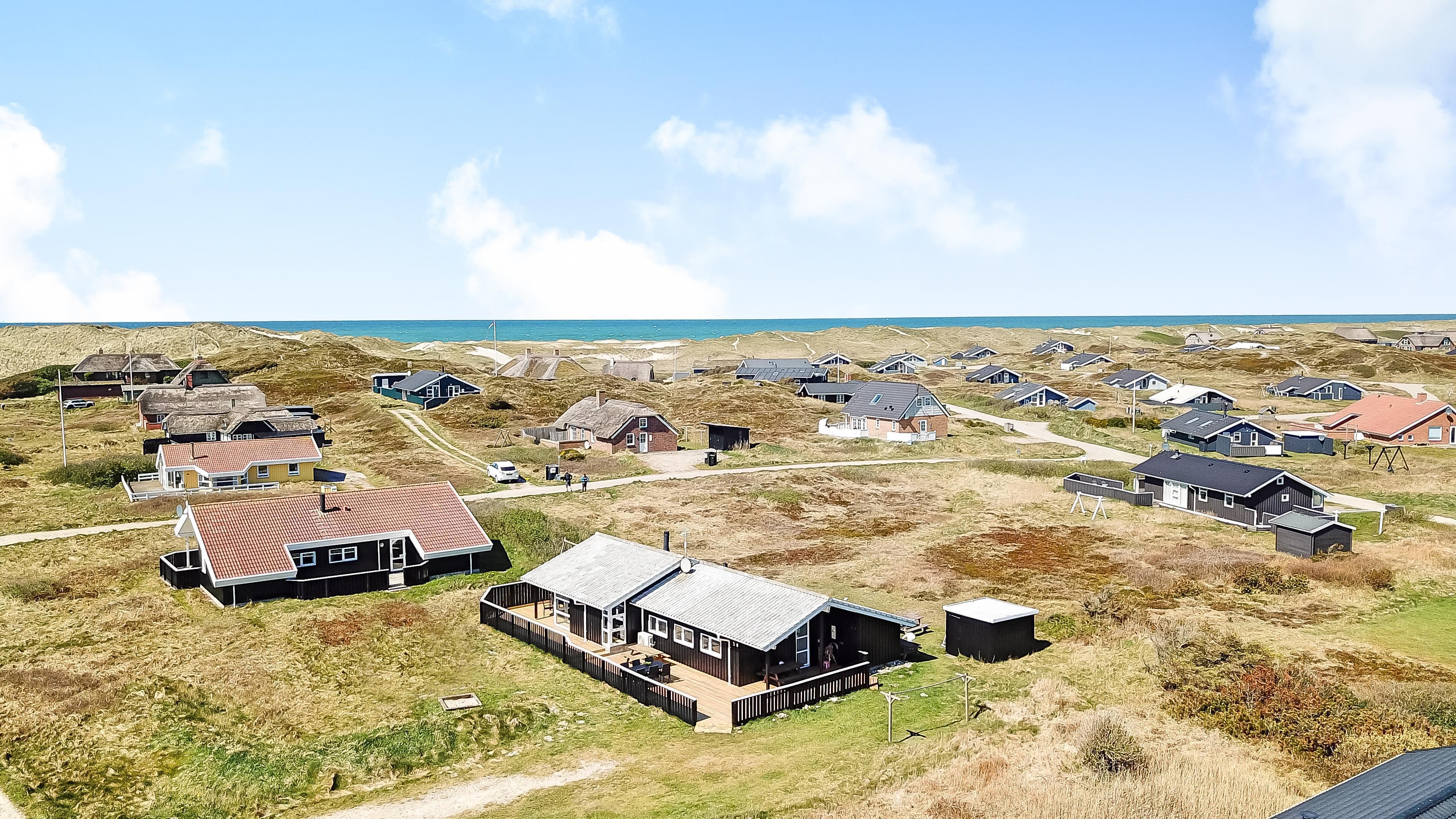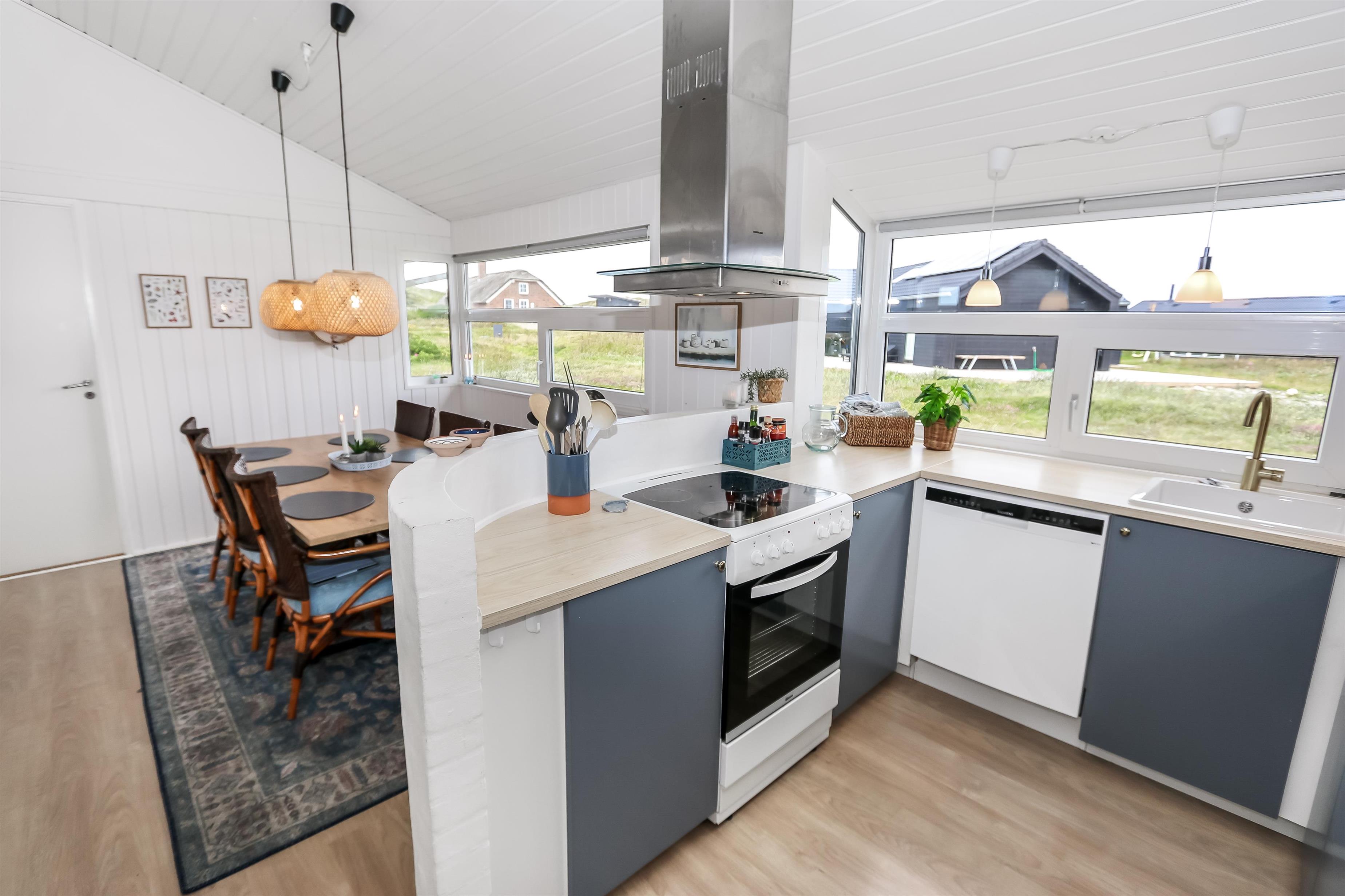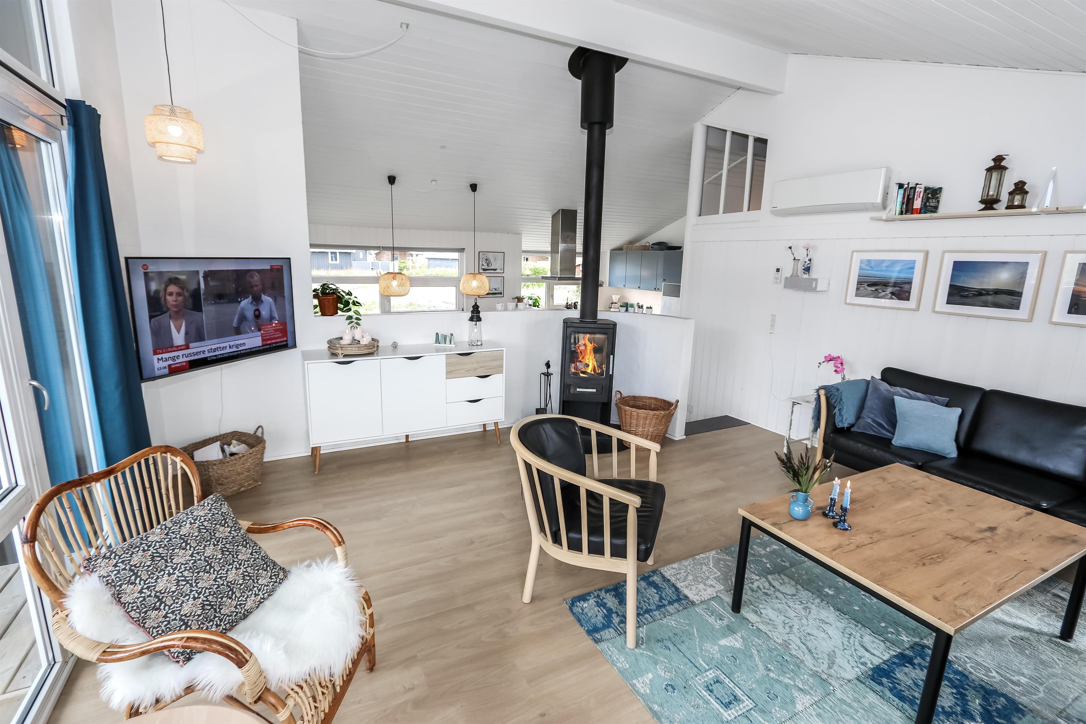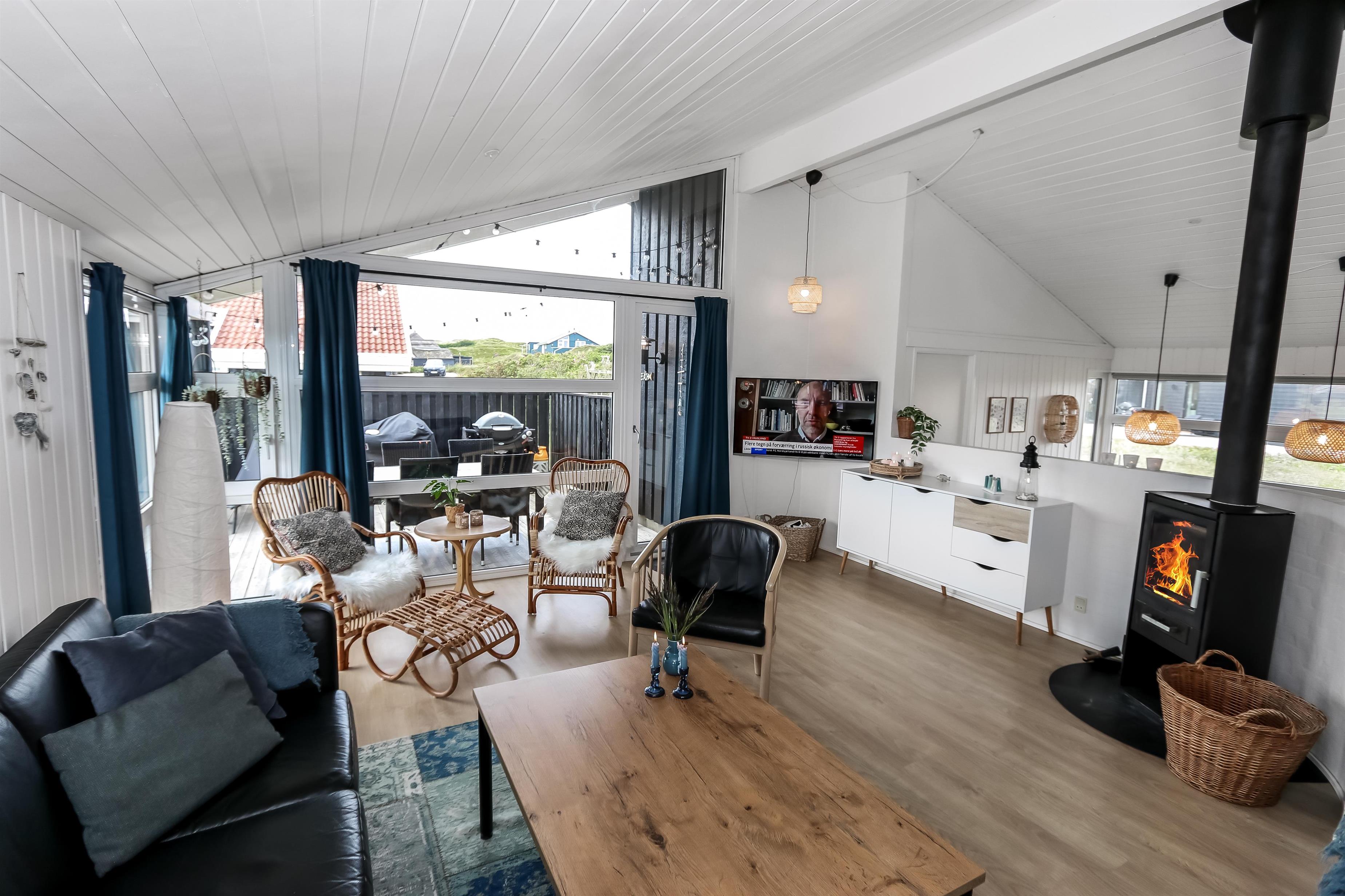 Rummeligt, komfortabelt indrettet feriehus i træ. Opholdsstuen er åben til kip og store vinduespartier, giver et rigtig godt lys inde i huset. Opholdsstuen er opdelt i spisestue, som er kombineret med det åbne køkkenhjørne. Opholdsstuen med , nye lækre lædermøbler, spisebord Smart-TV med danske og tyske programmer samt mulighed for streaming af TV / radio / Apps, så har du en mobiltelefon eller et andet device med kan du streame hvad du nu har abonnement. Nyd udsigten over klitområdet og slap af foran den knitrende brændeovn som sammen med varmepumpen hjælper med at reducere udgiften til varmeregningen. Praktiske trægulve i hele huset – med gulvvarme i køkken og entré. 4 gode soverum med gode nye senge (1DS, 1DS, 1DS, 1DS samt en hems med 2 ekstra sovepladser). Til de små gæster er der barneseng og barnestol til rådighed. Nyt køkkenhjørne med alt i service / køkkengrej samt komfur med glaskeramiske kogeplader, emhætte, opvaskemaskine, køleskab med fryseboks og mikroovn. Huset råder over 2 badeværelser begge med klinkegulv med gulvvarme, toilet, håndvask og bruser. Det ene badeværelse er med spabad og direkte adgang til saunaen, vaskemaskine og tørretumbler. Ikke ryger hus. 2 husdyr er tilladt. Har man el-bil eller en Plug-In hybrid, så er der ved Ladeboks til Type 2 ladestik.