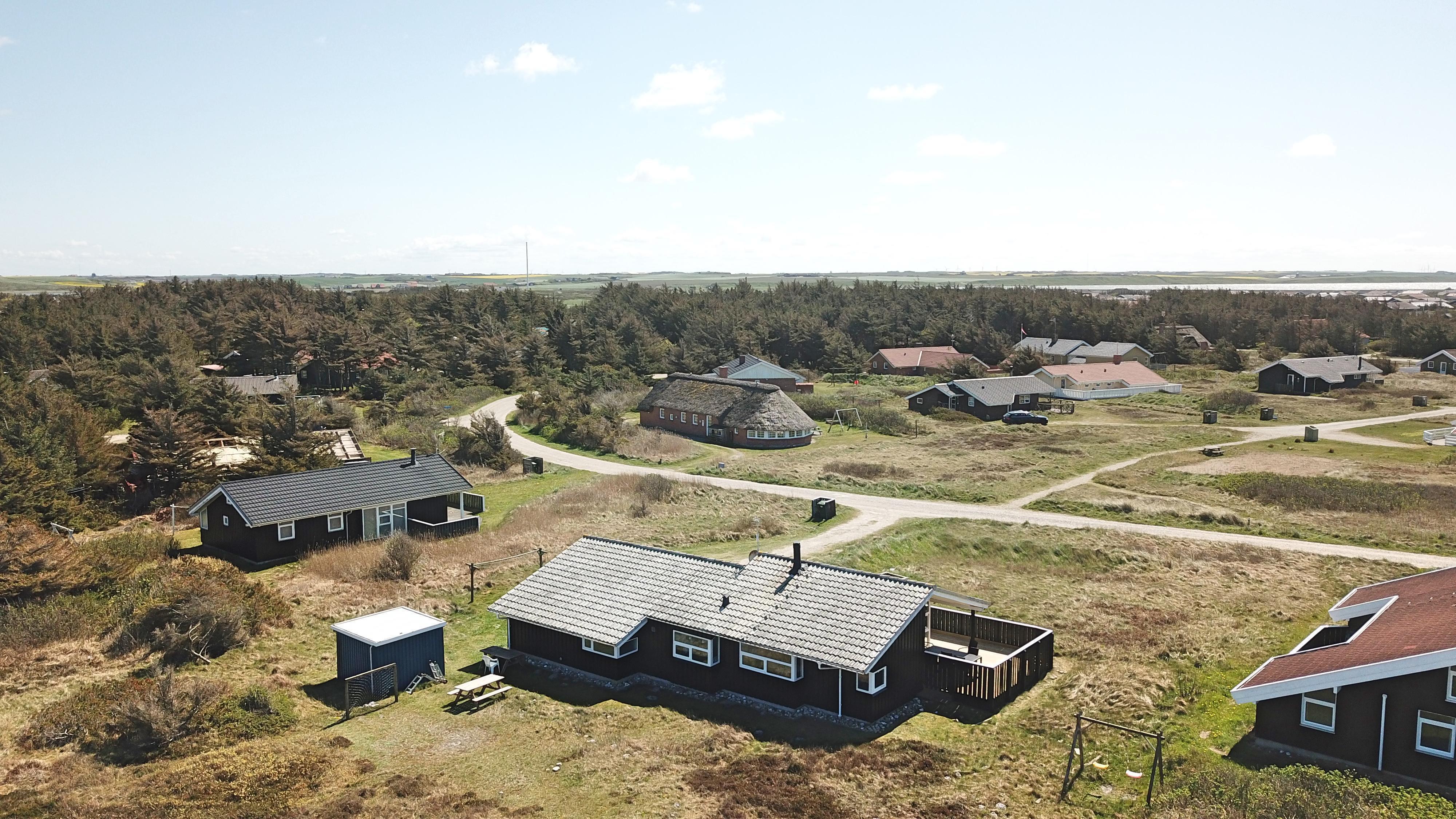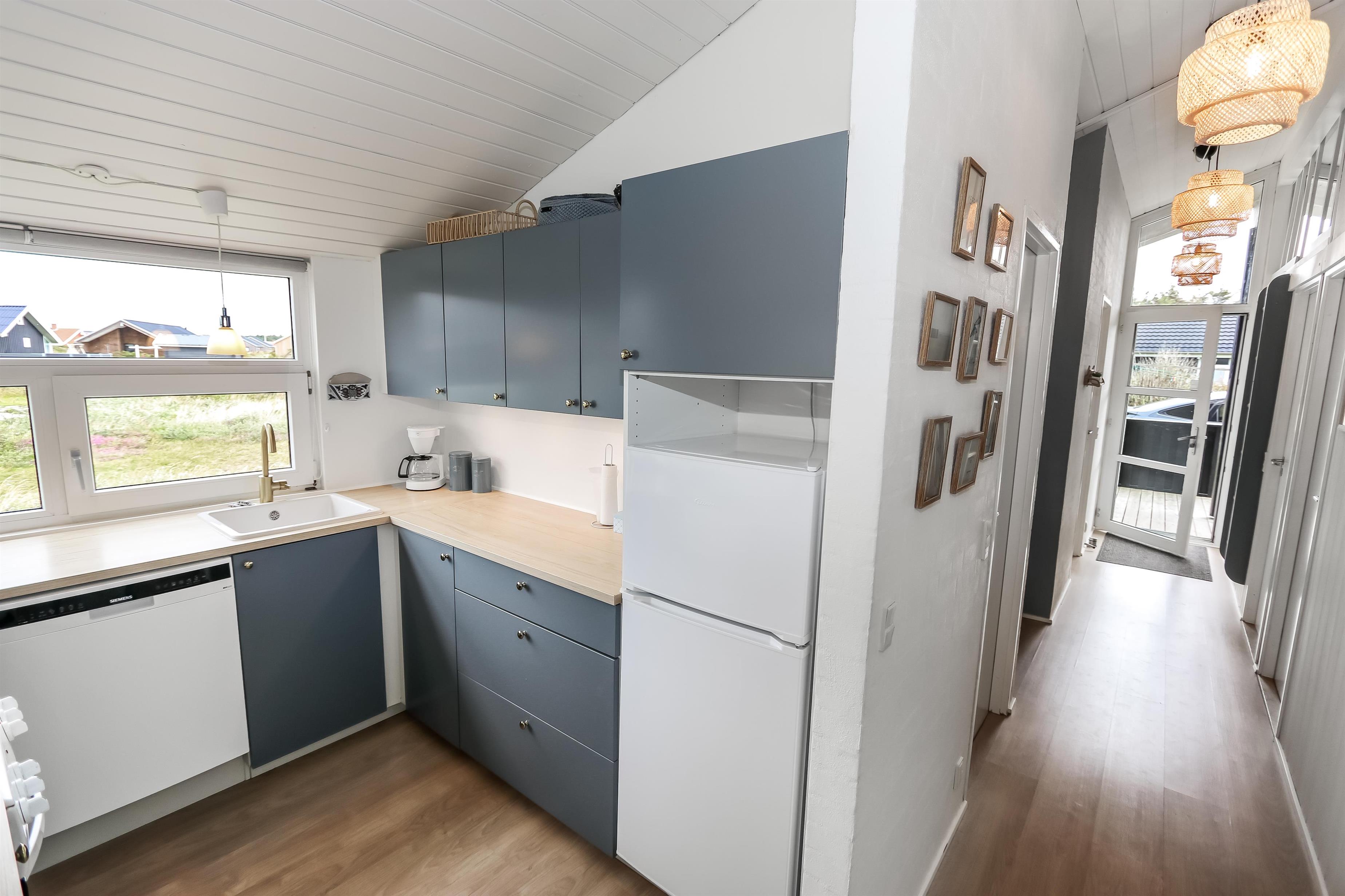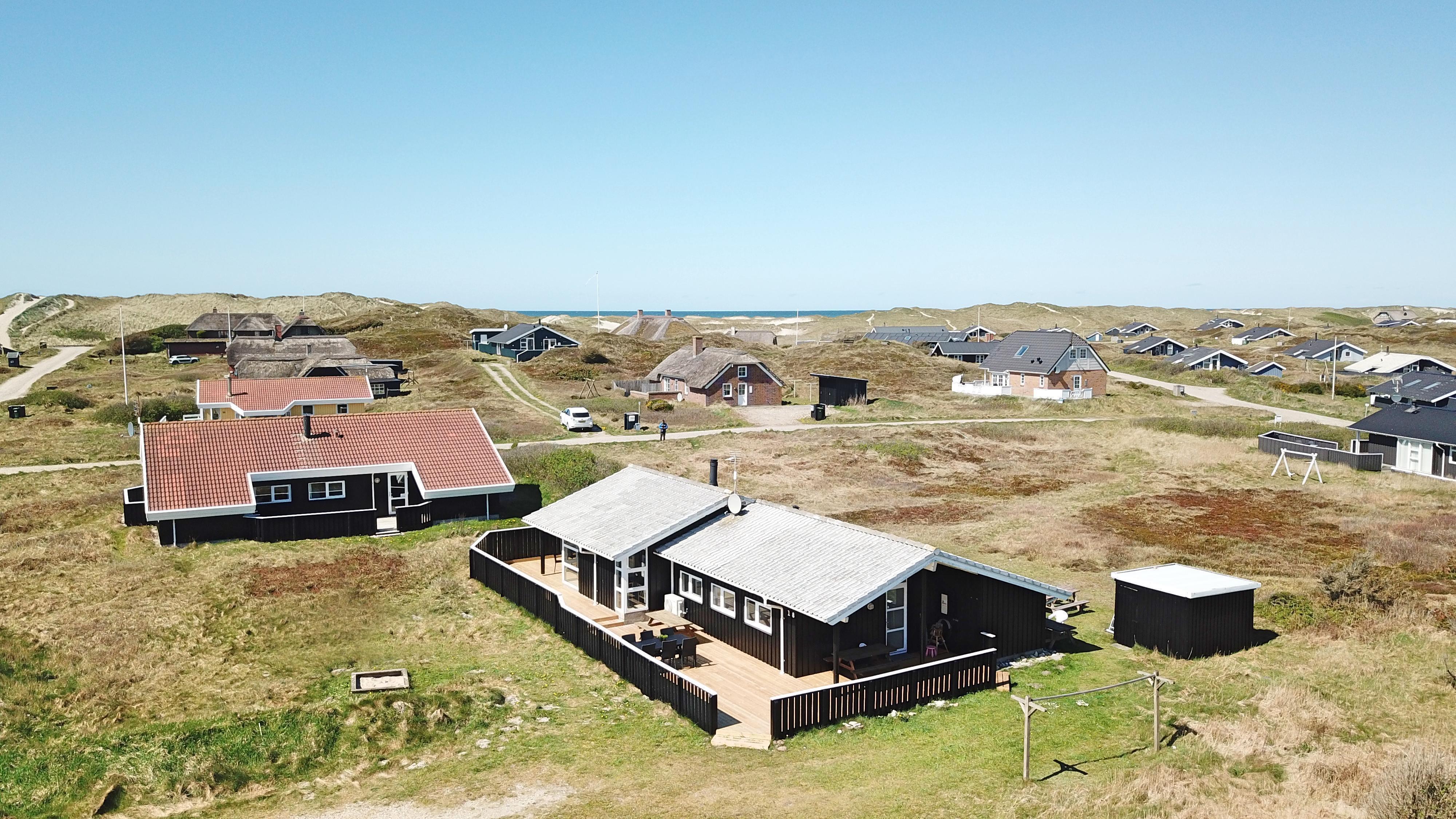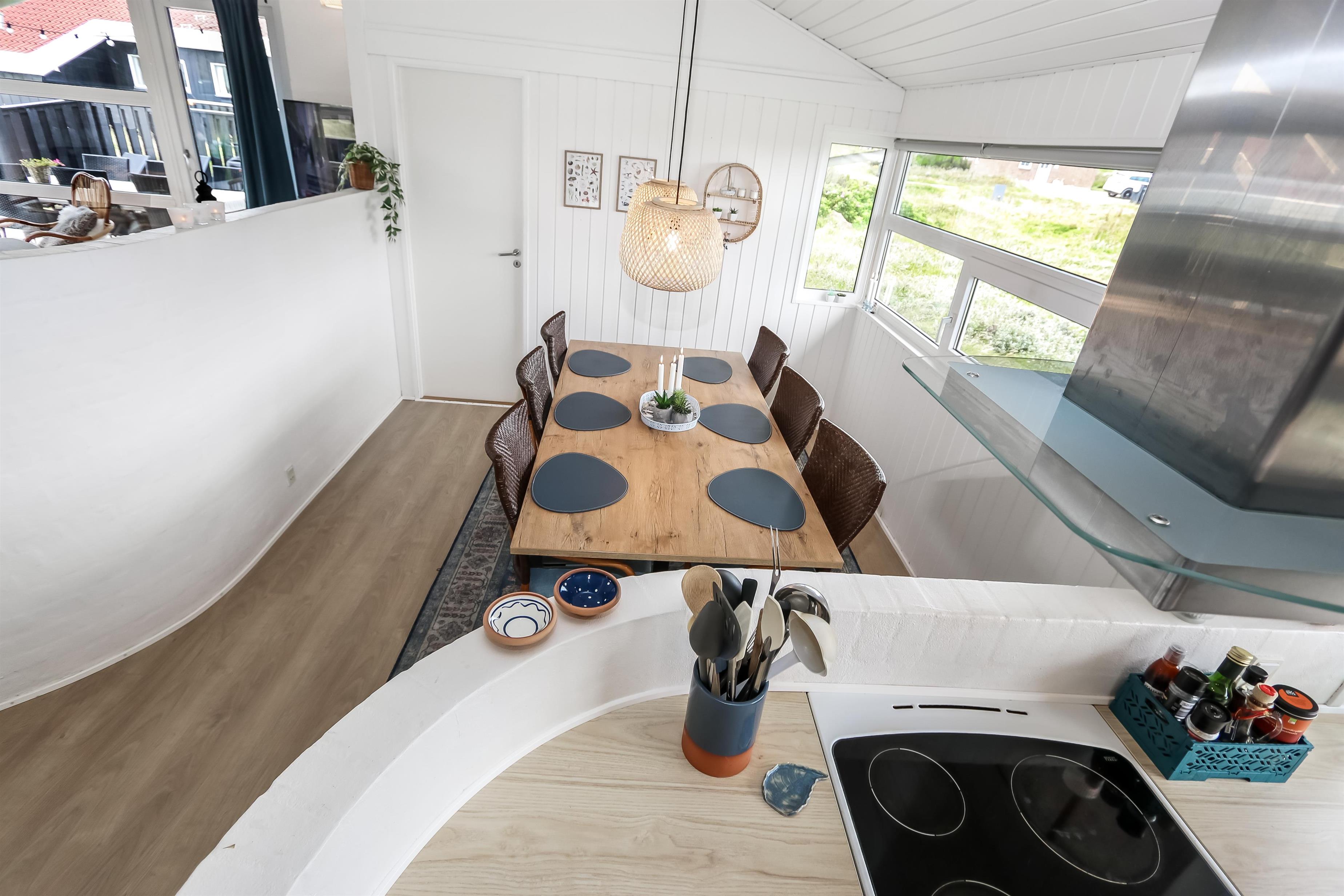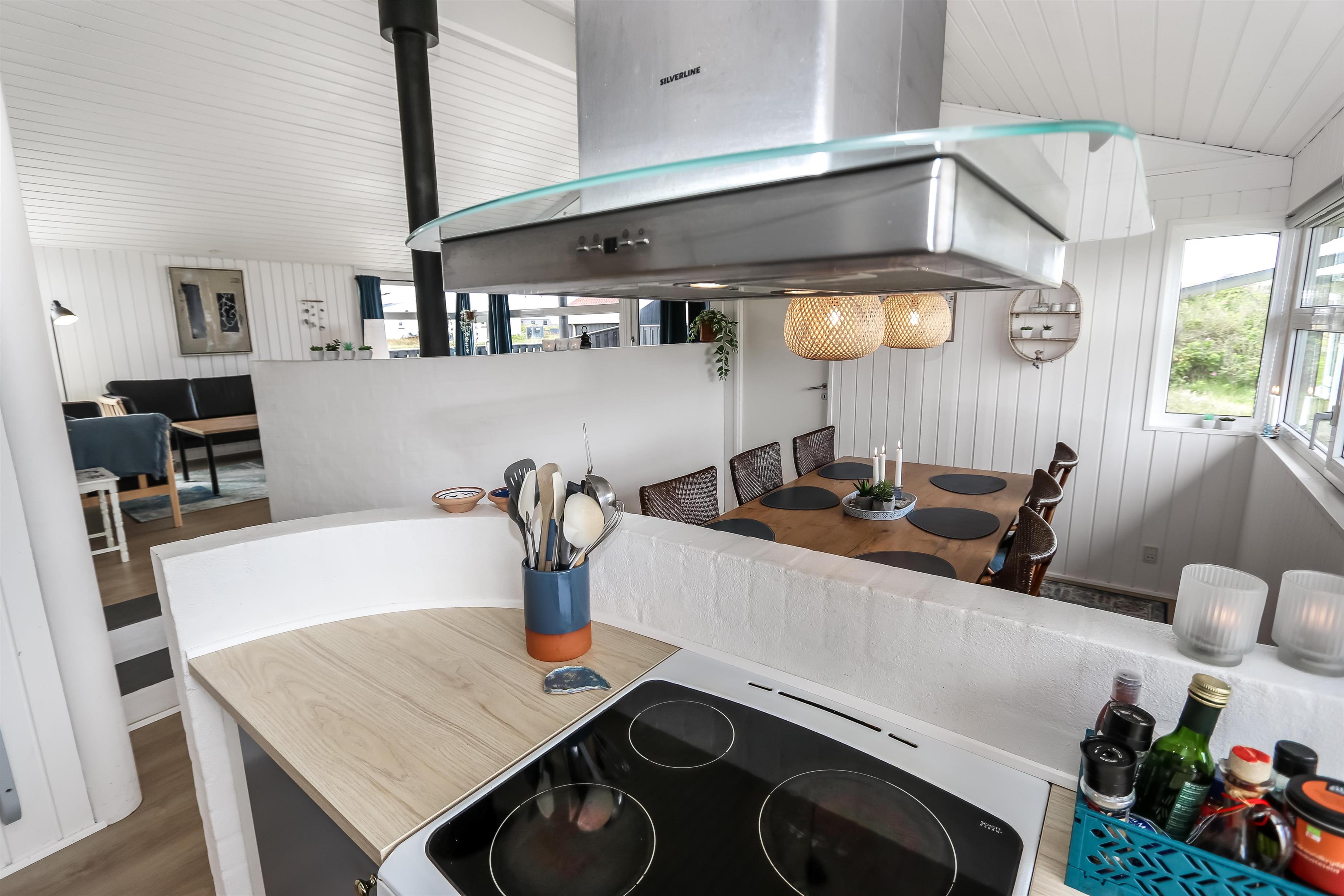 Rummeligt, komfortabelt indrettet feriehus i træ. Opholdsstuen er åben til kip og store vinduespartier, giver et rigtig godt lys inde i huset. Opholdsstuen er opdelt i spisestue, som er kombineret med det åbne køkkenhjørne. Opholdsstuen med , nye lækre lædermøbler, spisebord Smart-TV med danske og tyske programmer samt mulighed for streaming af TV / radio / Apps, så har du en mobiltelefon eller et andet device med kan du streame hvad du nu har abonnement. Nyd udsigten over klitområdet og slap af foran den knitrende brændeovn som sammen med varmepumpen hjælper med at reducere udgiften til varmeregningen. Praktiske trægulve i hele huset – med gulvvarme i køkken og entré. 4 gode soverum med gode nye senge (1DS, 1DS, 1DS, 1DS samt en hems med 2 ekstra sovepladser). Til de små gæster er der barneseng og barnestol til rådighed. Nyt køkkenhjørne med alt i service / køkkengrej samt komfur med glaskeramiske kogeplader, emhætte, opvaskemaskine, køleskab med fryseboks og mikroovn. Huset råder over 2 badeværelser begge med klinkegulv med gulvvarme, toilet, håndvask og bruser. Det ene badeværelse er med spabad og direkte adgang til saunaen, vaskemaskine og tørretumbler. Ikke ryger hus. 2 husdyr er tilladt. Har man el-bil eller en Plug-In hybrid, så er der ved Ladeboks til Type 2 ladestik.
