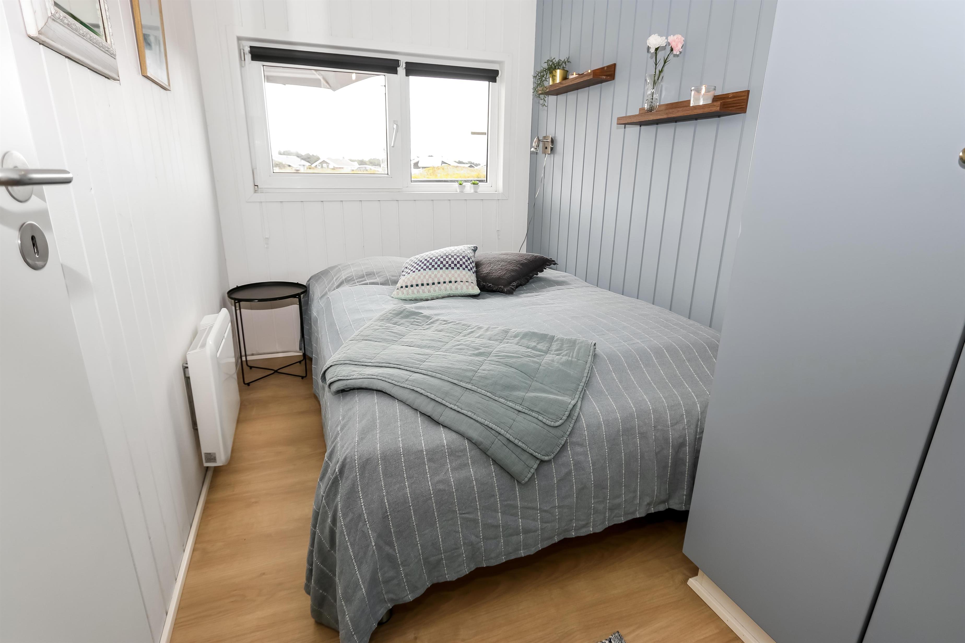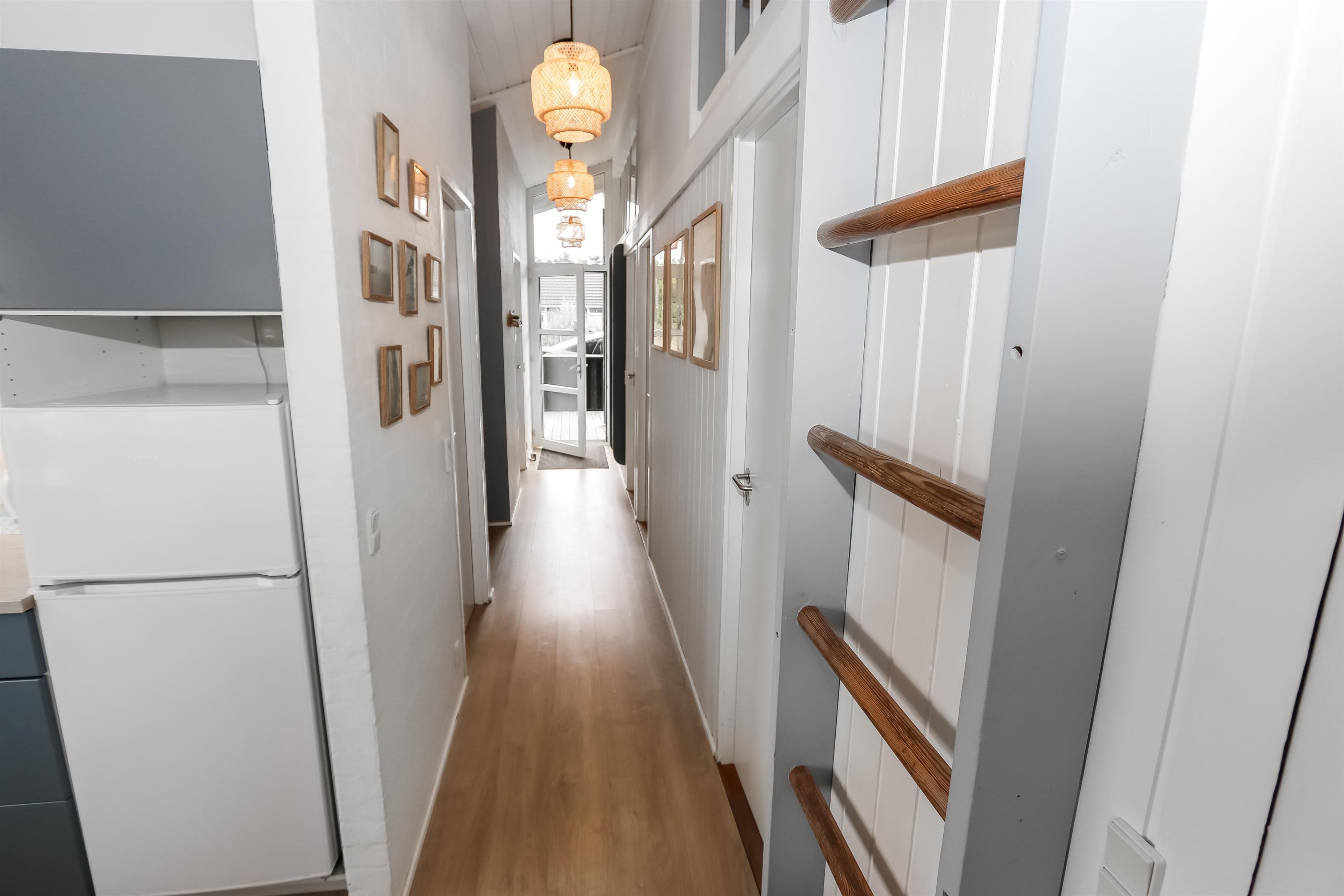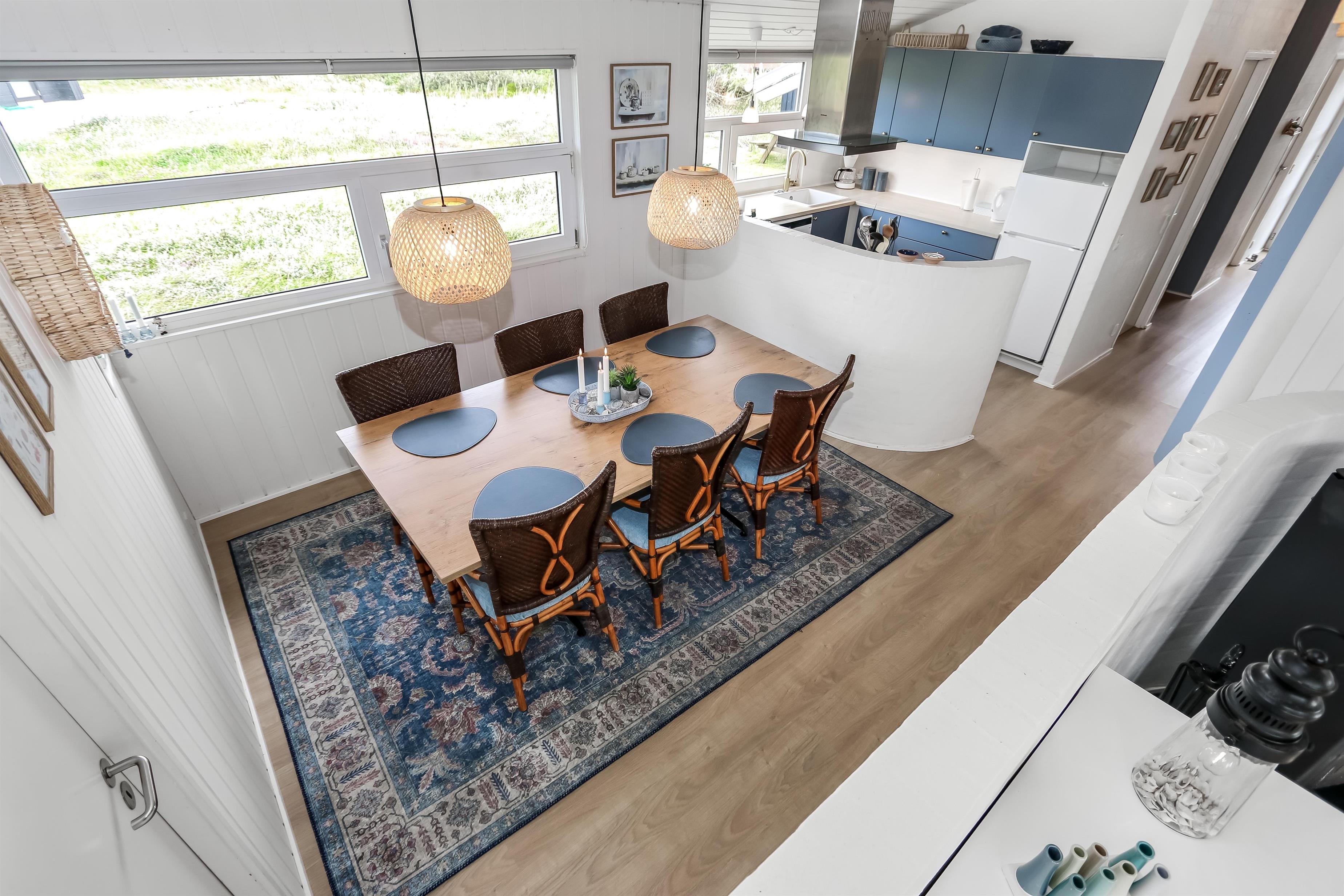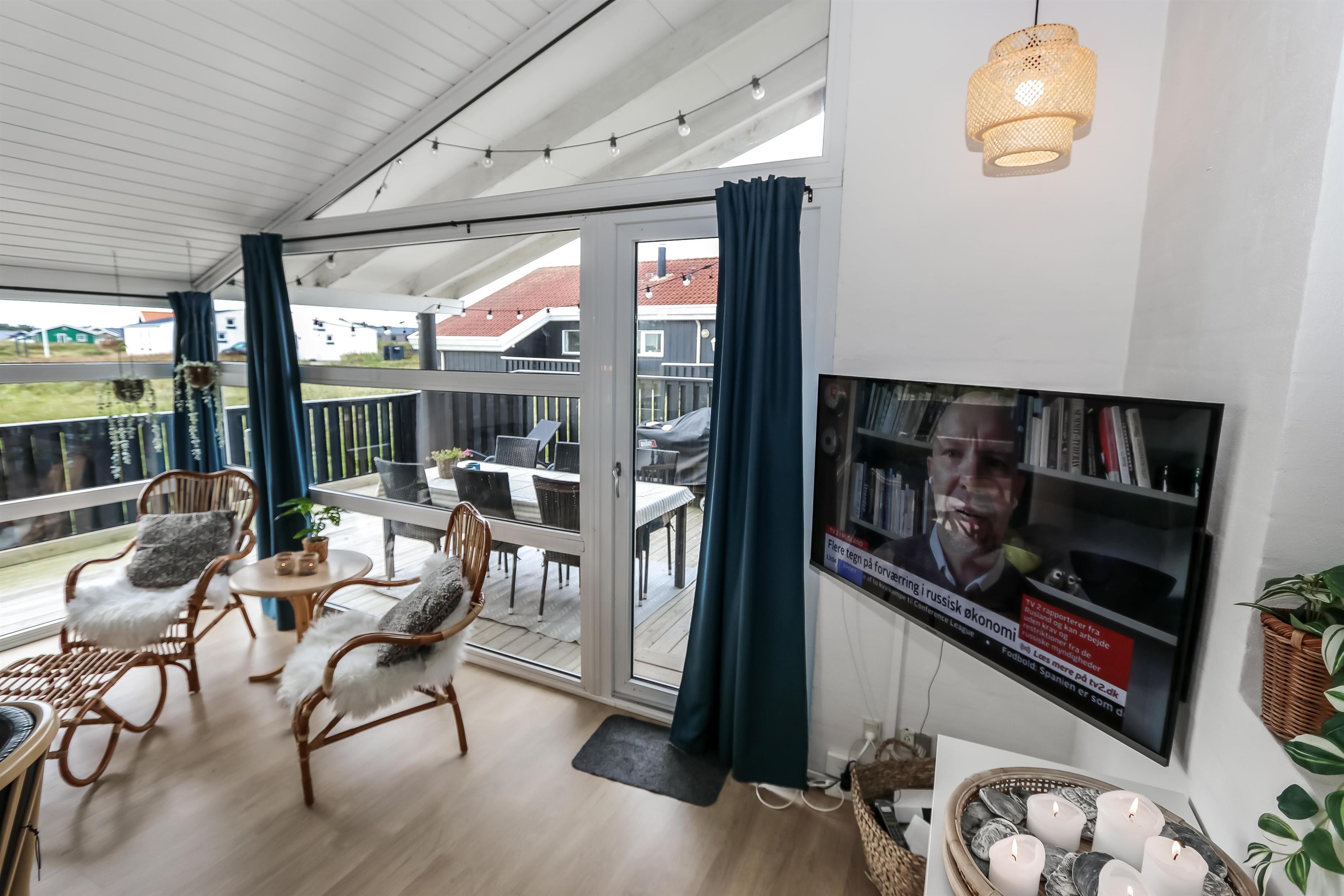 Rummeligt, komfortabelt indrettet feriehus i træ. Opholdsstuen er åben til kip og store vinduespartier, giver et rigtig godt lys inde i huset. Opholdsstuen er opdelt i spisestue, som er kombineret med det åbne køkkenhjørne. Opholdsstuen med , nye lækre lædermøbler, spisebord Smart-TV med danske og tyske programmer samt mulighed for streaming af TV / radio / Apps, så har du en mobiltelefon eller et andet device med kan du streame hvad du nu har abonnement. Nyd udsigten over klitområdet og slap af foran den knitrende brændeovn som sammen med varmepumpen hjælper med at reducere udgiften til varmeregningen. Praktiske trægulve i hele huset – med gulvvarme i køkken og entré. 4 gode soverum med gode nye senge (1DS, 1DS, 1DS, 1DS samt en hems med 2 ekstra sovepladser). Til de små gæster er der barneseng og barnestol til rådighed. Nyt køkkenhjørne med alt i service / køkkengrej samt komfur med glaskeramiske kogeplader, emhætte, opvaskemaskine, køleskab med fryseboks og mikroovn. Huset råder over 2 badeværelser begge med klinkegulv med gulvvarme, toilet, håndvask og bruser. Det ene badeværelse er med spabad og direkte adgang til saunaen, vaskemaskine og tørretumbler. Ikke ryger hus. 2 husdyr er tilladt. Har man el-bil eller en Plug-In hybrid, så er der ved Ladeboks til Type 2 ladestik.