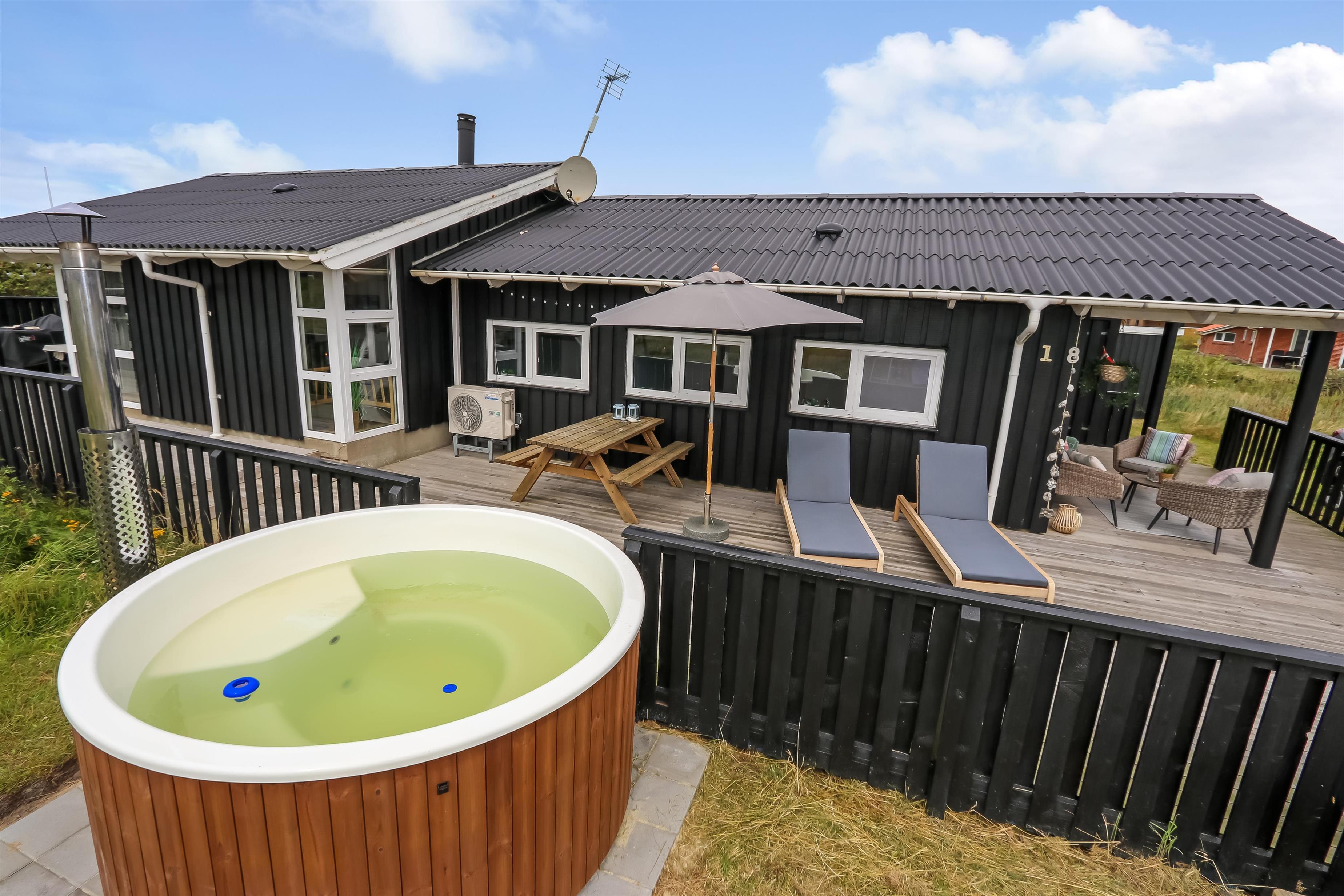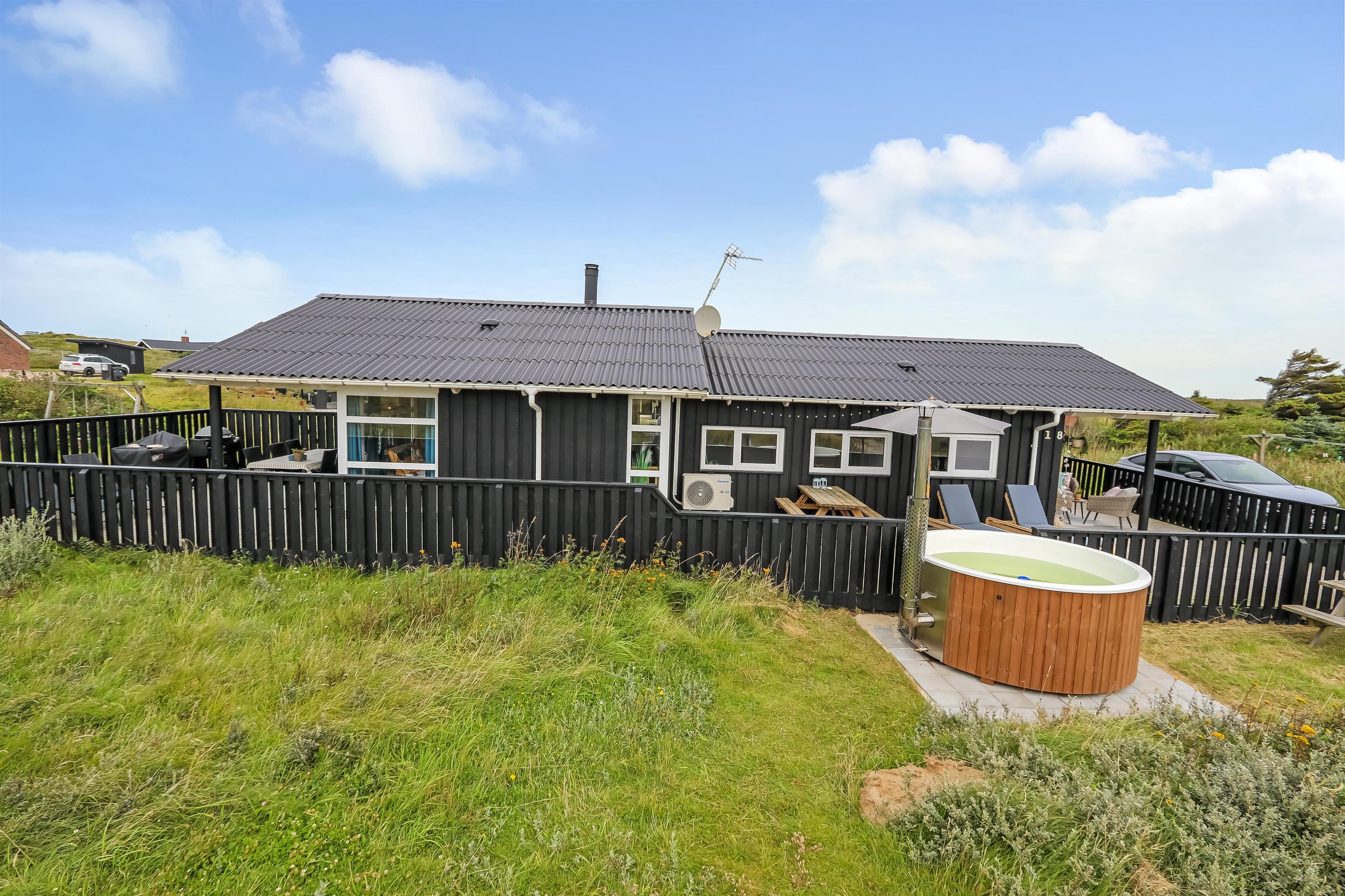 Huset er beliggende på en ca. 1.400 m2 stor naturgrund kun 250 m fra Vesterhavet. Der er udgang til en fantastisk, nylavet, og delvis overdækket træterrasse med havemøbler, solvogne og grill som kan flyttes rund efter behag. Udenfor findes stor vildmarksspa til 8 personer som opvarmes med træ.I Vejlby Klit og omegn er der rigtig gode muligheder for at cykle, vandre eller løbe en tur og kun ca. 250m fra huset ligger det brusende Vesterhav som hver dag byder på nye maleriske oplevelse. I sæsonen kan du hente morgenbrød, købmandsvarer eller måske invitere familien ud at spise, kun ca. 10 min fra huset. Så hvad enten du er til aktiv ferie eller total afslapning danner dette dejlige feriehus den perfekte ramme både hvad angår hus, beliggenhed og omgivelser.
