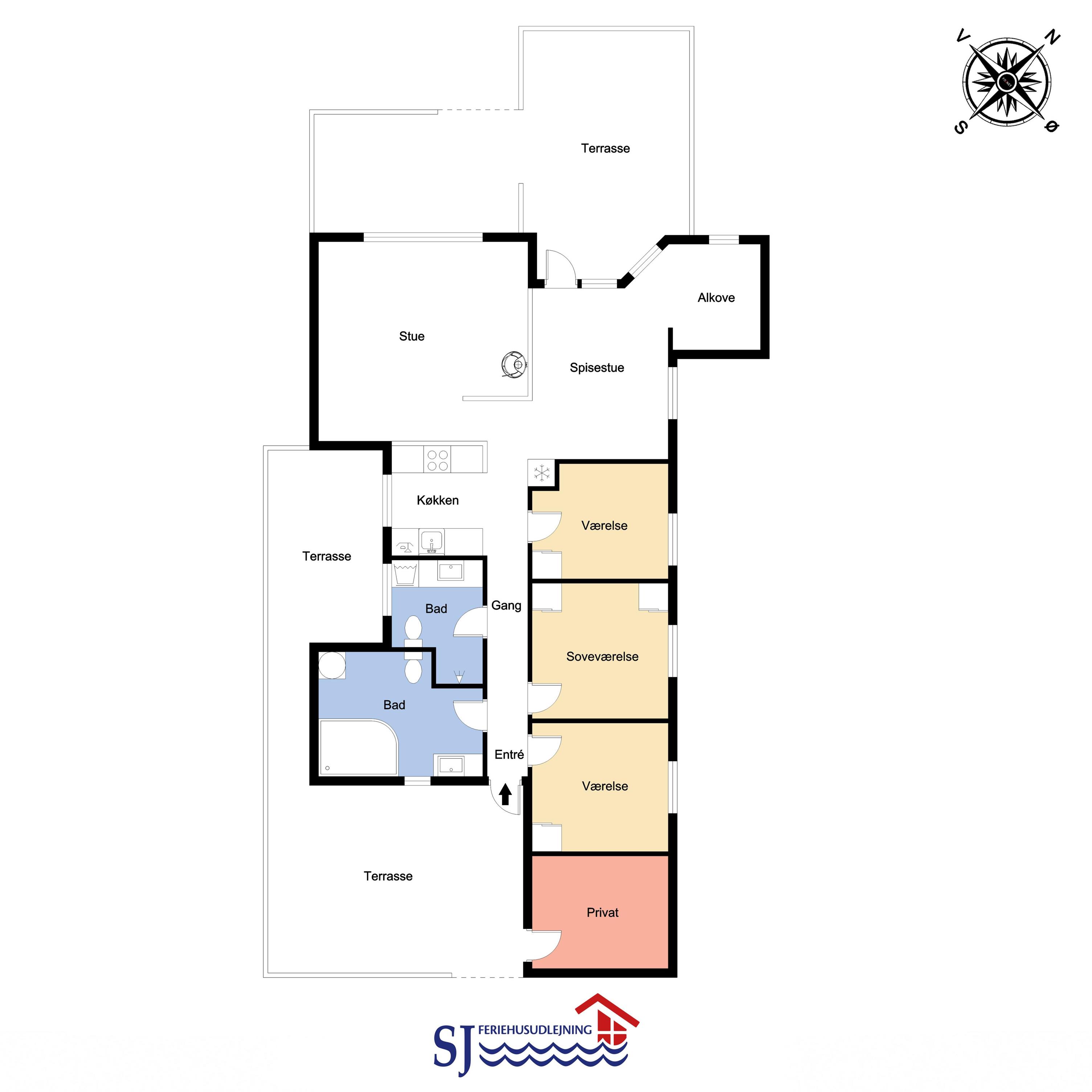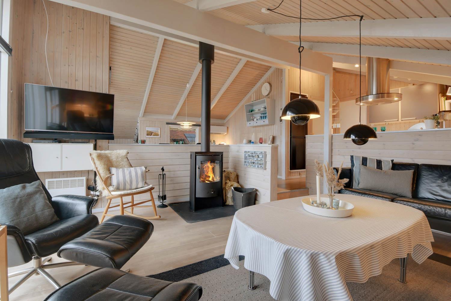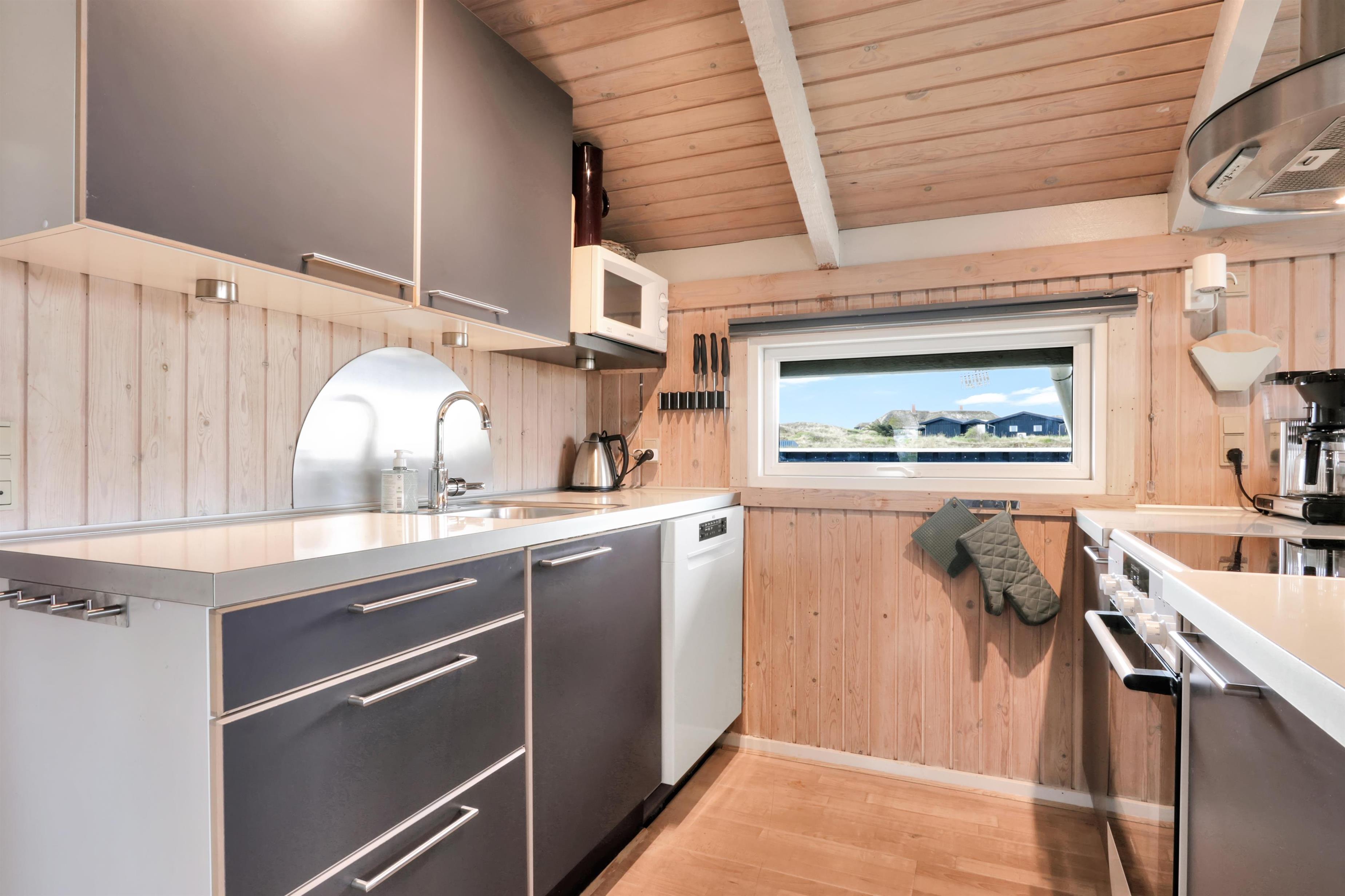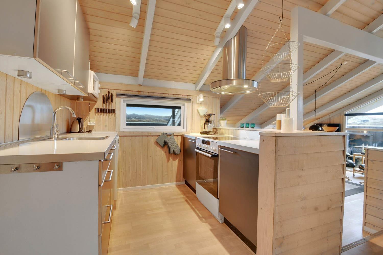 94 m2 stort, moderne træhus til max. 6 personer og med 3 soverum (1DS, 2ES, 1 ES + 1KS) og en alkove med madras og puder der helt sikkert vil tiltale de små. Opholdsstuen, som er forsænket i forhold til køkken og spiseafdeling, er med komfortable lædermøbler, TV med tyske programmer og danske programmer, radio/DVD/CD-afspiller, samt Chromecast. Sæt dig i sofaen og tænd op i brændeovnen som sammen med den installerede varmepumpe hjælper med at minimere udgiften til varmeregningen. I baggrunden kan du se de høje klitter ved Vesterhavet. Godt indrettet køkkenafdeling med alle tænkelige hjælpemidler bl.a. opvaskemaskine, komfur med keramiske kogeplader, emhætte, mikroovn og køle-fryseskab. Køkkenet er kombineret med opholds-/spisestuen. Flot Badeværelse med toilet, håndvask, lækkert spa-bad til 2 personer, håndklædetørrer og tørretumbler. Ekstra badeværelse med bruser, toilet, håndvask og vaskemaskine. Praktiske hårde gulve i hele huset og Spa-badeværelse med gulvvarme. Ikke ryger hus. Max 1 husdyr tilladt - kun hunde tilladt.