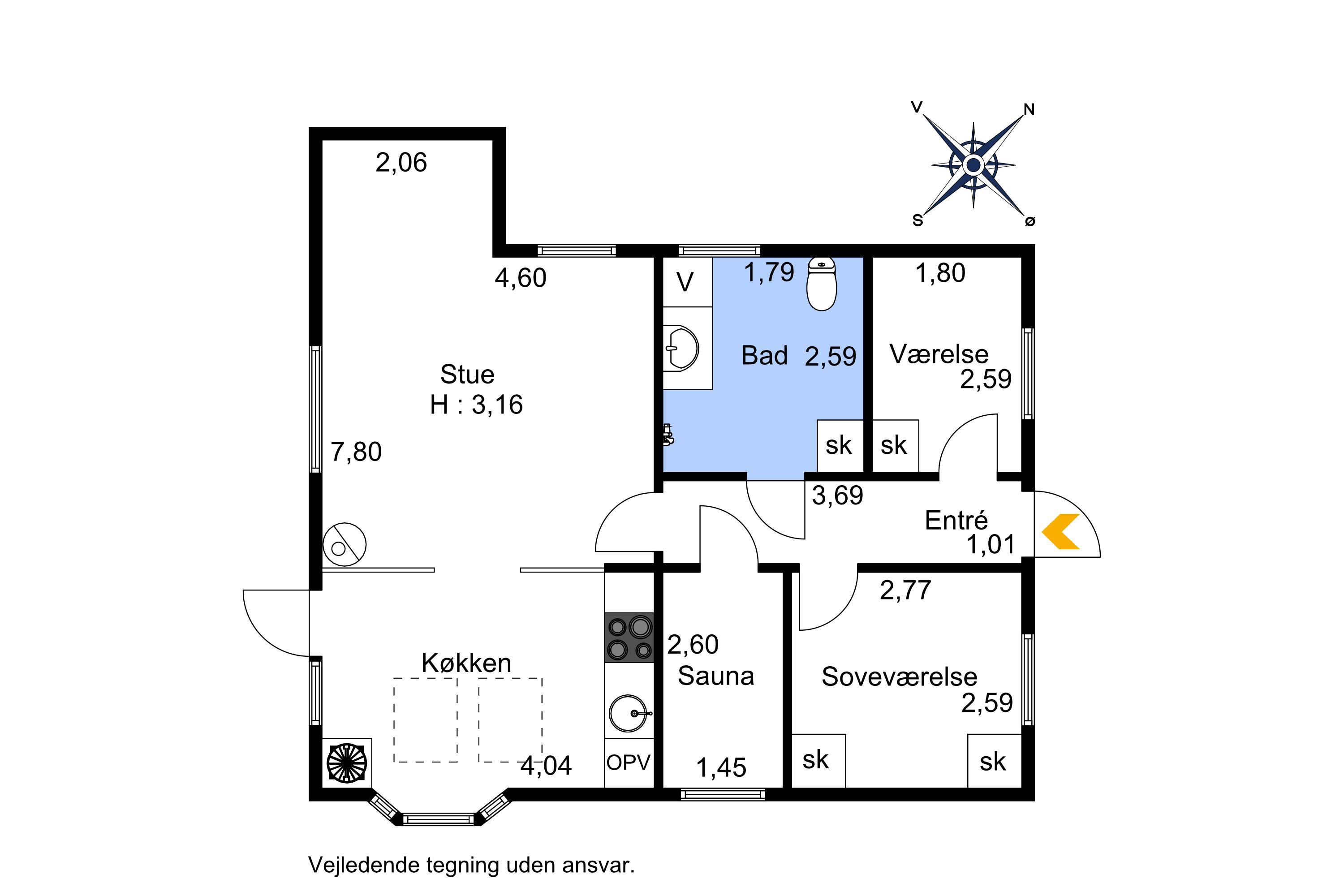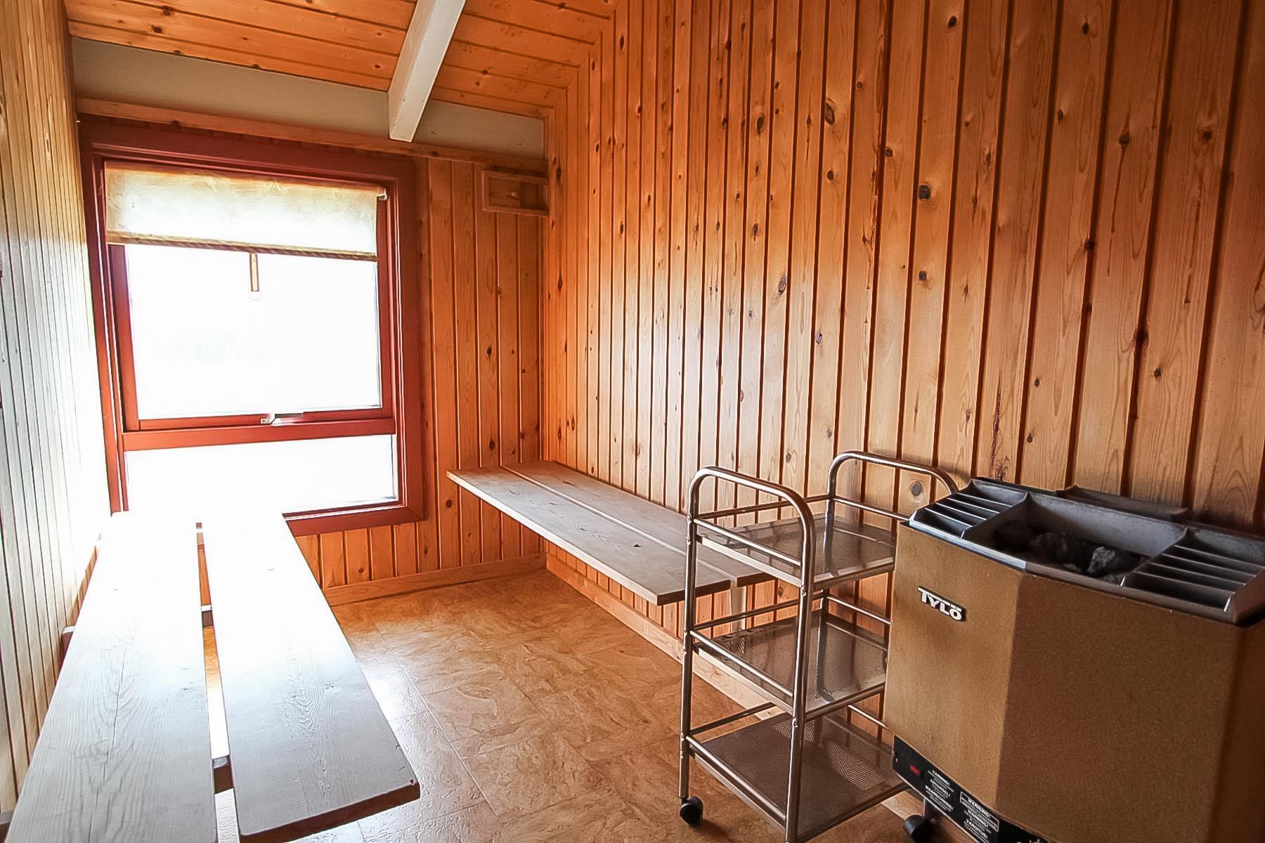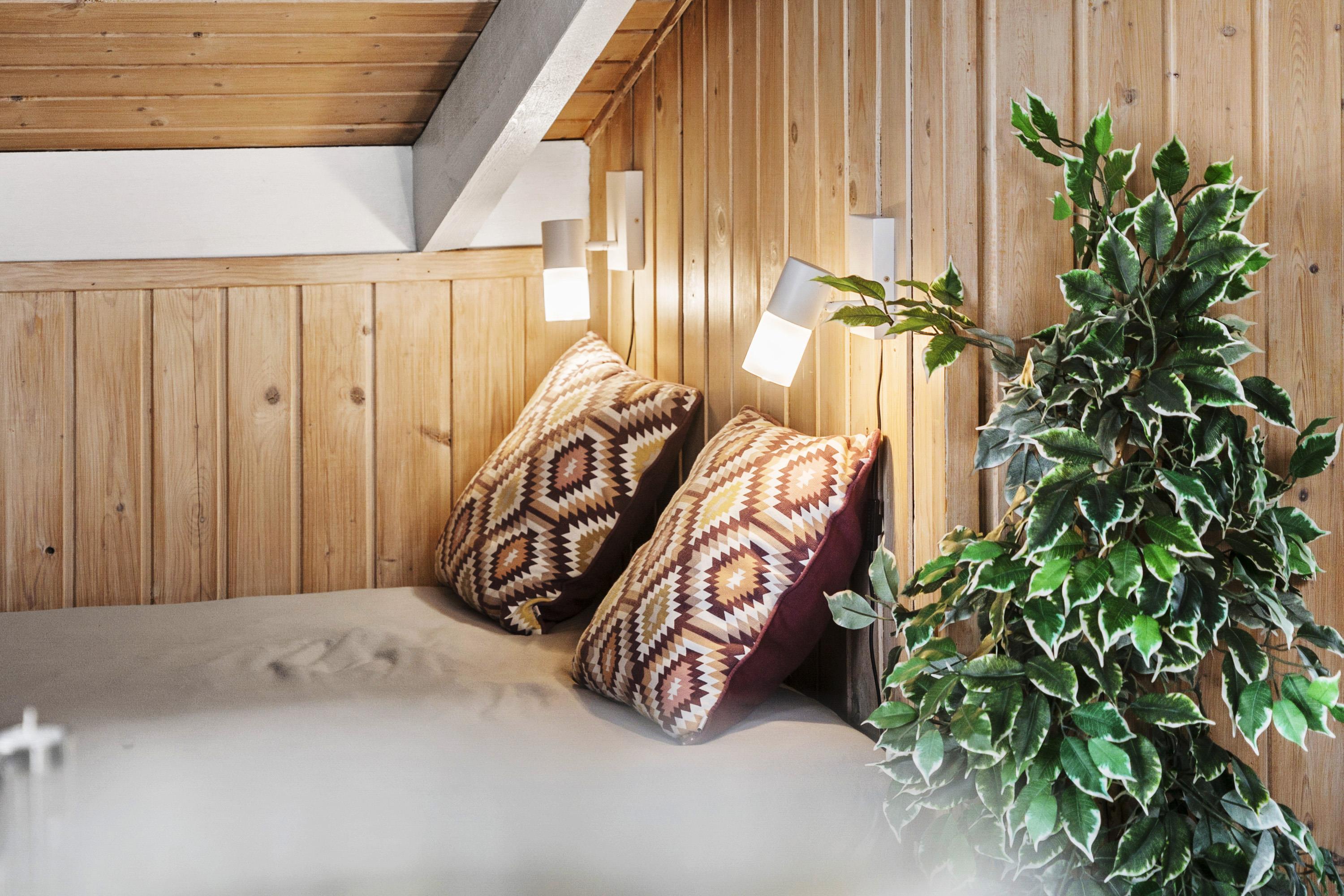 Badeværelset har toilet, bruser og håndvask plus en vaskemaskine. Herudover er der 2 soveværelser med et værelse med dobbeltseng og tv og et værelse med 2 køjesenge.