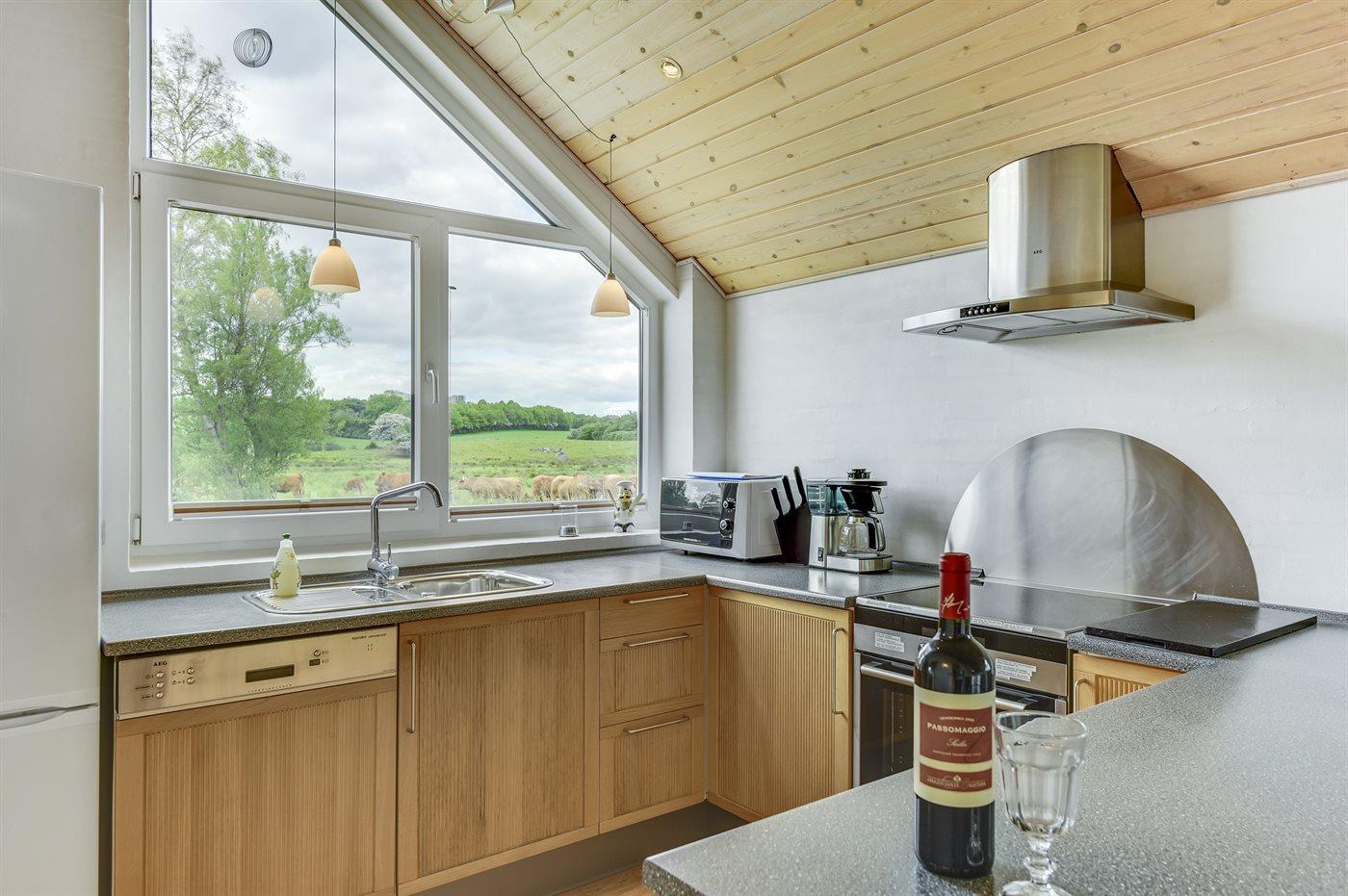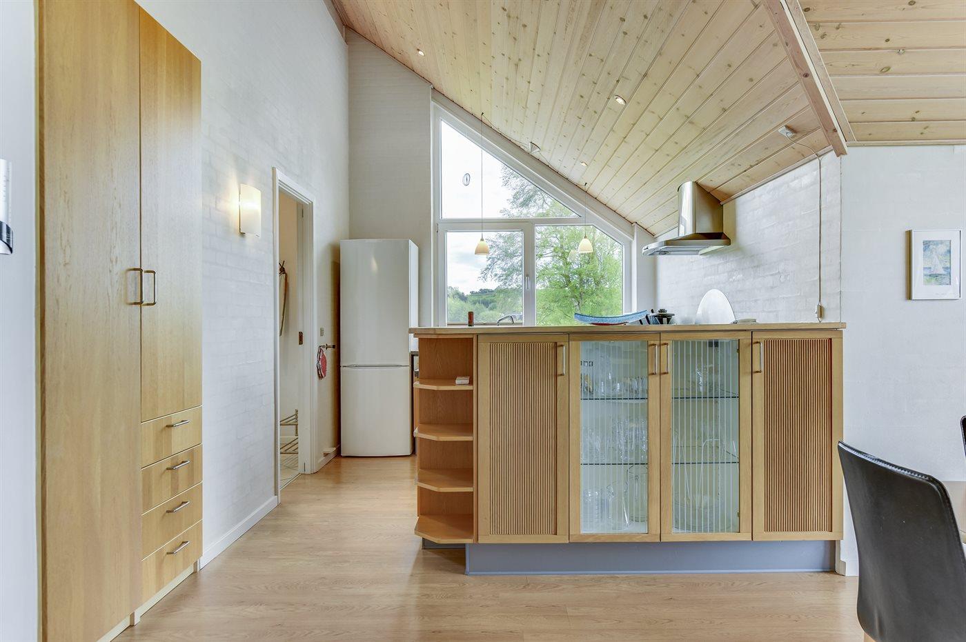 Køkkenet er udstyret med kølefryseskab. Der er 4 induktionskogeplader, varmluftovn, mikrobølgeovn samt opvaskemaskine.