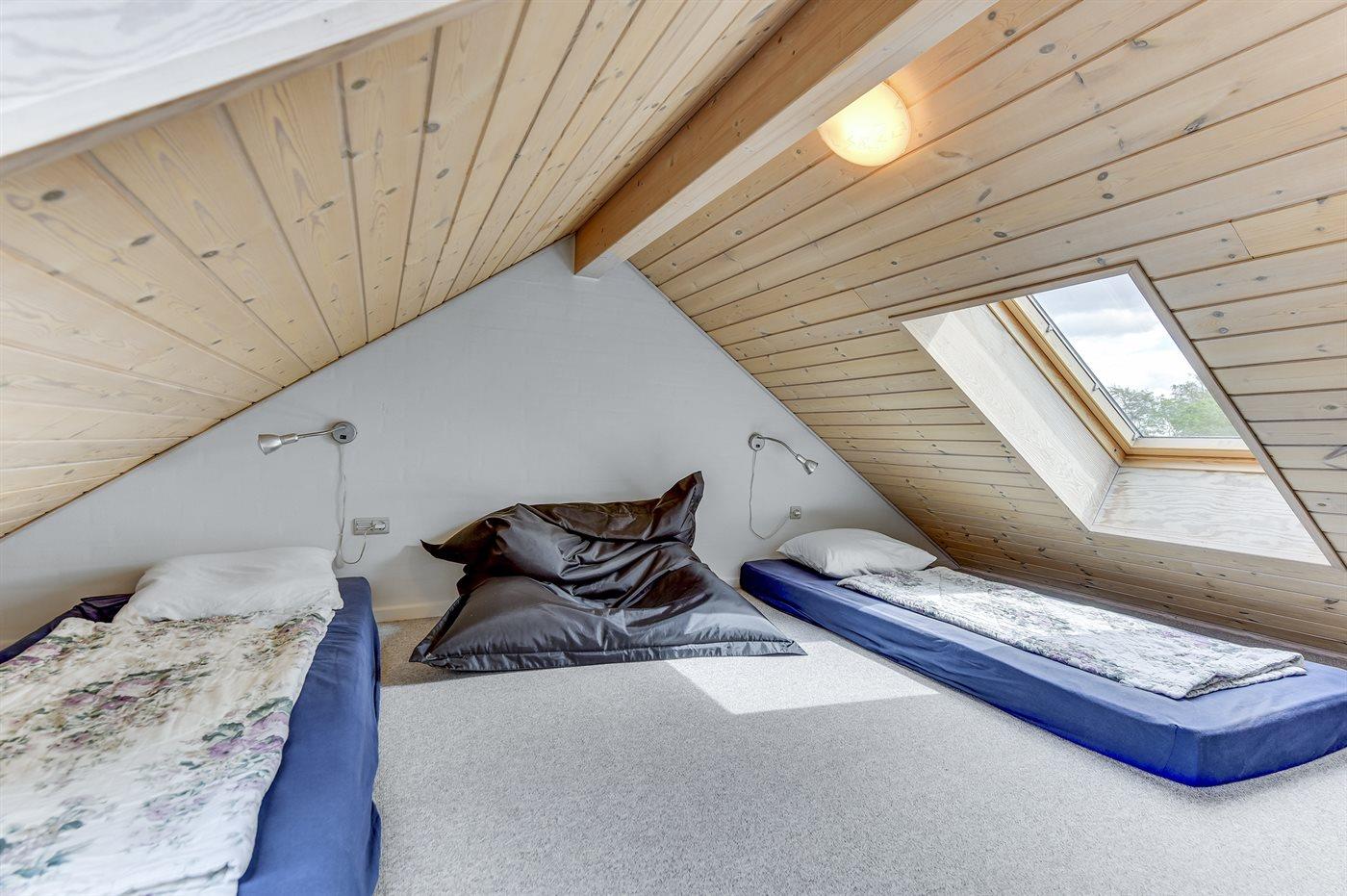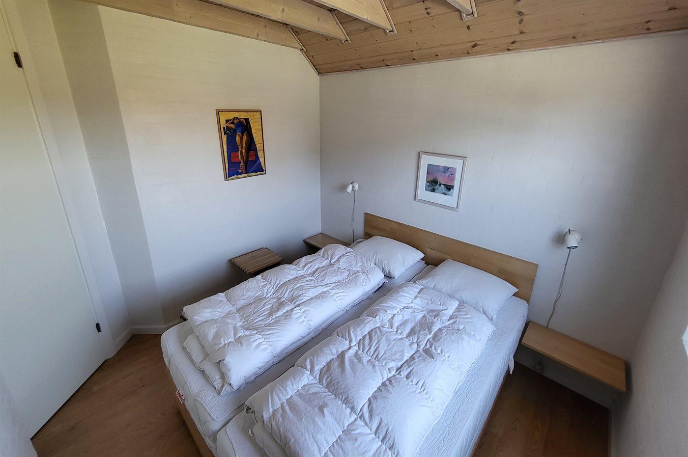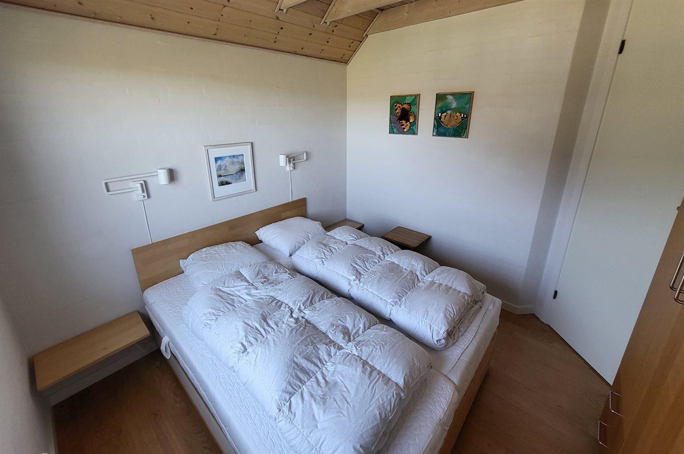 Der er 3 soveværelser samt en hems. Sovepladserne fordeler sig på: 4 sovepladser i dobbeltsenge, 2 sovepladser i enkeltsenge og 2 sovepladser på madrasser på hemsen. Derudover er der en barneseng.