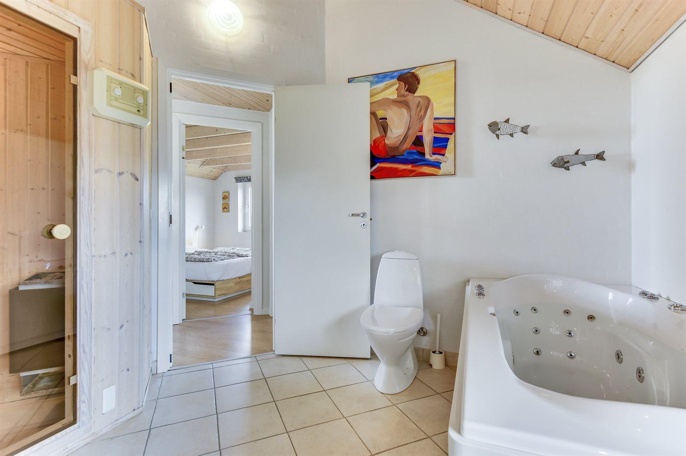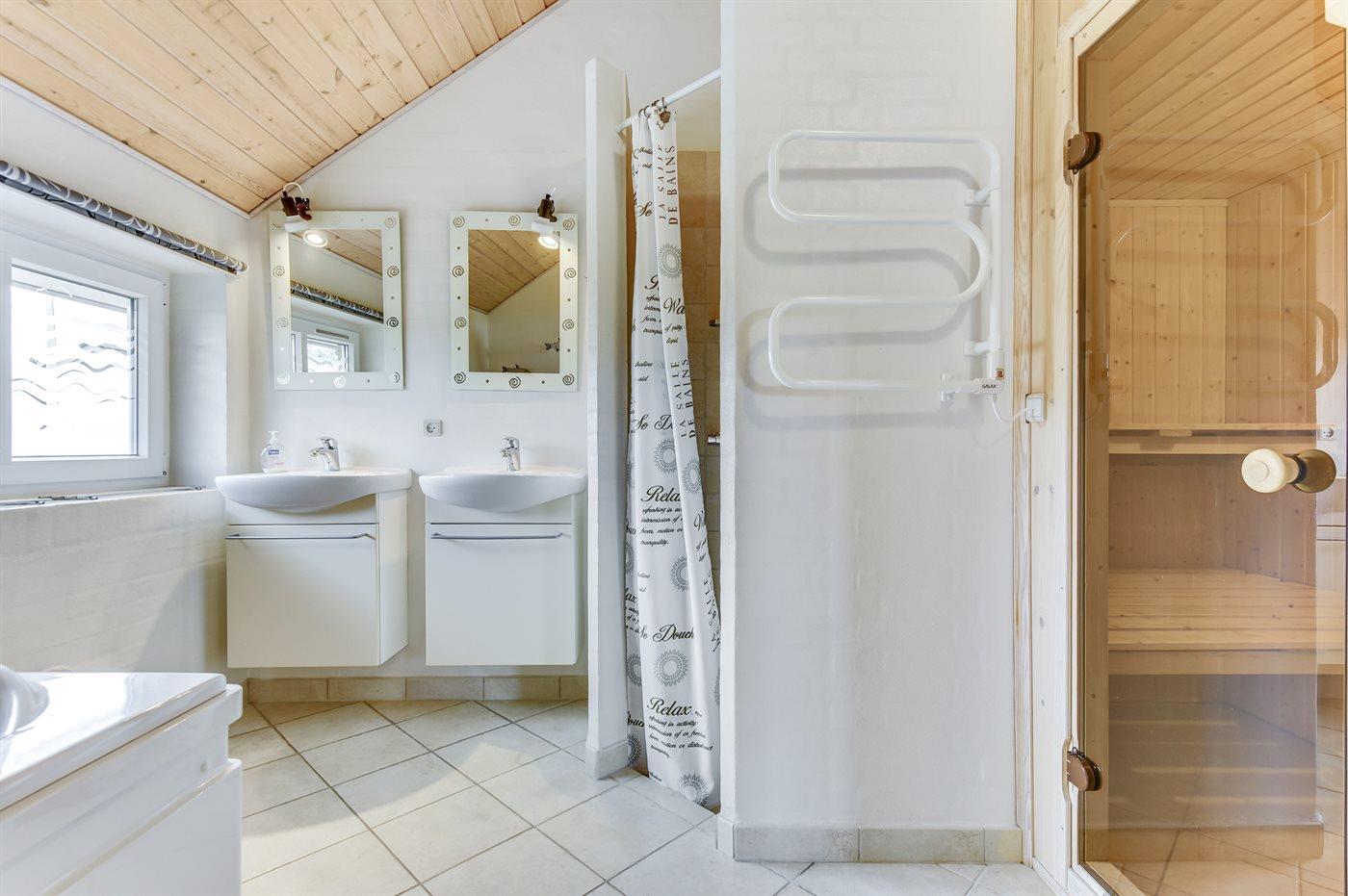 Der er 2 badeværelser med bruser. I det ene er der også sauna. Der er ligeledes en spa til afslapning for 2 personer. Der er gulvvarme i begge badeværelser, køkkenet og bryggers.
