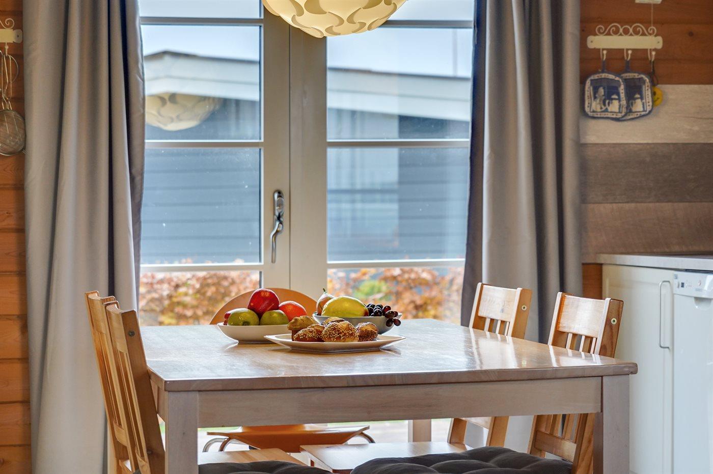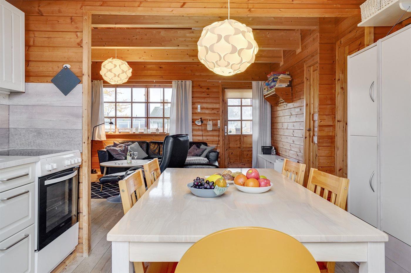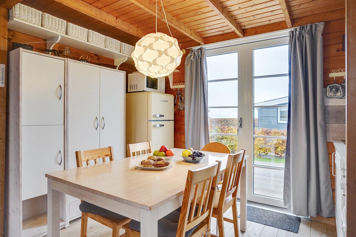 Køkkenet er udstyret med 1 køleskab. Der er 4 keramiske kogeplader, varmluftovn, mikrobølgeovn samt opvaskemaskine.