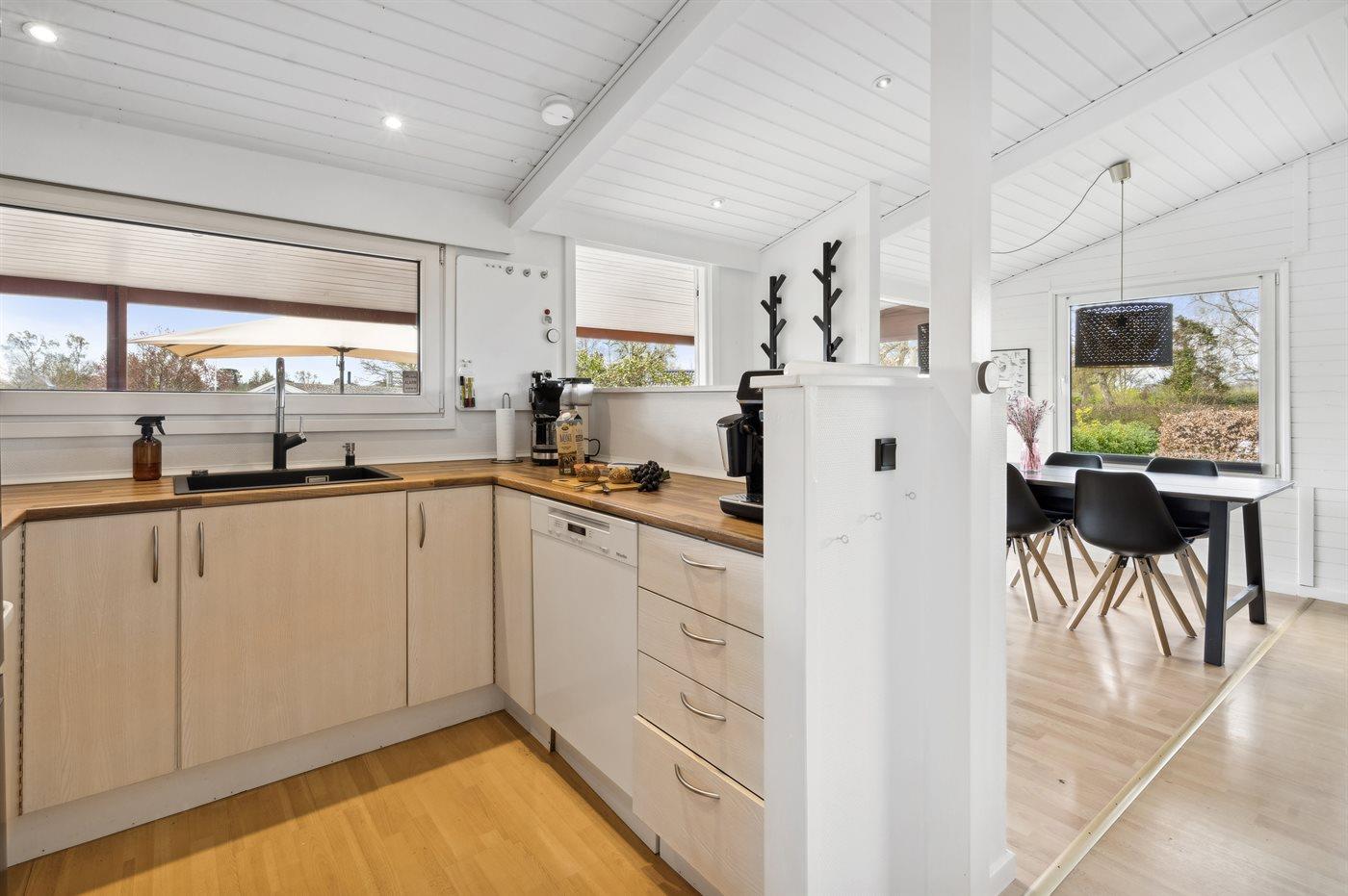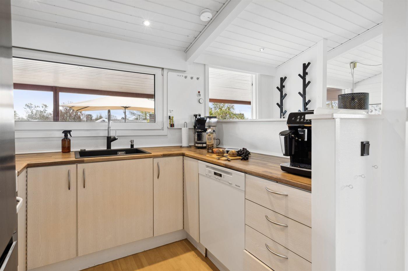 Køkkenet er udstyret med 1 køleskab. Der er 4 induktionskogeplader, varmluftovn samt opvaskemaskine.