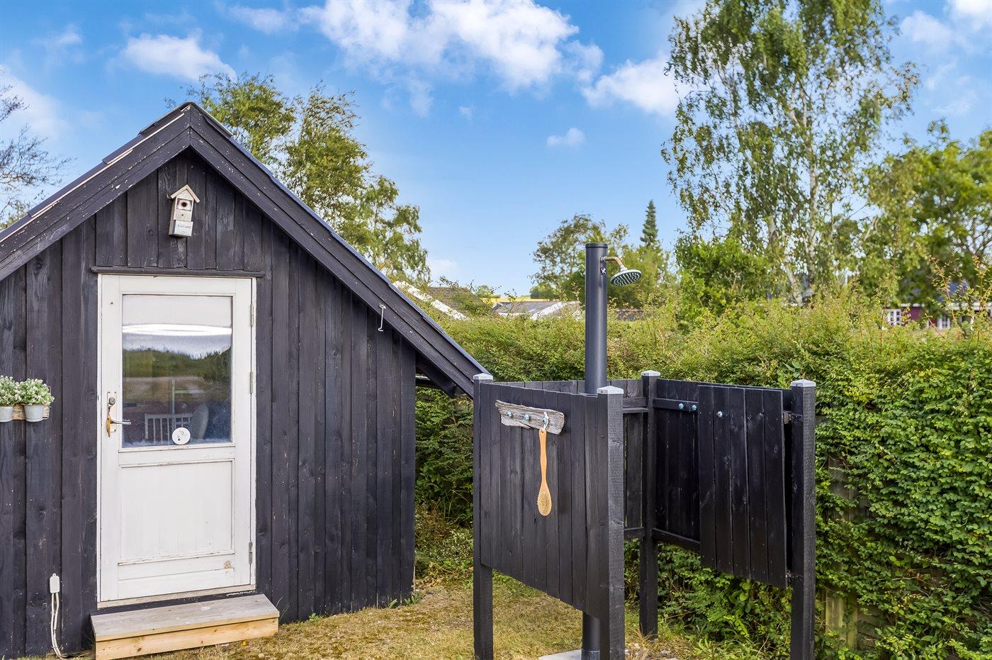 Ferieboligen er beliggende på en 670 m² stor naturgrund. Der er 20 m til havet. Der er en badebro i nærheden. Nærmeste forretning er beliggende i en afstand af 4000 m. Der er en golfbane i en afstand af 11000 m. Til ferieboligen hører åbent terrasseareal. Desuden er der overdækket terrasse. Der er redskabsrum. Der ligger en legeplads i en afstand af 300 m. Udendørs bruser. Grill til rådighed. Parkering ved ferieboligen.