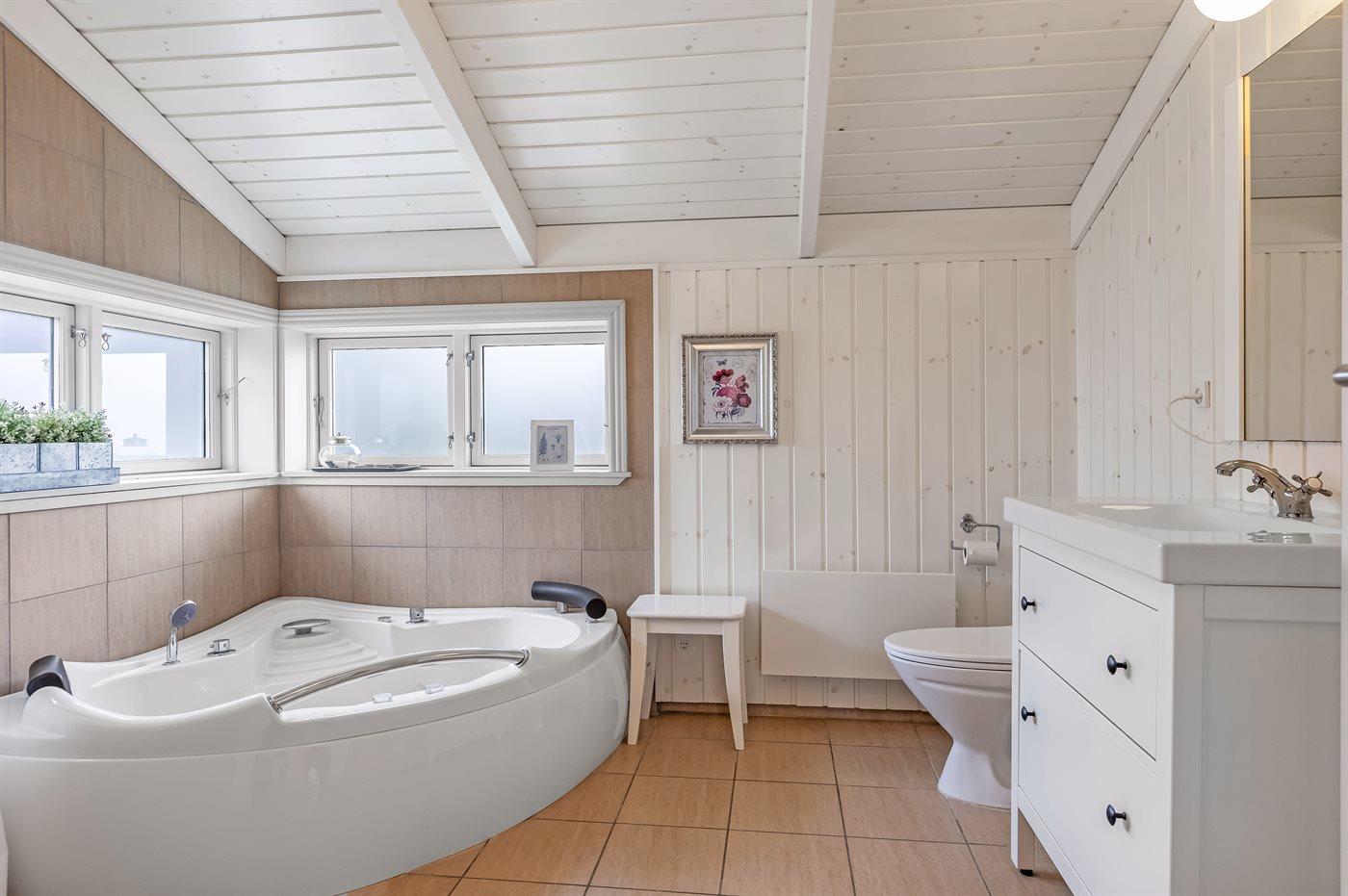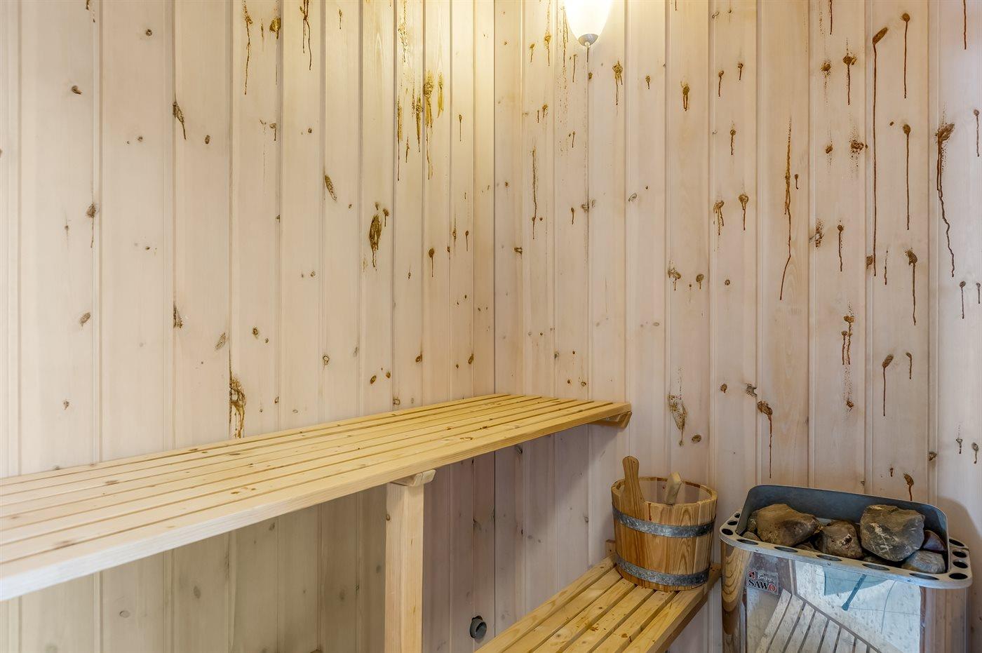 Der er 2 badeværelser med bruseniche og 2 toiletter. Der er gulvvarme på 2 badeværelser. I saunaen er der mulighed for afslapning.