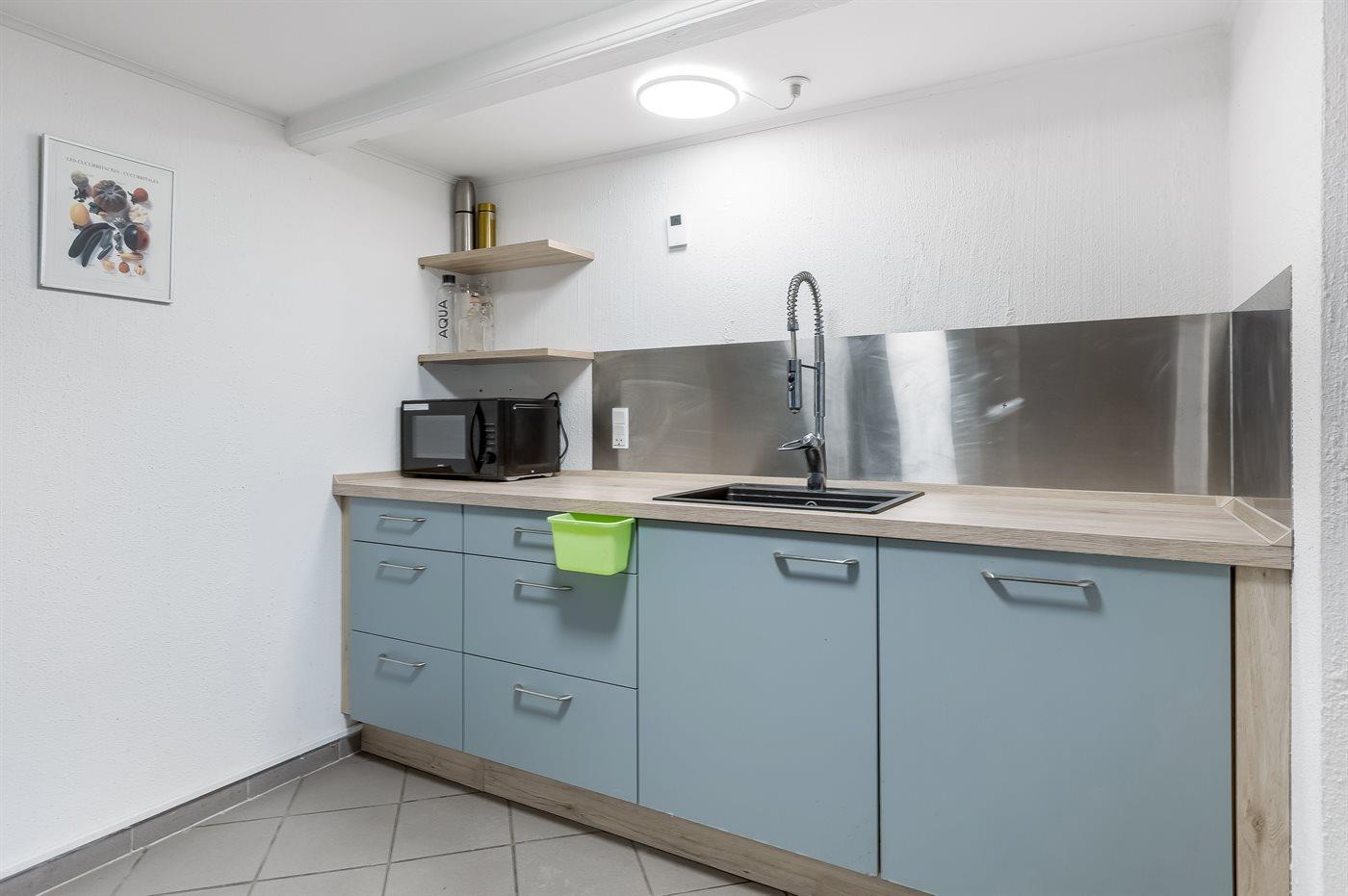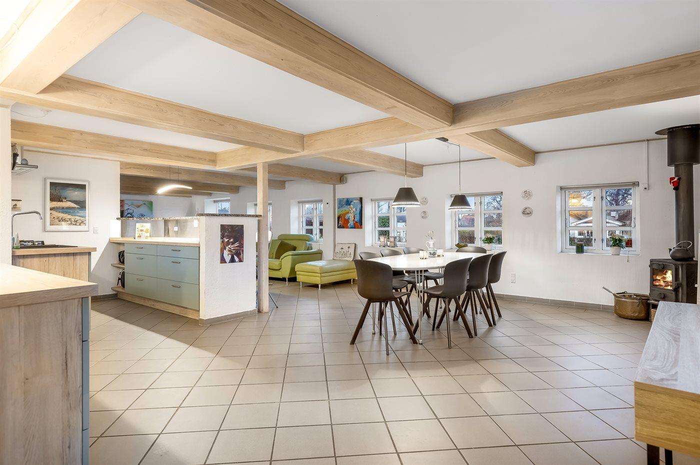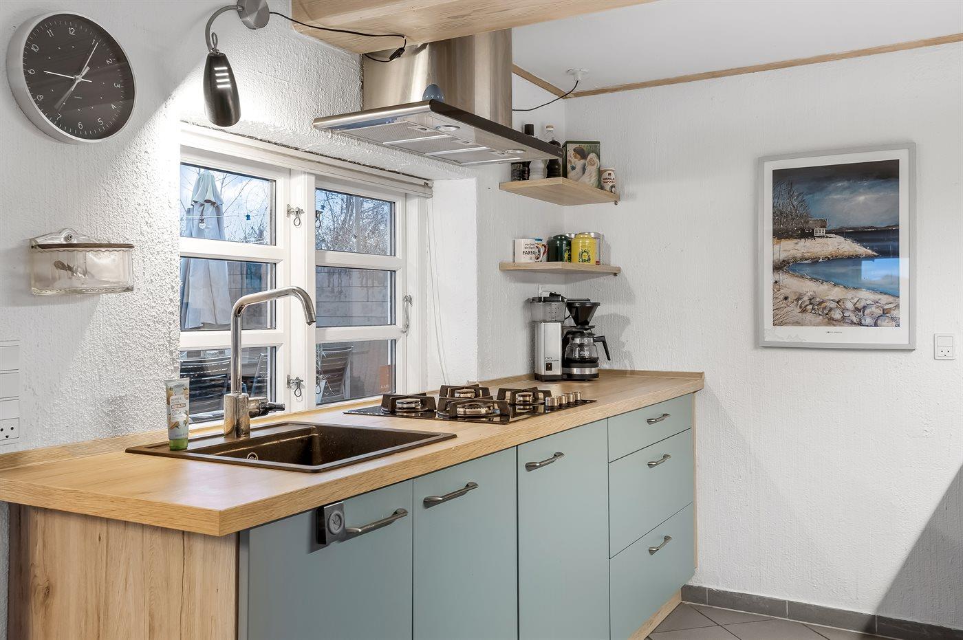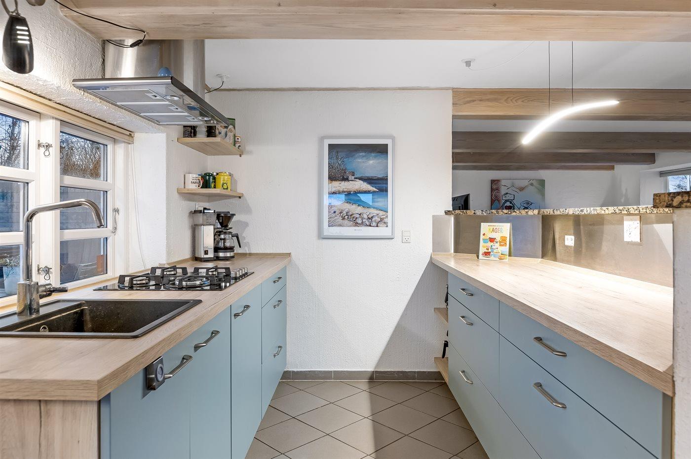 Køkkenet er udstyret med 1 køleskab. Der er 4 gasblus, varmluftovn, mikrobølgeovn samt opvaskemaskine Der er gulvvarme i køkkenet.