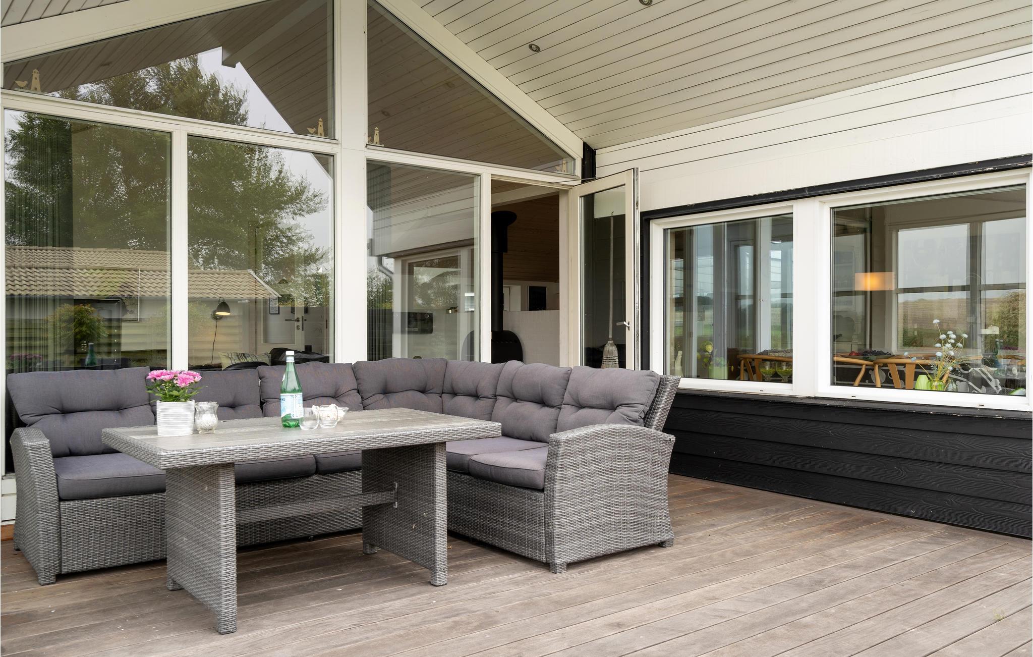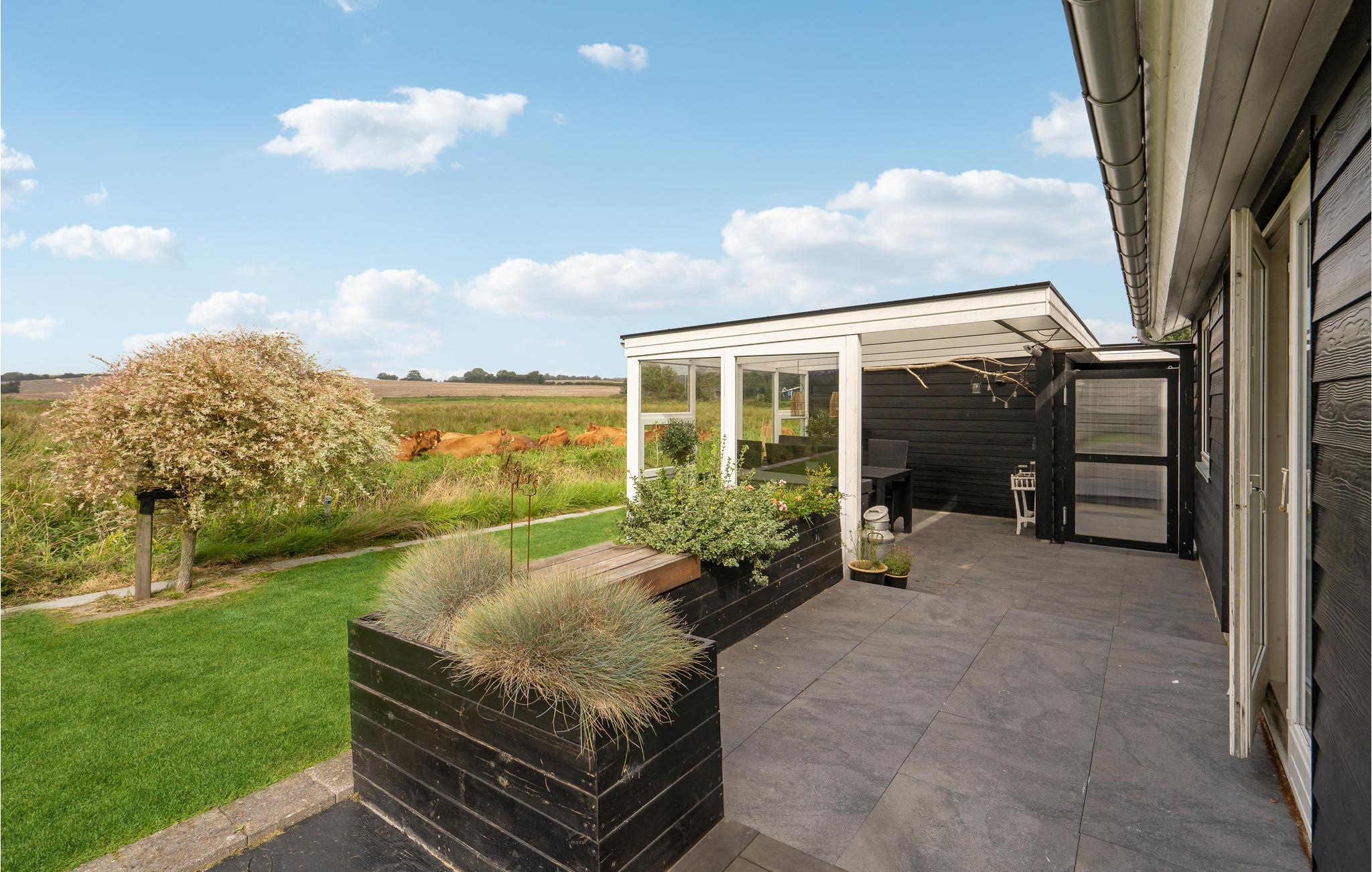 Velkommen til en helt igennem skøn beliggenhed ud til marker og kun nogle få minutters gang fra en familievenlig sandstrand. Her kan I se frem til en lys og åben bolig med stilrene indretningsløsninger og gode faciliteter. Dagens fælles aktiviteter finder sted i den store, hyggelige stue, hvor I kan nyde den fantastiske udsigt gennem det brede vinduesparti og læne jer godt tilbage i sofahjørnet med gode bøger eller et brætspil. Oven på en lang, frisk gåtur eller et dyp ved stranden er det rart at komme tilbage og få varmen foran ilden i brændeovnen.