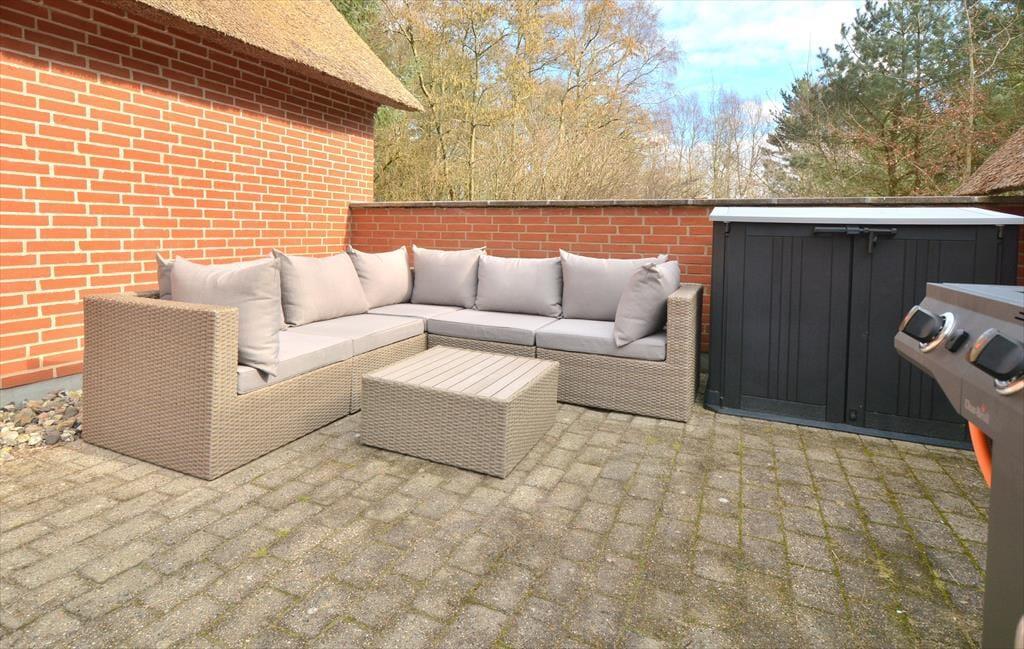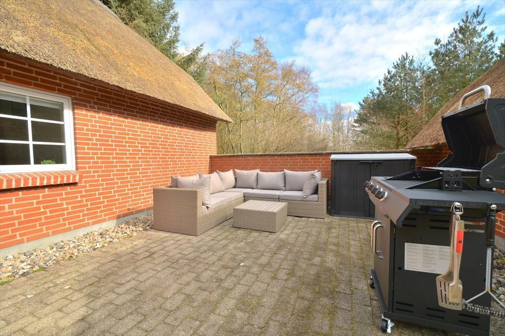 Udenfor venter en stor, uforstyrret naturgrund, omgivet af træer, der skaber både læ og privatliv. Her er højt til himlen og masser af plads til, at både børn og hunde kan bevæge sig frit og trygt. Den åbne græsplæne indbyder til leg, og skyggefulde pletter under træerne giver mulighed for en pause midt på dagen. Mens børnene spiller bold eller udforsker området, kan hunden løbe med, snuse rundt og være en del af legen – eller blot finde ro i græsset ved familiens fødder. Den store træterrasse giver mulighed for afslappende stunder i solen, fælles måltider under åben himmel og lange sommeraftener med god tid. I kan sidde længe og nyde solens sidste stråler, mens lydene fra naturen langsomt tager over. Her er ingen naboer tæt på og ingen forstyrrelser – kun jer, stilheden og et sted, hvor hele familien kan ånde frit, være sig selv og bare være sammen – også med jeres hund ved siden af jer.