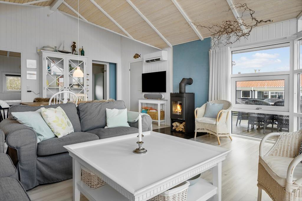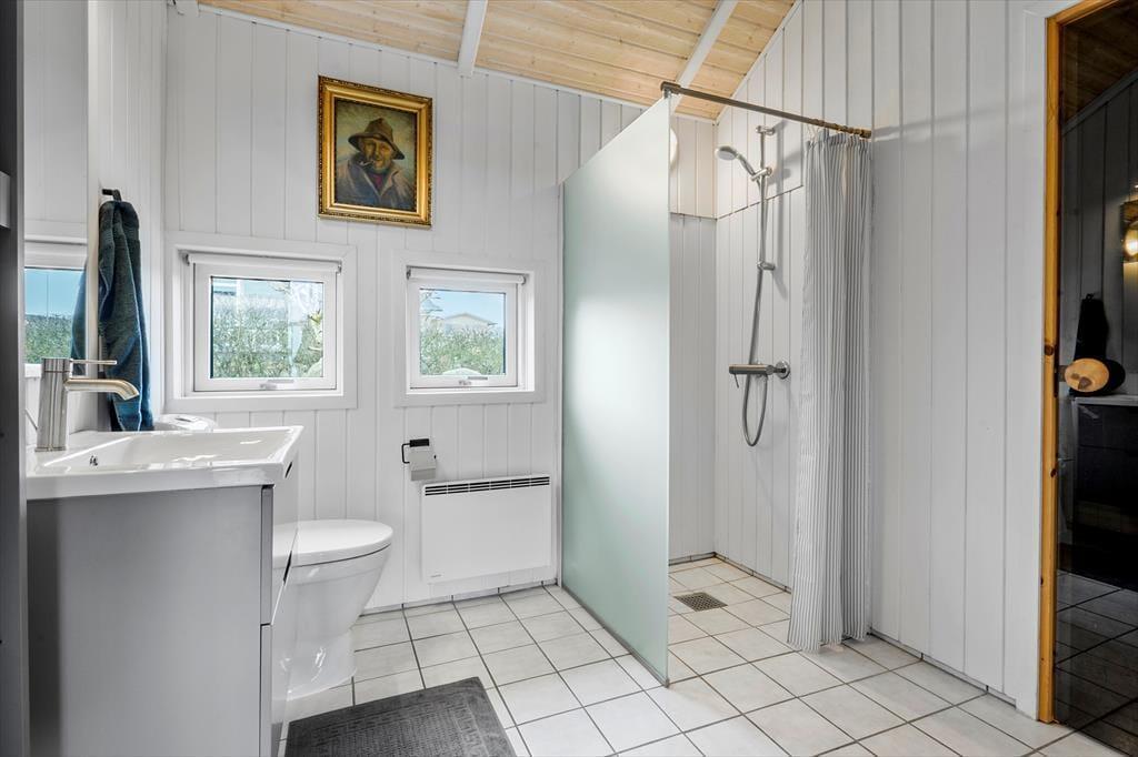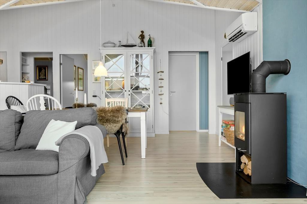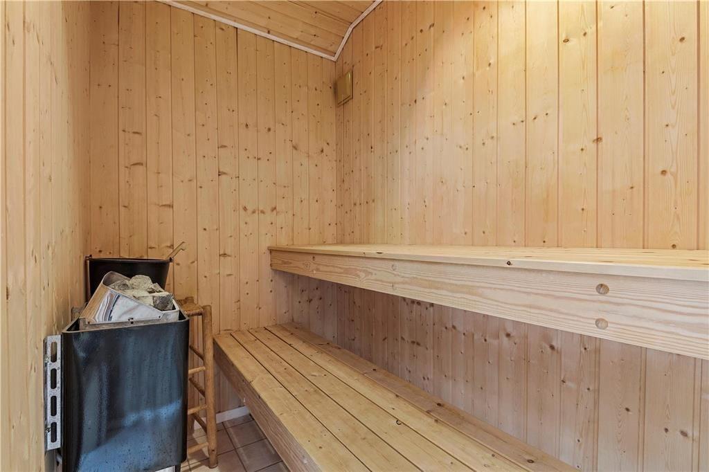 Rummeligt feriehus med havudsigt og tæt på badestrand og indkøb. Indgangsparti/bryggers, stor kombi opholds/-spisestue med brændeovn og udgang til solrig terrasse. Køkken-alrum med køleskab, fryser, microovn, opvaskemaskine, komfur m/ovn. 3 soverum, hver med 1 dobbeltseng. (2 180x200 og 1 140x200) 2 badeværelser, hver med bruseniche, håndvask/skabsarrangement, toilet. Vaskemaskine, tørretumbler samt sauna i det ene badeværelse.