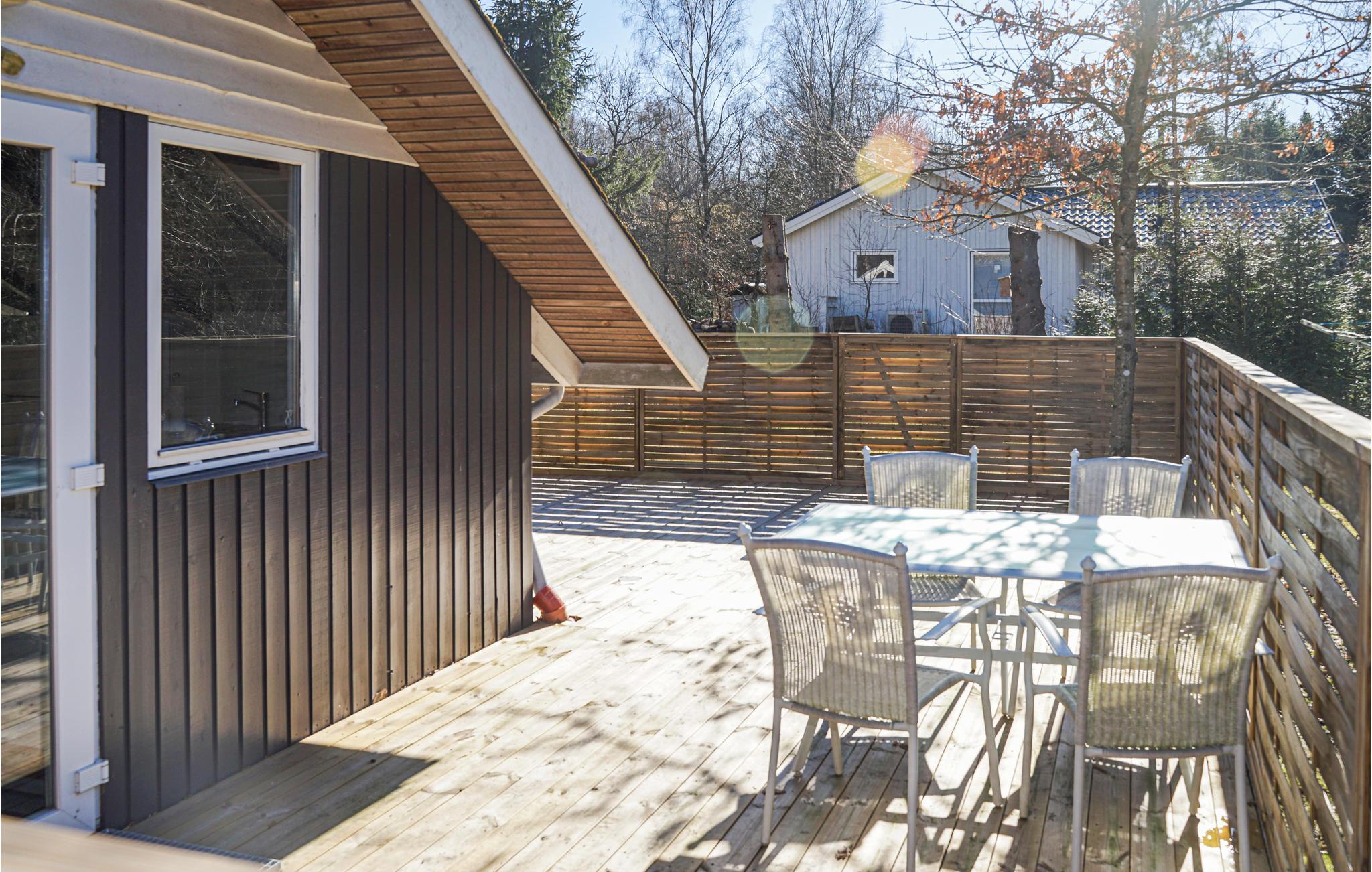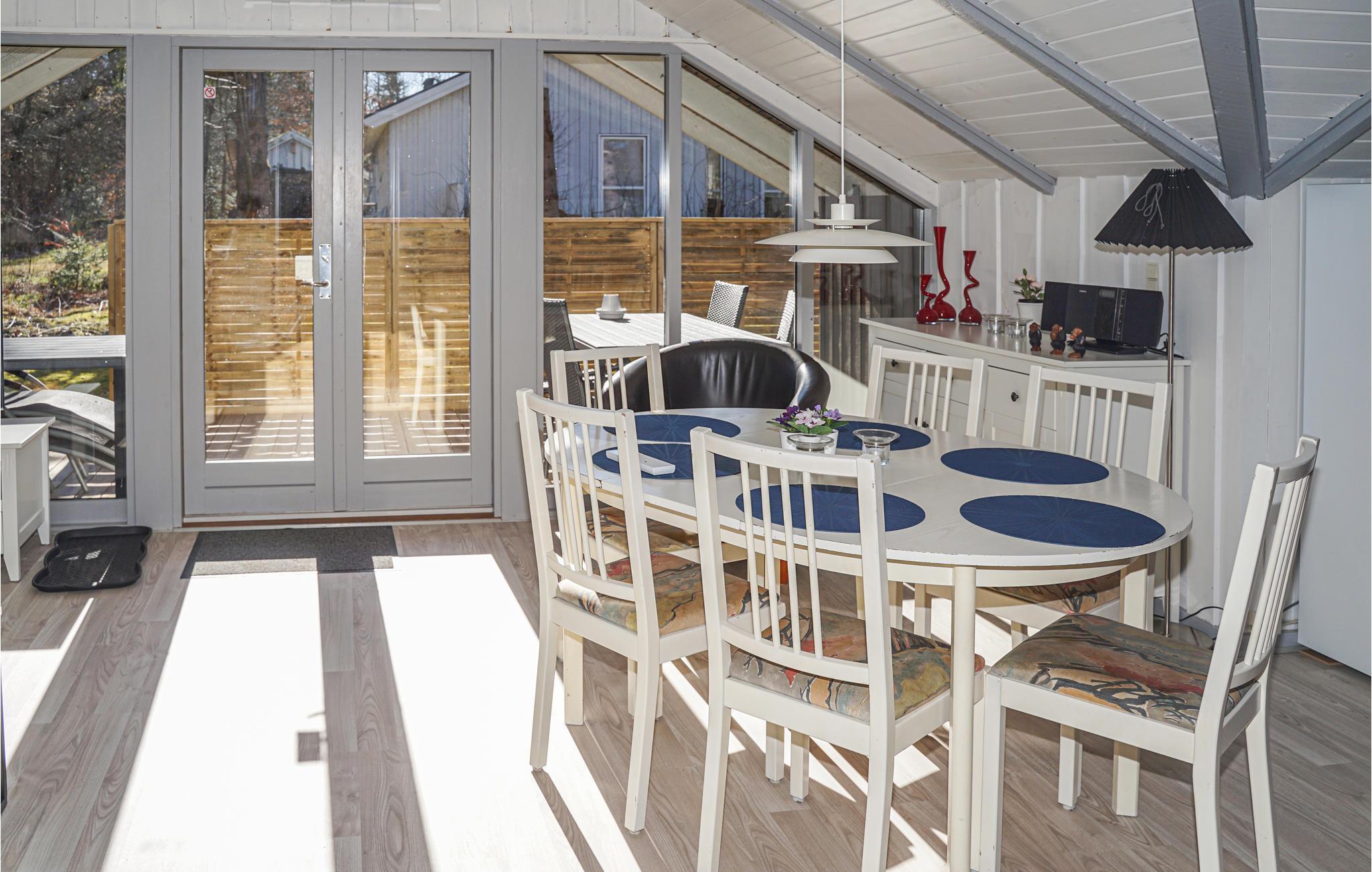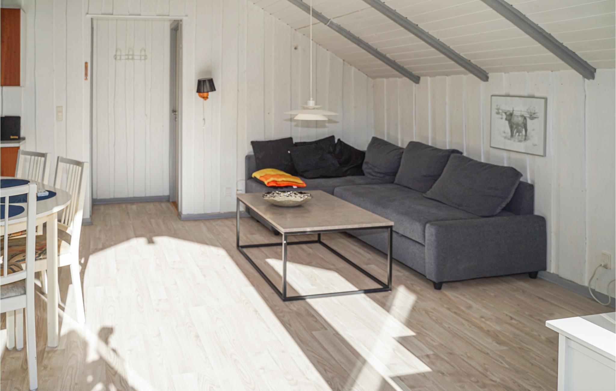 Sommerhuset fremstår meget lyst og indbydende, og fra det hyggelige, veludstyrede køkken-alrum med opvaskemaskine, er der direkte udgang til en delvist overdækket terrasse. Glæd jer til at nyde mange gode stunder på den store træterrasse, hvor I altid kan finde et godt sted med læ. I huset findes to gode soveværelser - i det ene står en elevationsseng. Der er desuden mulighed for opredning til 2 personer på en god sovesofa.