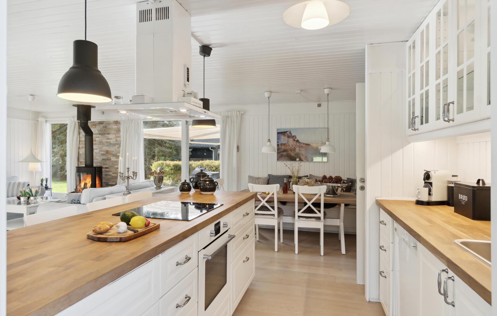 Velkommen til dette skønne træhus, som byder jer velkommen med et smagfuldt samspil af lyse farver og kærligt indrettede rum. Her kan I nyde jeres familietid og lægge den hektiske hverdag bag jer. Det åbne opholdsrum forbinder afslapning i sofaerne, fælles madlavning i det åbne køkken og familietid med lækker mad og leg ved spisebordet. Om morgenen kan I vælge jeres yndlingsterrasse og nyde en kop te eller kaffe udenfor. I mellemtiden kan jeres børn allerede tumle rundt i haven og gynge.