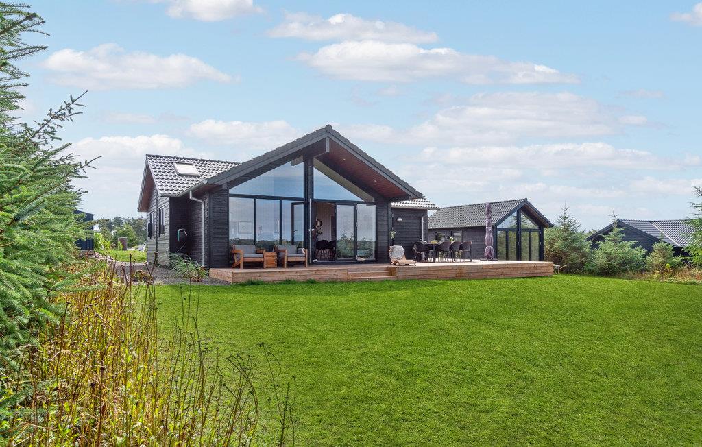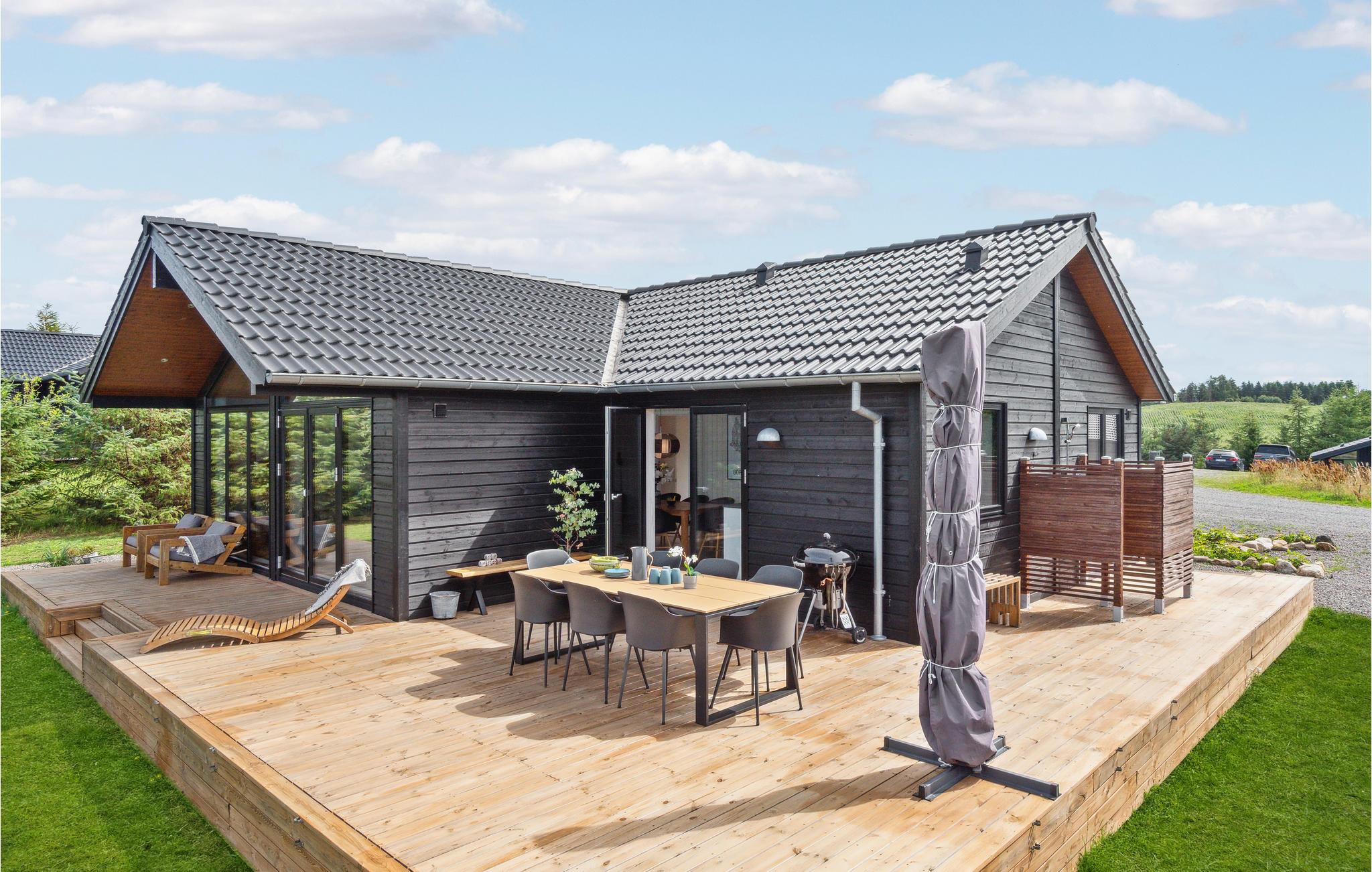 Luksuriøst feriehus på naturgrund nær børnevenlig sandstrand og med stor terrasse og oplader til elbil.