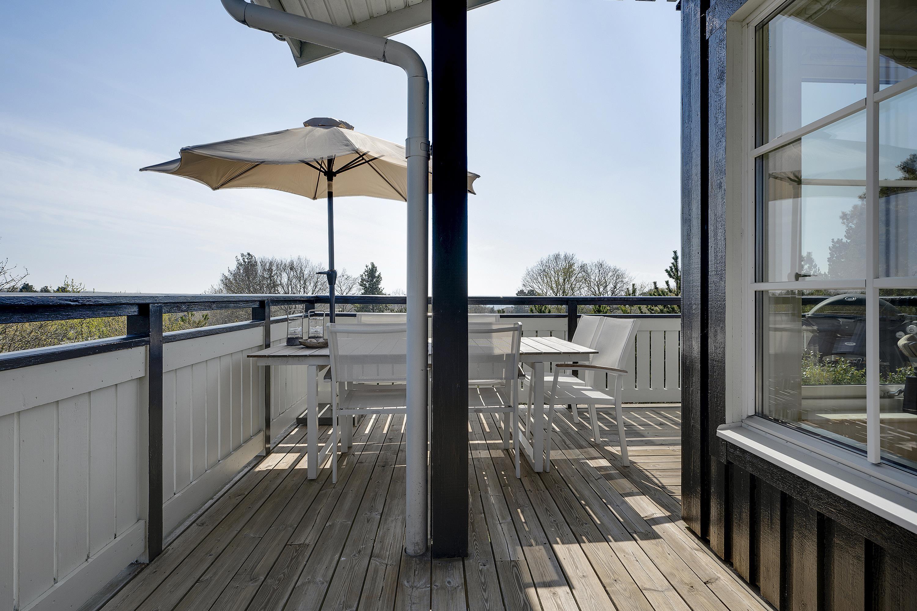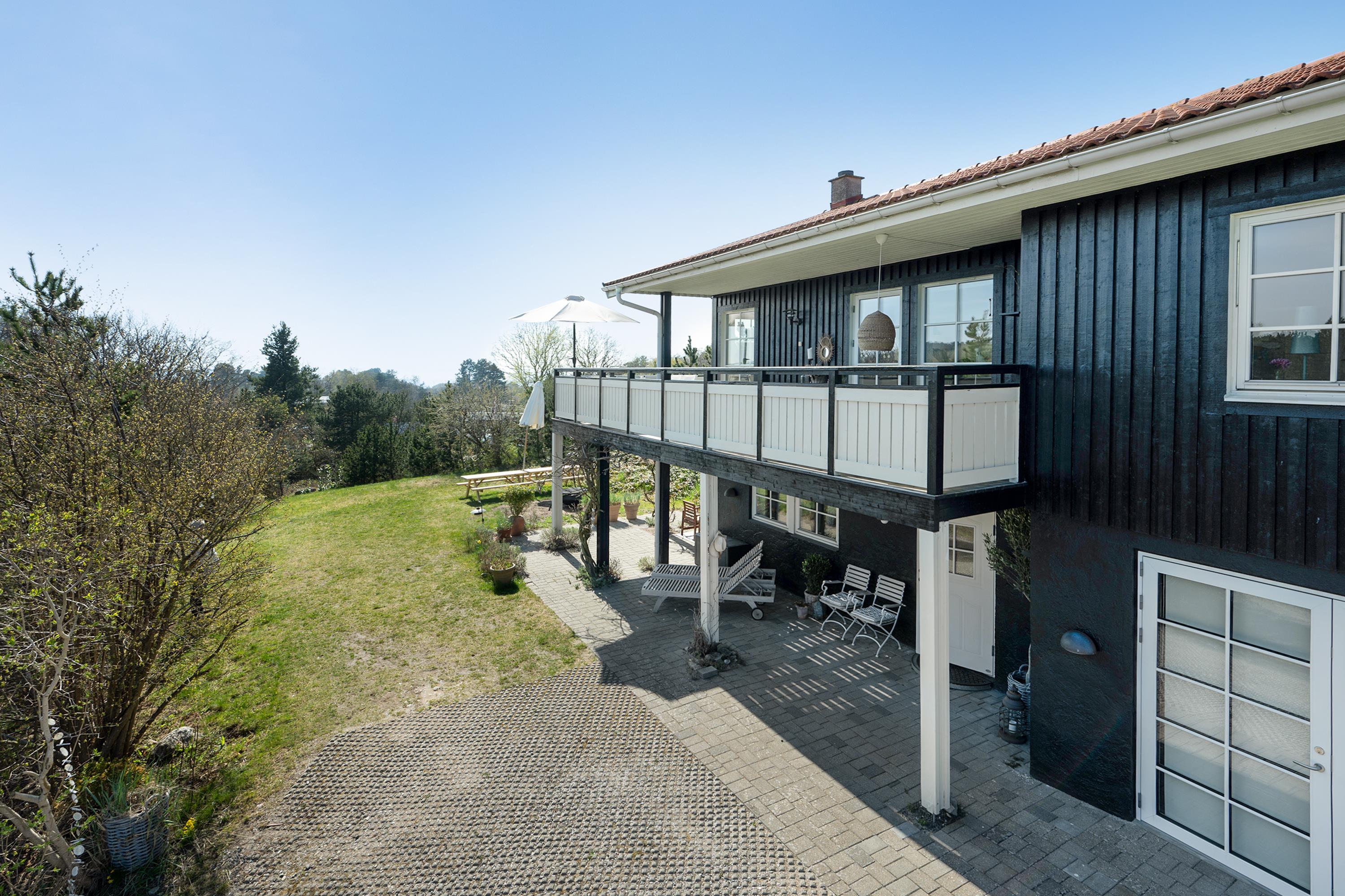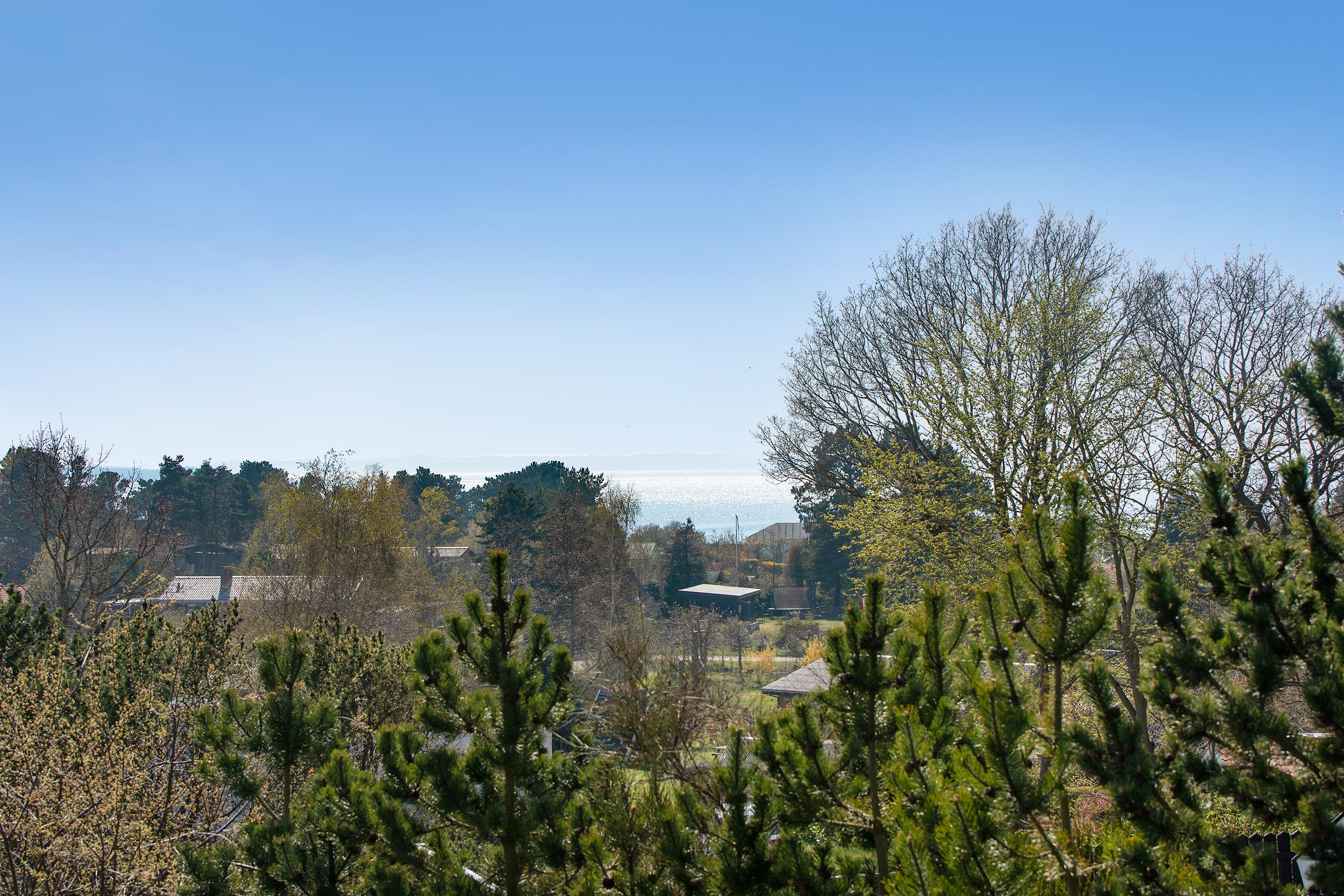 Nyere og ualmindelig dejligt feriehus i 2 plan højt beliggende på opvokset naturgrund i eftertragtet område i det nordlige Ebeltoft. I stueplan er der stor, delvist overdækket fliseterrasse, og 1. sal har udgang til stor, vest- og sydvendt træterrasse med den skønneste udsigt over Ebeltoft Vig og Mols Bjerge. Der er havemøbler, liggestole, parasol og grill, og på selve grunden finder man en skøn bålplads. Et helt usædvanligt velbeliggende og lækkert hus med en næsten sydlandsk stemning, som desuden er energivenligt.