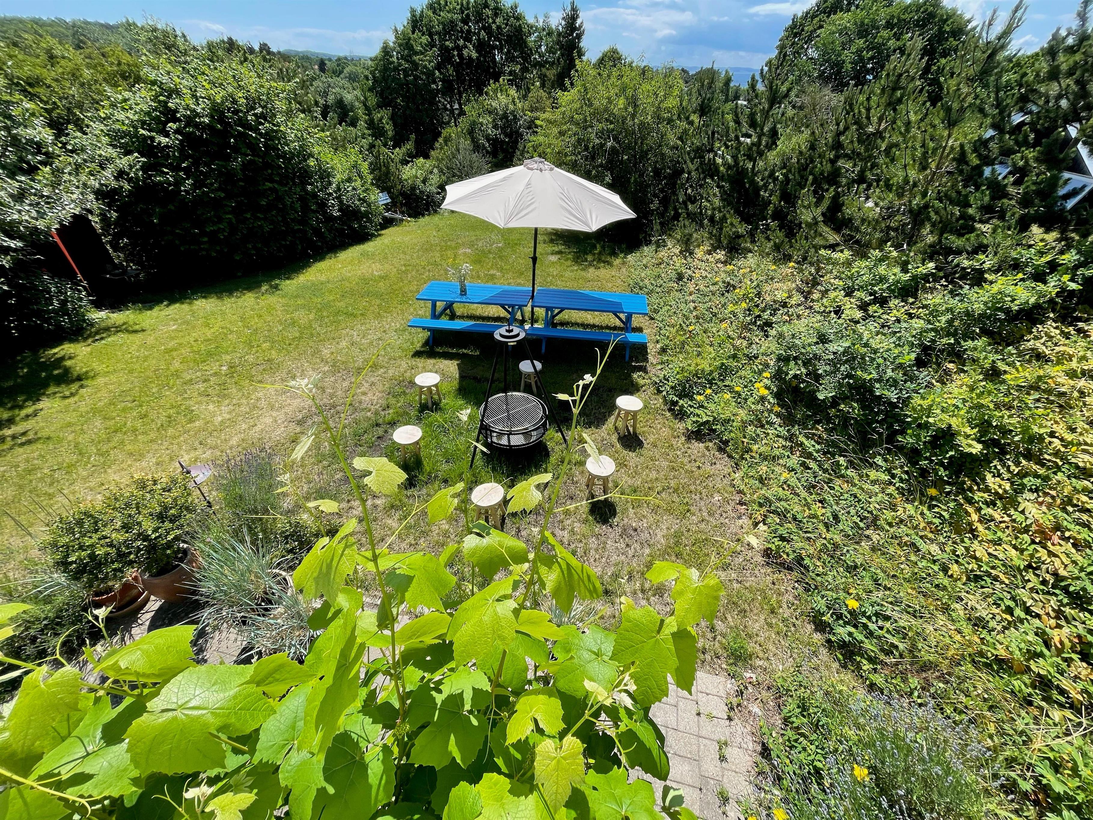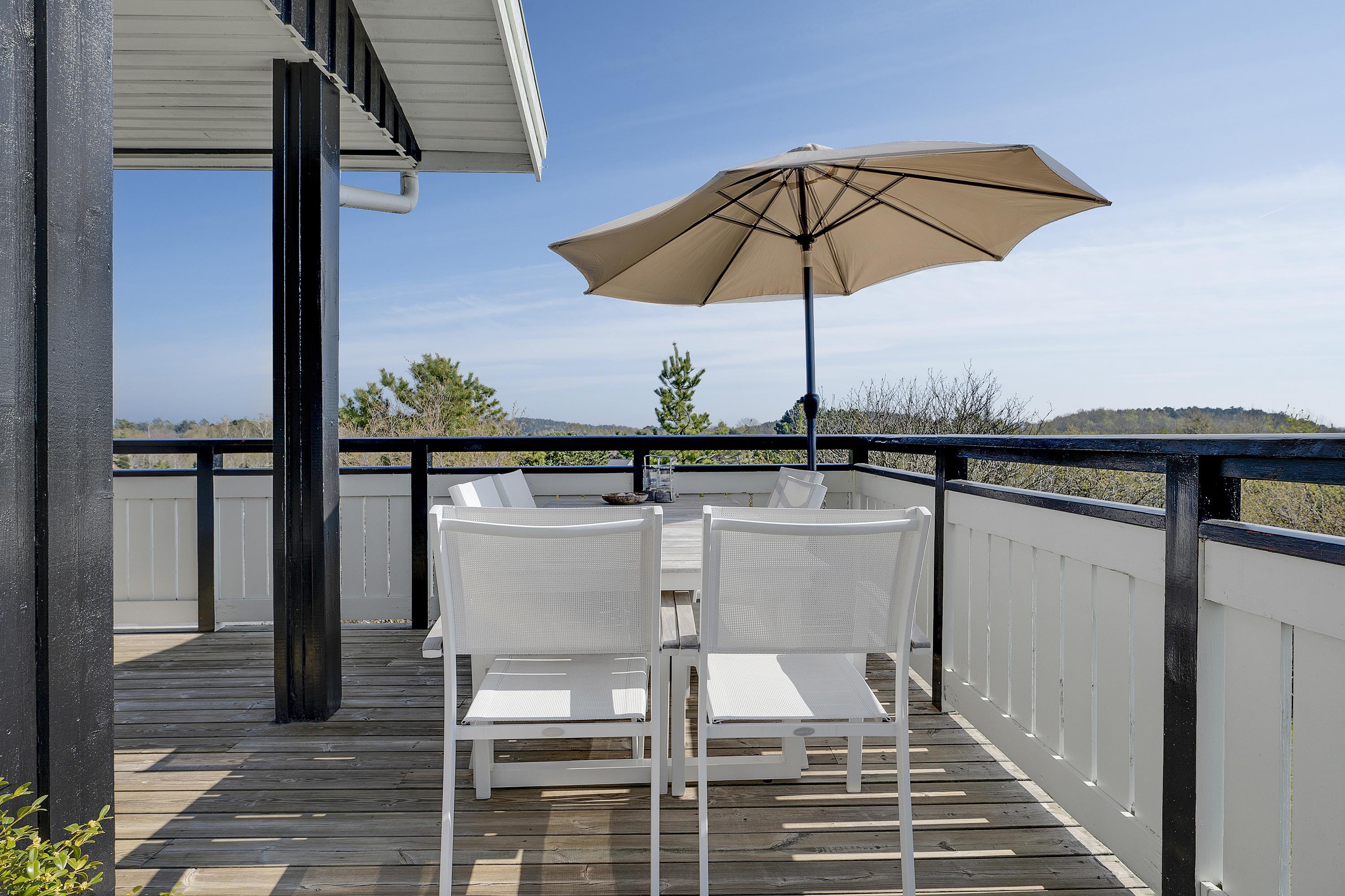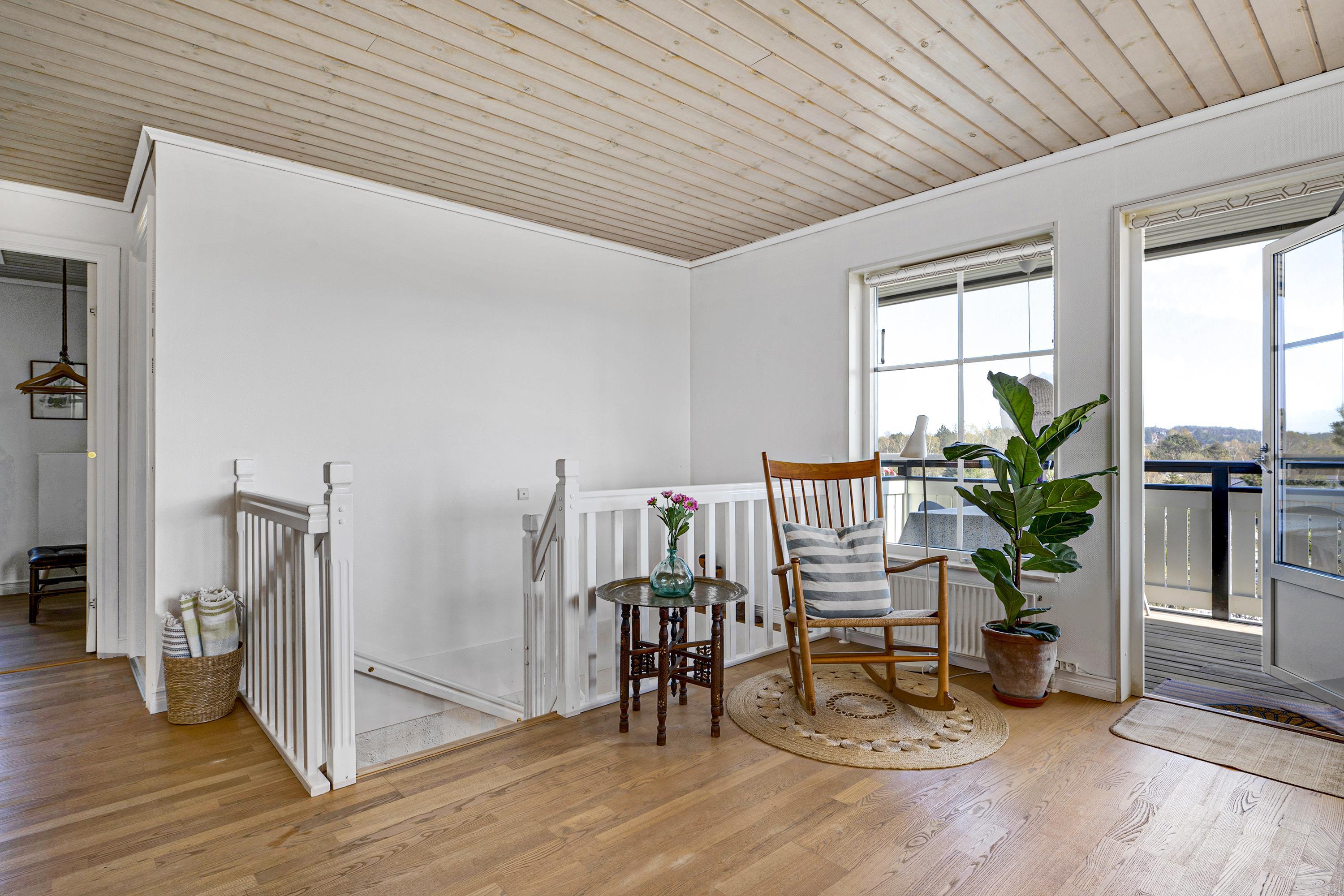 Nyere og ualmindelig dejligt feriehus i 2 plan højt beliggende på opvokset naturgrund i eftertragtet område i det nordlige Ebeltoft. I stueplan er der stor, delvist overdækket fliseterrasse, og 1. sal har udgang til stor, vest- og sydvendt træterrasse med den skønneste udsigt over Ebeltoft Vig og Mols Bjerge. Der er havemøbler, liggestole, parasol og grill, og på selve grunden finder man en skøn bålplads. Et helt usædvanligt velbeliggende og lækkert hus med en næsten sydlandsk stemning, som desuden er energivenligt.