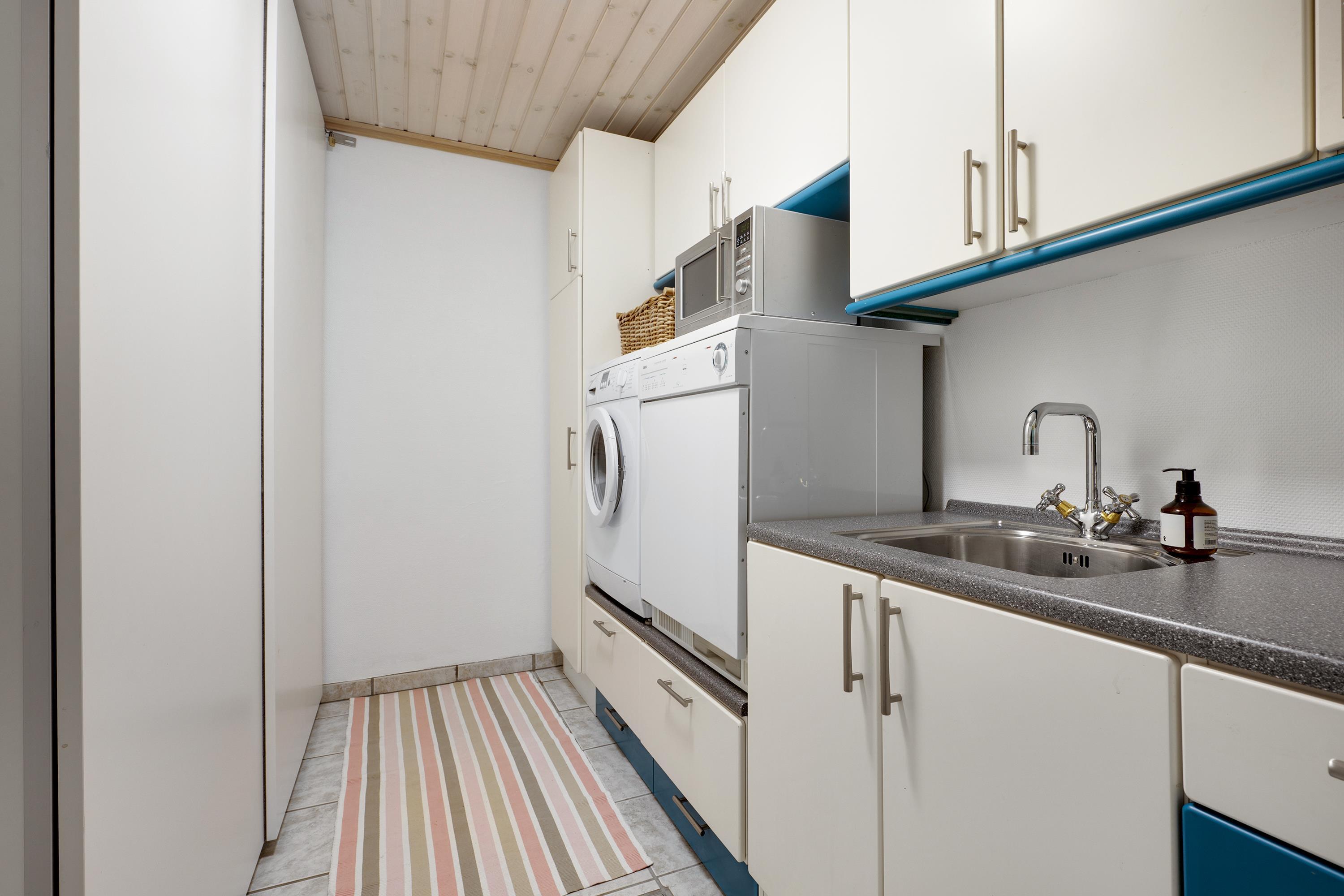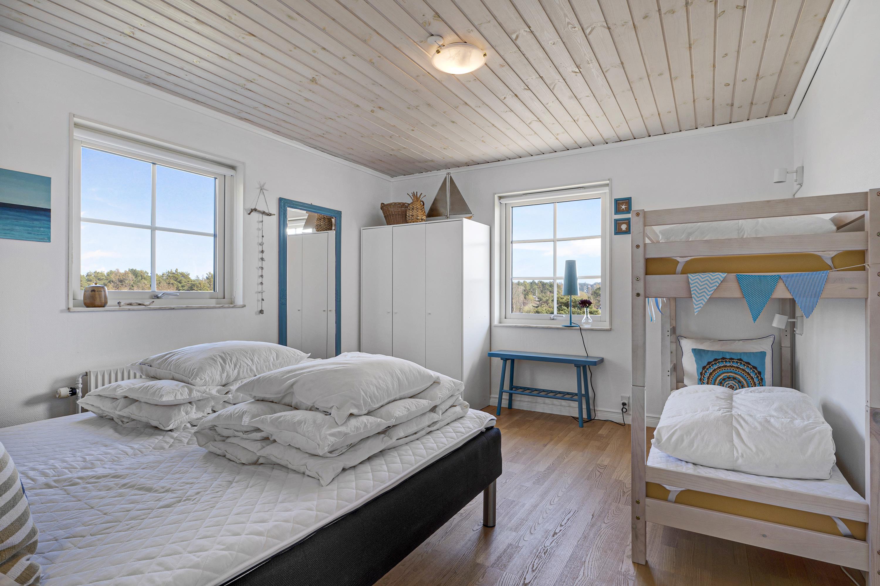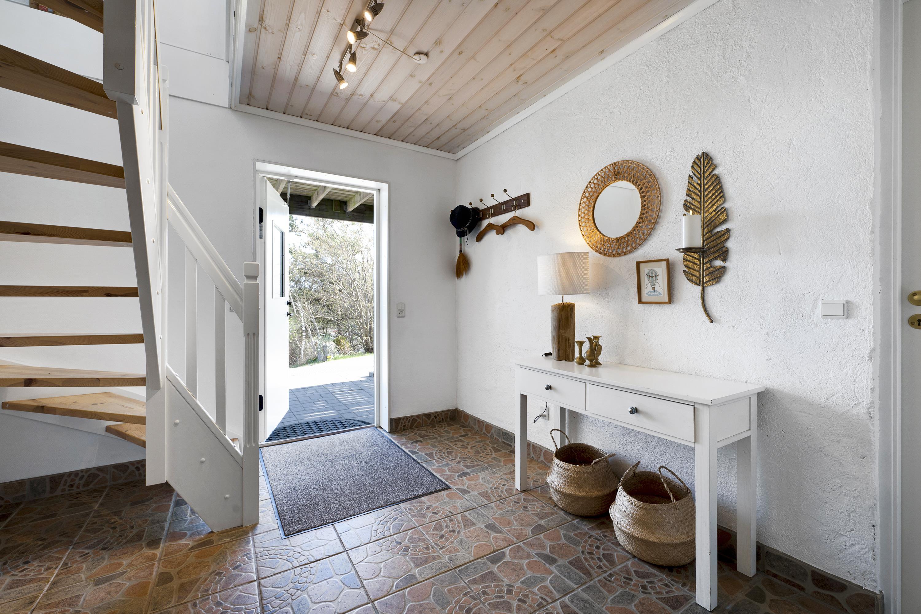 I stueplan er der stor, klinkebelagt hall med indgang til spa-badeværelse og bryggers samt trappe til 1. sal, hvor man kommer ind i stor, lys stue/alrum i åben forbindelse med køkken og udgang til terrasse. Her er god spiseplads til 6 personer og dejlig sofa-afdeling med TV med danske (inkl. TV2) og tyske kanaler. Det helt nye, velindrettede køkken med god arbejdsplads har keramiske kogeplader, ovn, køle-/fryseskab, opvaskemaskine og mikrobølgeovn. De 6 sovepladser fordeler sig på 1 meget stort soveværelse, ”havværelset”, med dobbeltseng og køjeseng samt et lidt mindre værelse, ”skovværelset”, med 2 enkeltsenge. Huset råder over 2 badeværelser – et skønt, nyt badeværelse med bruseniche, bidet og skabsarrangement på 1. sal og i stueplan et ligeledes nyt badeværelse med spabad og bruser. Gulvvarme i begge vådrum. Desuden er der bryggers med vaskemaskine, tørretumbler, strygebrædt og strygejern i stueplan.. Internetadgang.