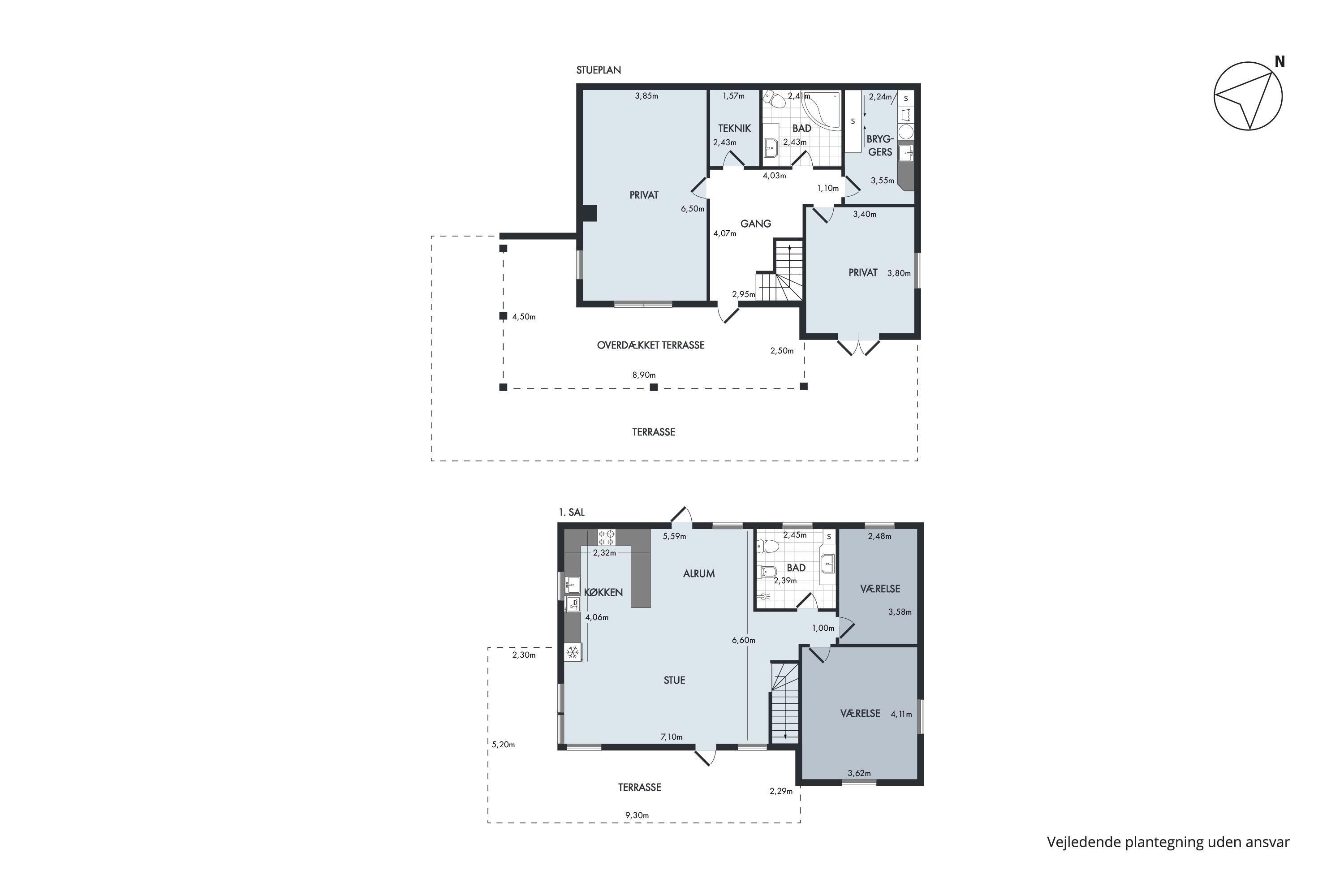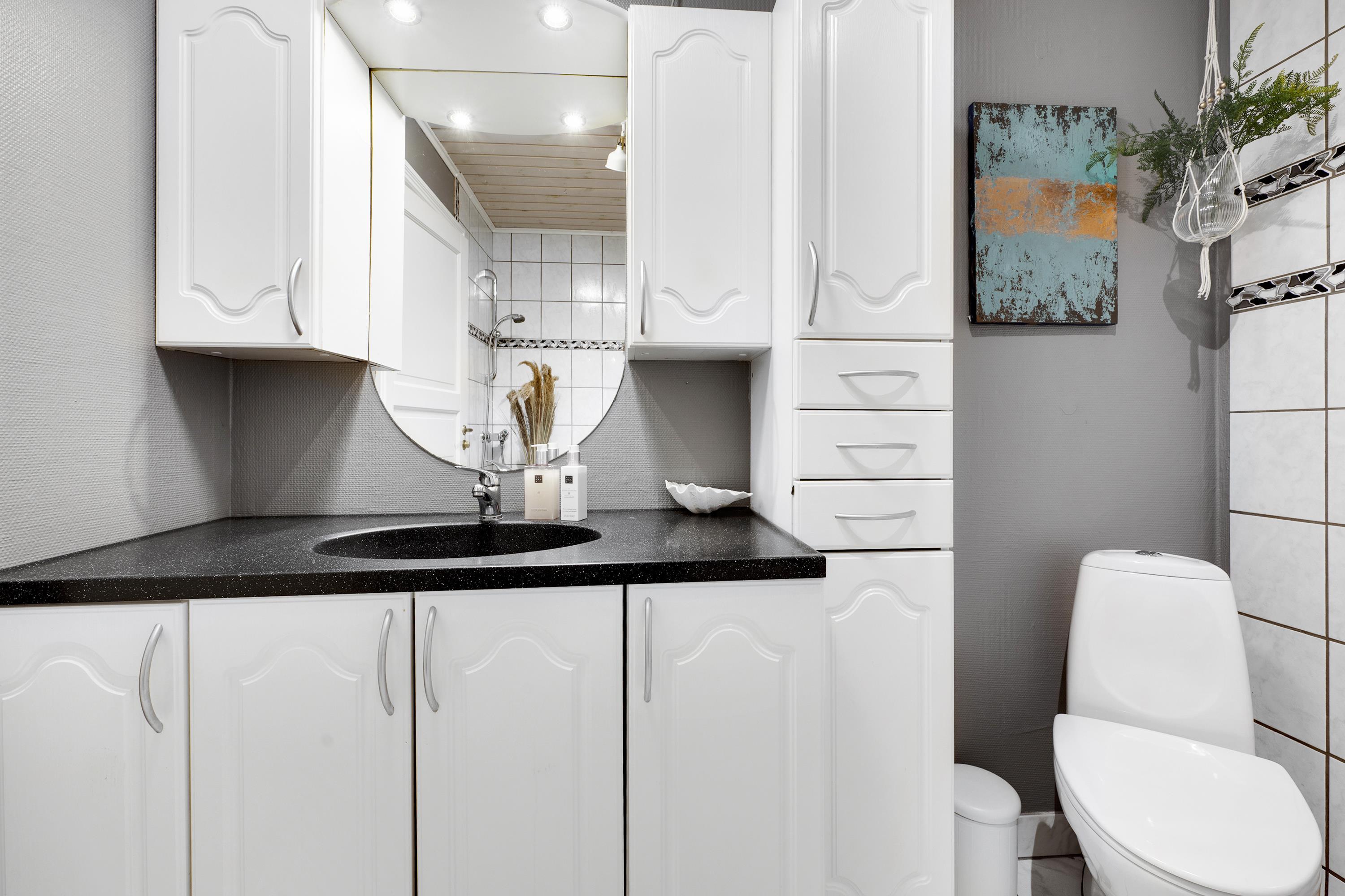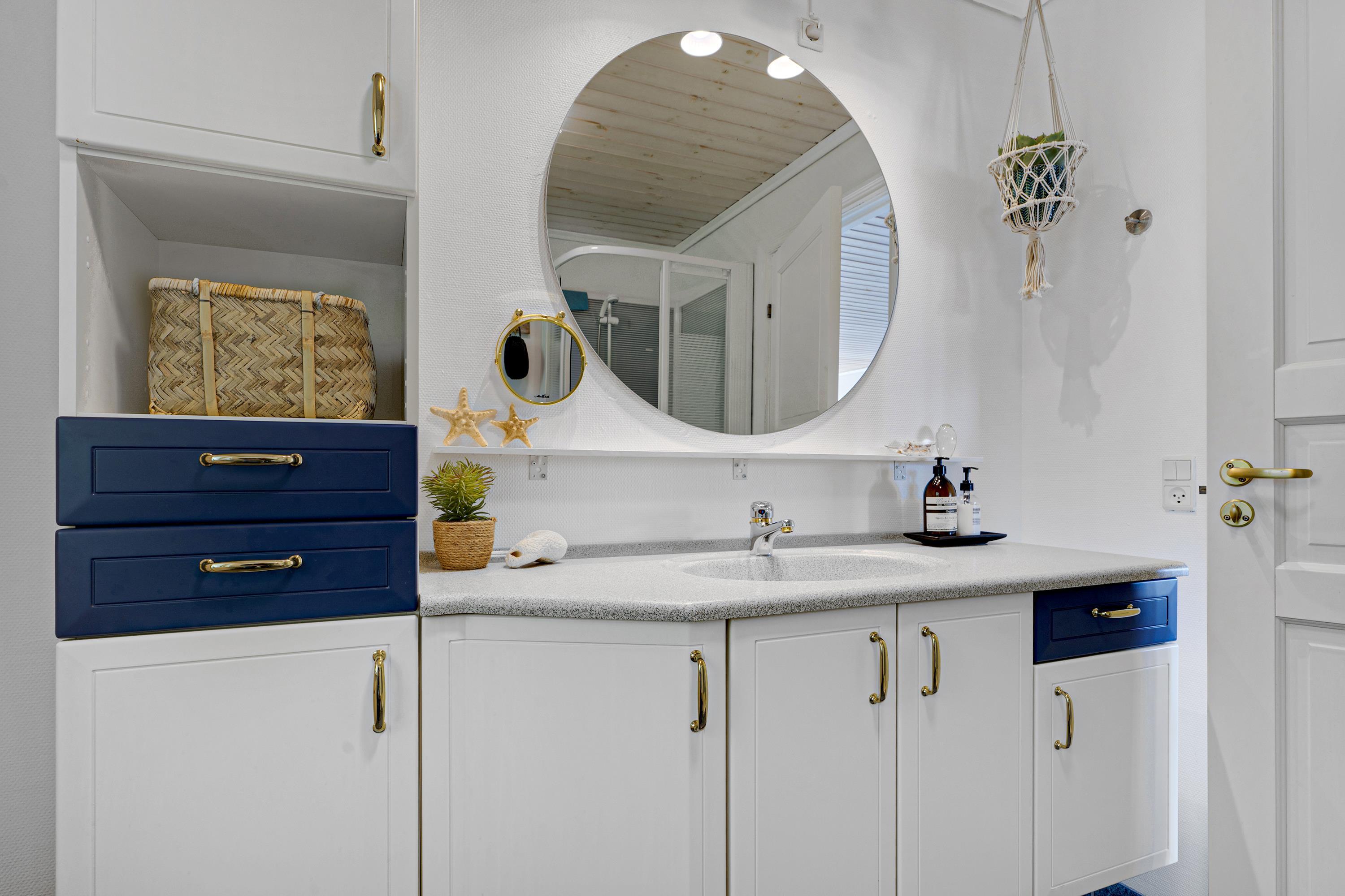 I stueplan er der stor, klinkebelagt hall med indgang til spa-badeværelse og bryggers samt trappe til 1. sal, hvor man kommer ind i stor, lys stue/alrum i åben forbindelse med køkken og udgang til terrasse. Her er god spiseplads til 6 personer og dejlig sofa-afdeling med TV med danske (inkl. TV2) og tyske kanaler. Det helt nye, velindrettede køkken med god arbejdsplads har keramiske kogeplader, ovn, køle-/fryseskab, opvaskemaskine og mikrobølgeovn. De 6 sovepladser fordeler sig på 1 meget stort soveværelse, ”havværelset”, med dobbeltseng og køjeseng samt et lidt mindre værelse, ”skovværelset”, med 2 enkeltsenge. Huset råder over 2 badeværelser – et skønt, nyt badeværelse med bruseniche, bidet og skabsarrangement på 1. sal og i stueplan et ligeledes nyt badeværelse med spabad og bruser. Gulvvarme i begge vådrum. Desuden er der bryggers med vaskemaskine, tørretumbler, strygebrædt og strygejern i stueplan.. Internetadgang.