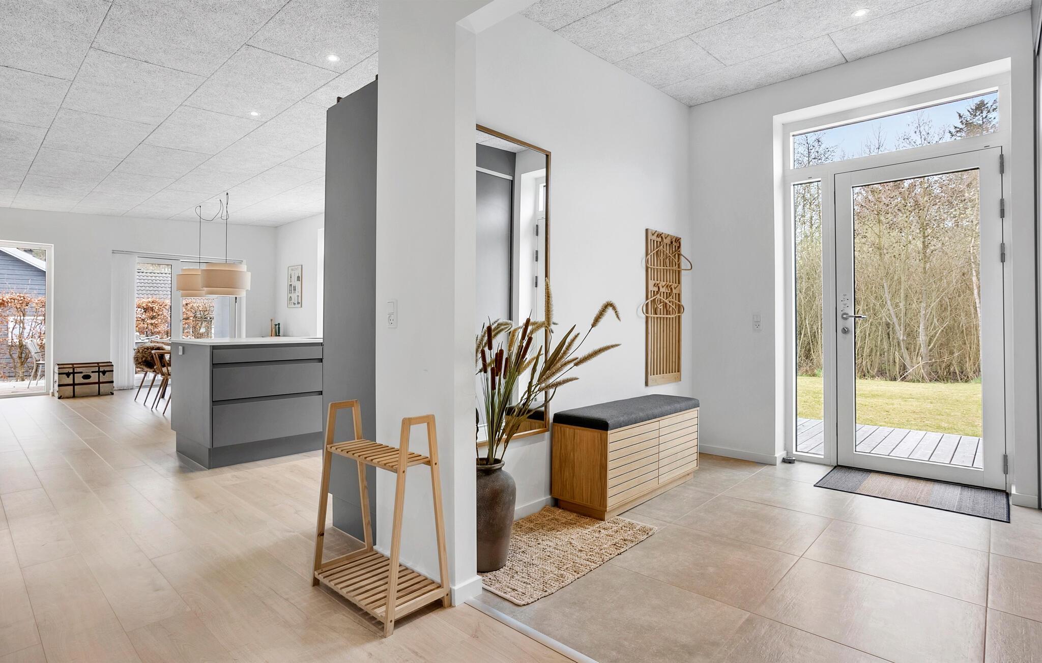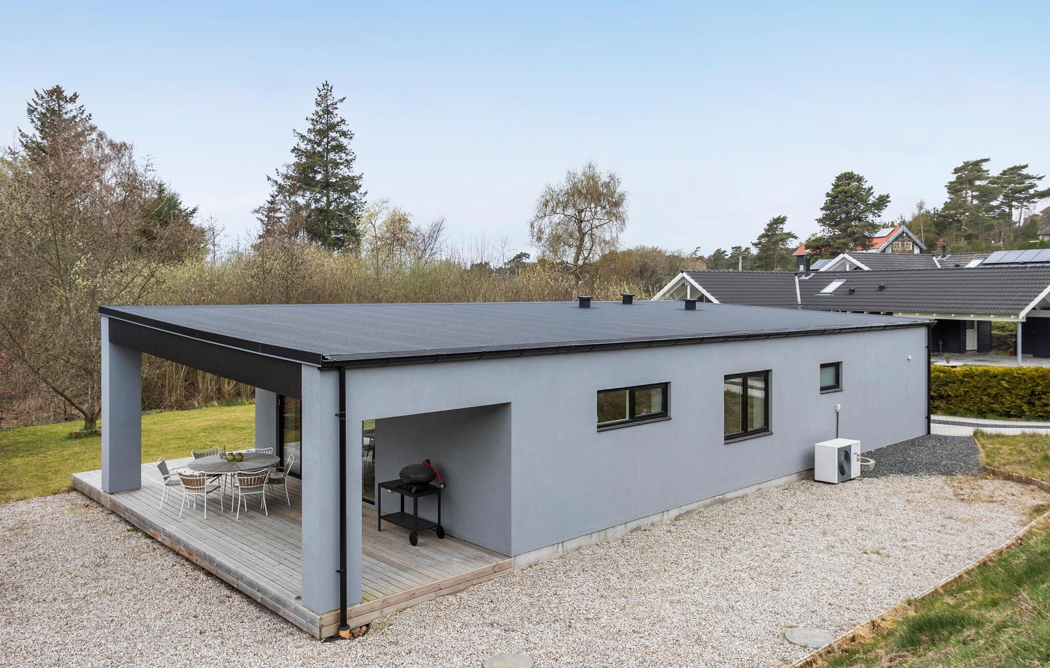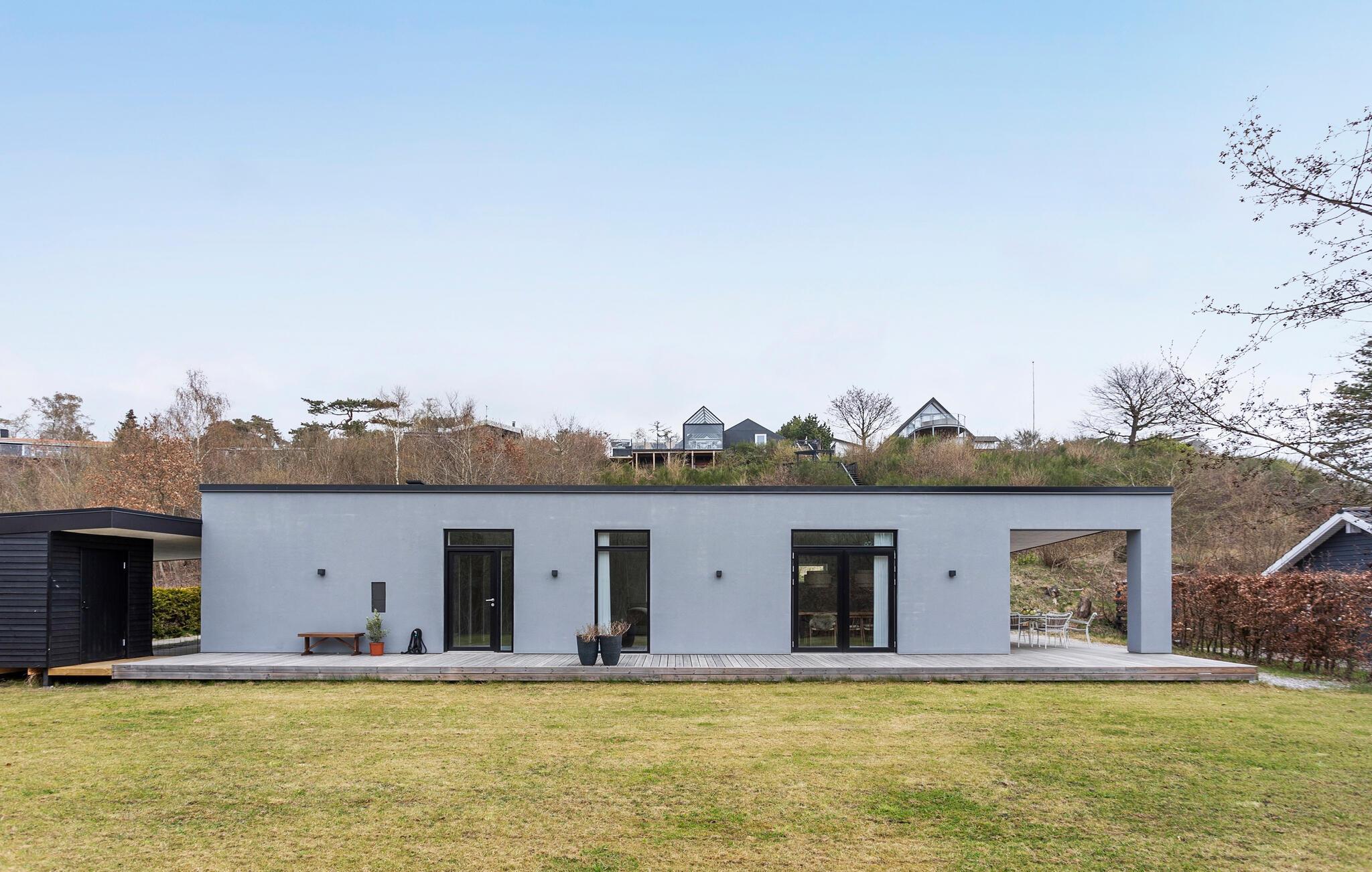 Moderne sommerhus ved Vibæk Strand med terrasse, have og nærhed til strand og by.