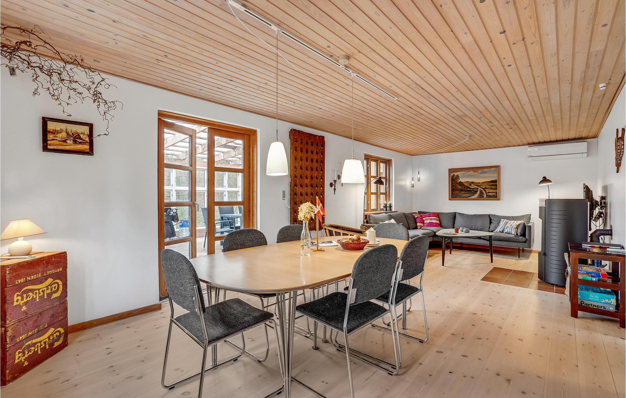 Velkommen på denne fredfyldte grund, hvor denne hyggelige ferievilla ligger placeret. Her kan I se frem til en hyggelig ramme om de rolige stunder, når I vender hjem fra dagens eventyr. Nyd dagens måltider rundt om det lange spisebord og læn jer senere godt tilbage i sofahjørnet, mens ilden knitrer stemningsfuldt i pilleovnen, som skaber en behagelig atmosfære på de kølige aftener.