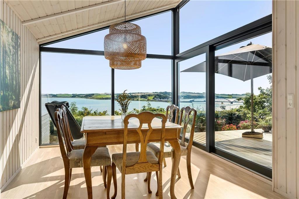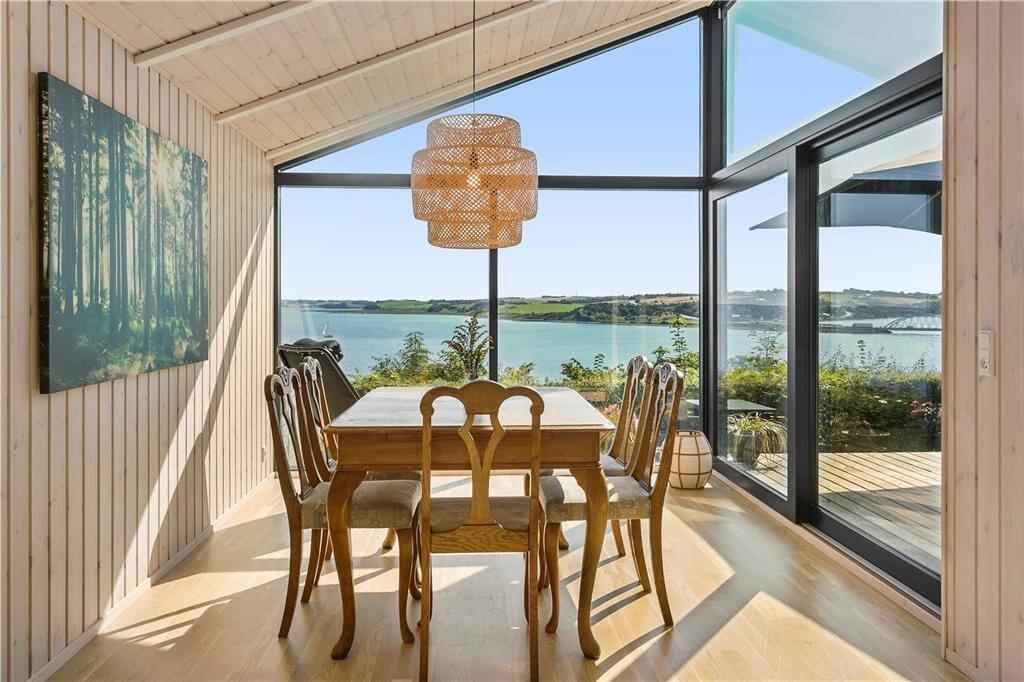 De skønne terrasser er uden tvivl en af de helt store kvaliteter ved dette hus. Foran huset er der en mindre vestvendt terrasse og mod syd et dejligt udendørs køkken. Mod vandsiden (sydøst) er der to store, solrige terrasser. Her kan I dase i liggestole og nyde den helt forrygende udsigt over Limfjorden mod øen Mors.