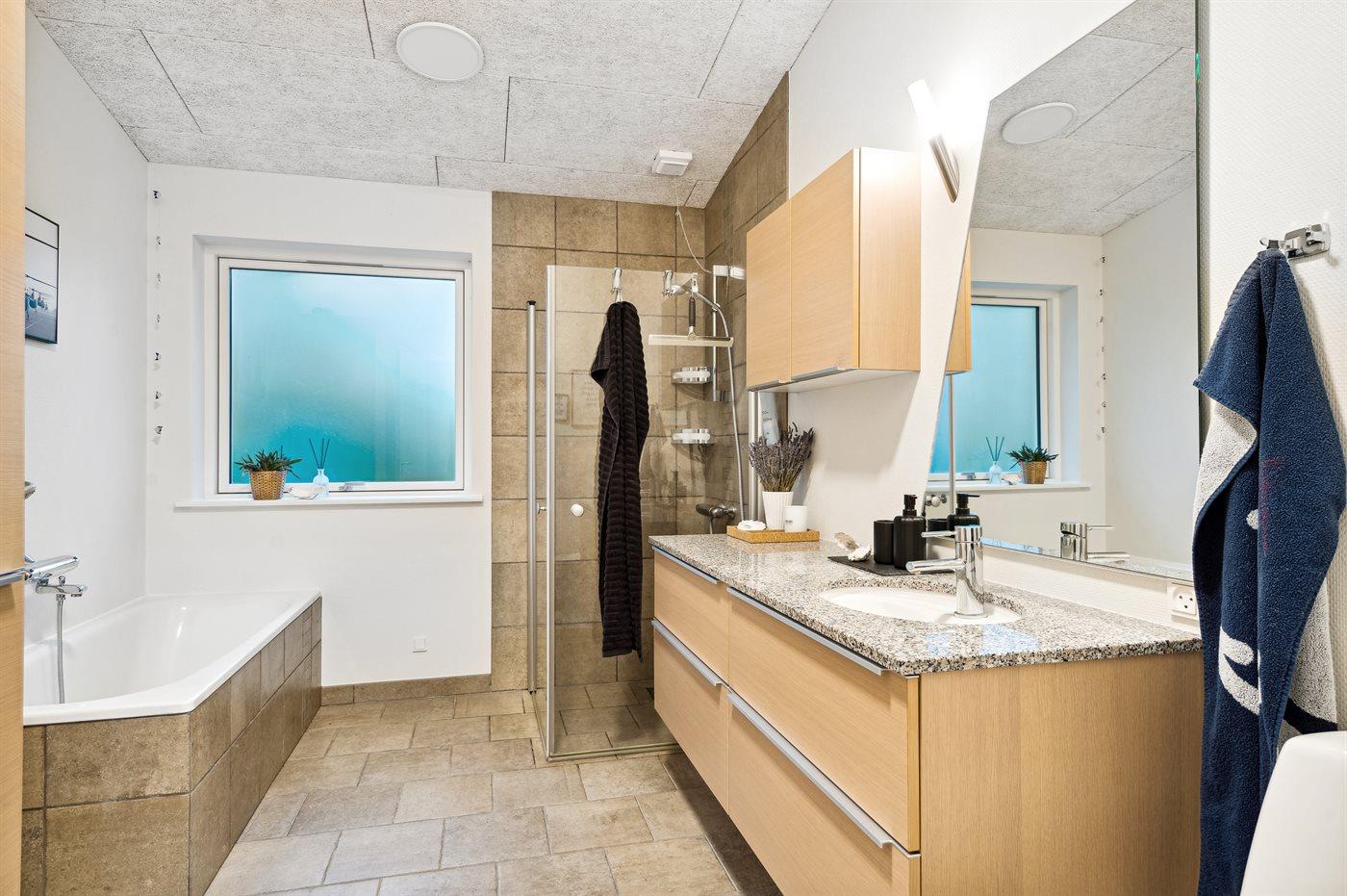Der er 1 badeværelse med gulvvarme, bruseniche og badekar.