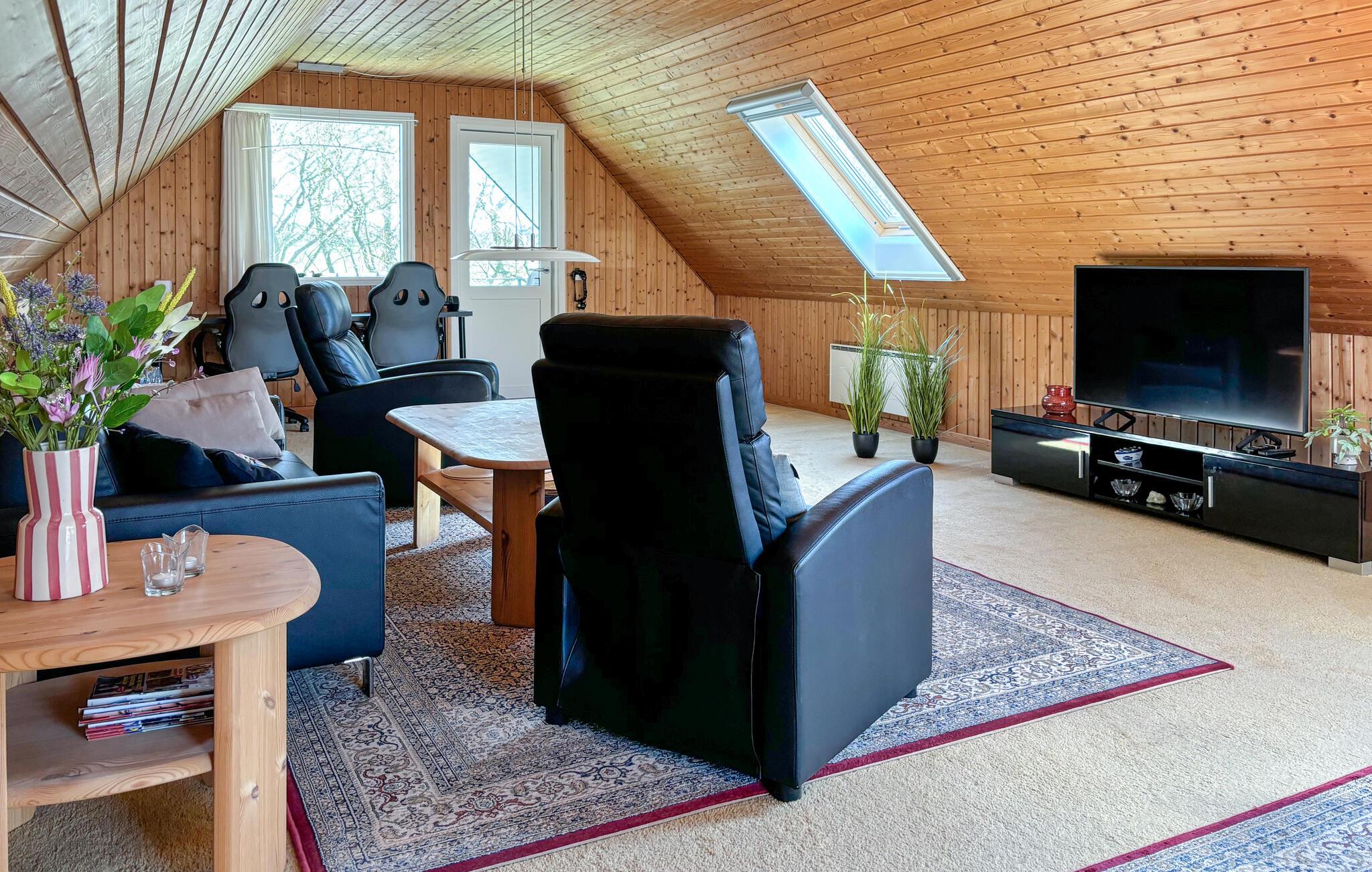 Med sin rummelige planløsning, børnevenlige have og varme møblering tilbyder Dette feriehus de bedste betingelser for afslappende dage med familien. Gør det behageligt i stuen ovenpå og se en god film. snup et spil sammen ved bordet, kig på det grønne eller diskuter jeres ferieplaner. Nede i det åbne køkken finder I masser af plads til madlavning, og spisebordet lægger op til lange måltider og gode samtaler.
