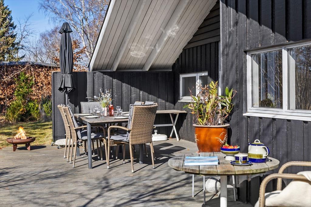 Fra stuen er der direkte udgang til den delvist overdækkede terrasse, hvor morgenkaffen kan nydes i ro, og hvor aftensmaden kan trække ud, mens lyset langsomt ændrer sig over haven. Her er plads til både leg og afslapning, og i den ene ende står gyngestativet klar til dagens små eventyr.