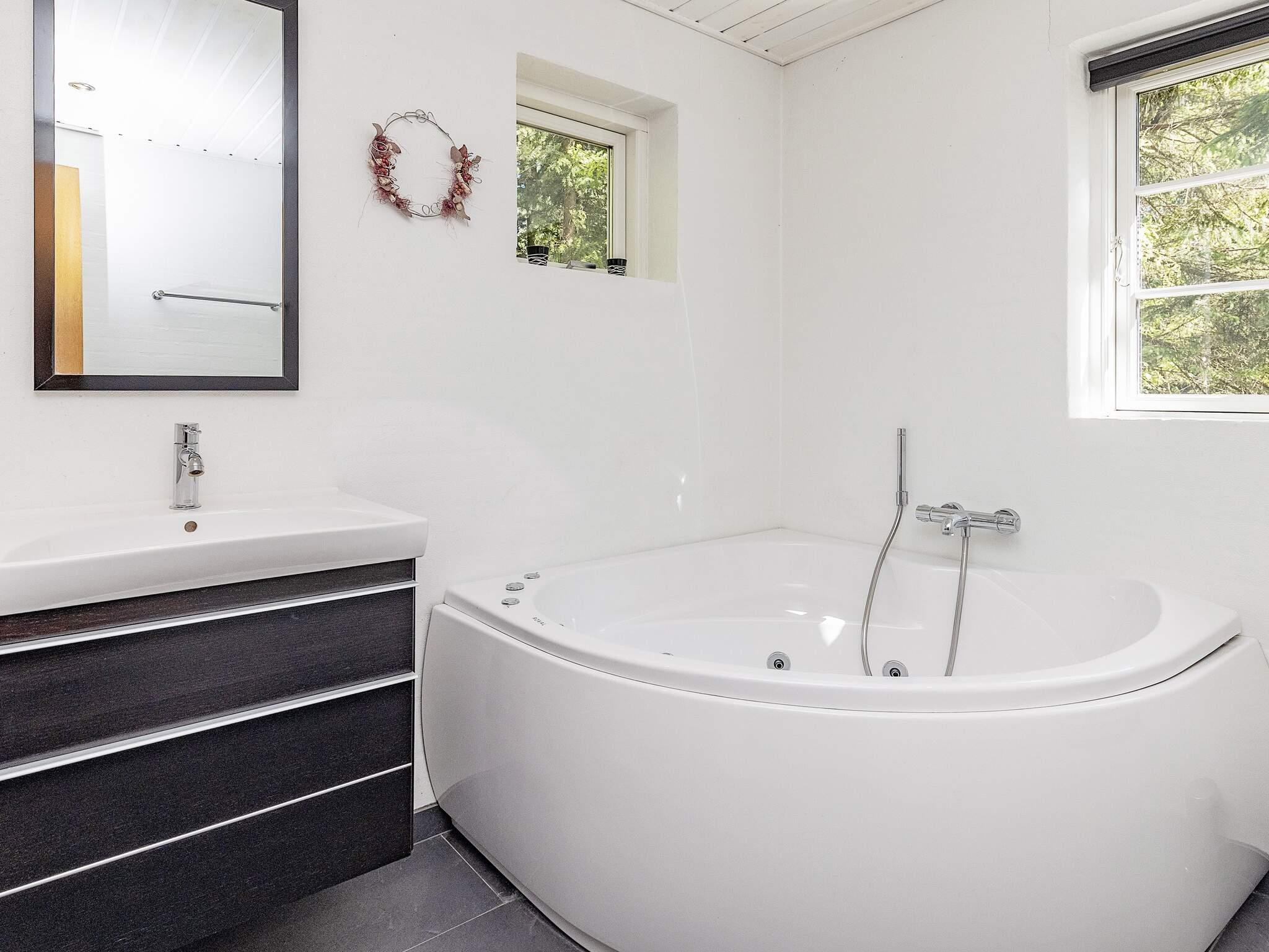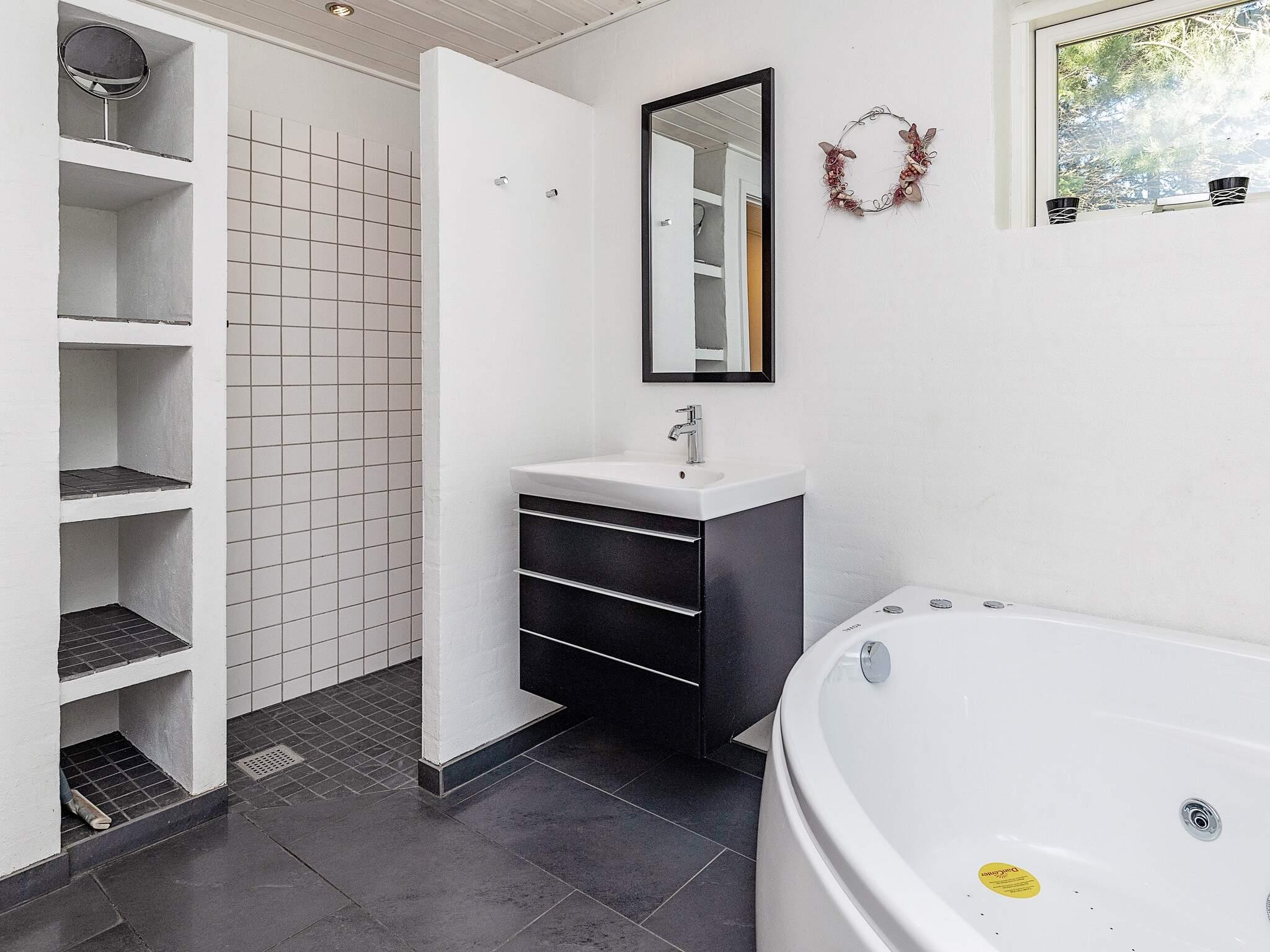 Ved Virksund finder I dette sommerhus med spabad. Fra den rummelige entre åbner man op til det store fællesrum hvor køkken, spisestue og stue er samlet i et. I stueafdelingen er den lille brændeovn og ved spisepladsen er der en stor brændeovn. Lyst indrettet og med en fin udsigt fra alle vinduer til naturgrunden, som er omkranset af træer. Fra køkkenafdelingen er der adgang til soveafdelingen med værelse med dobbeltseng, soveværelse med 2 enkeltsenge og et værelse med en stor dobbeltseng. Badeværelse med spabad, bruseniche og varme i gulvet.