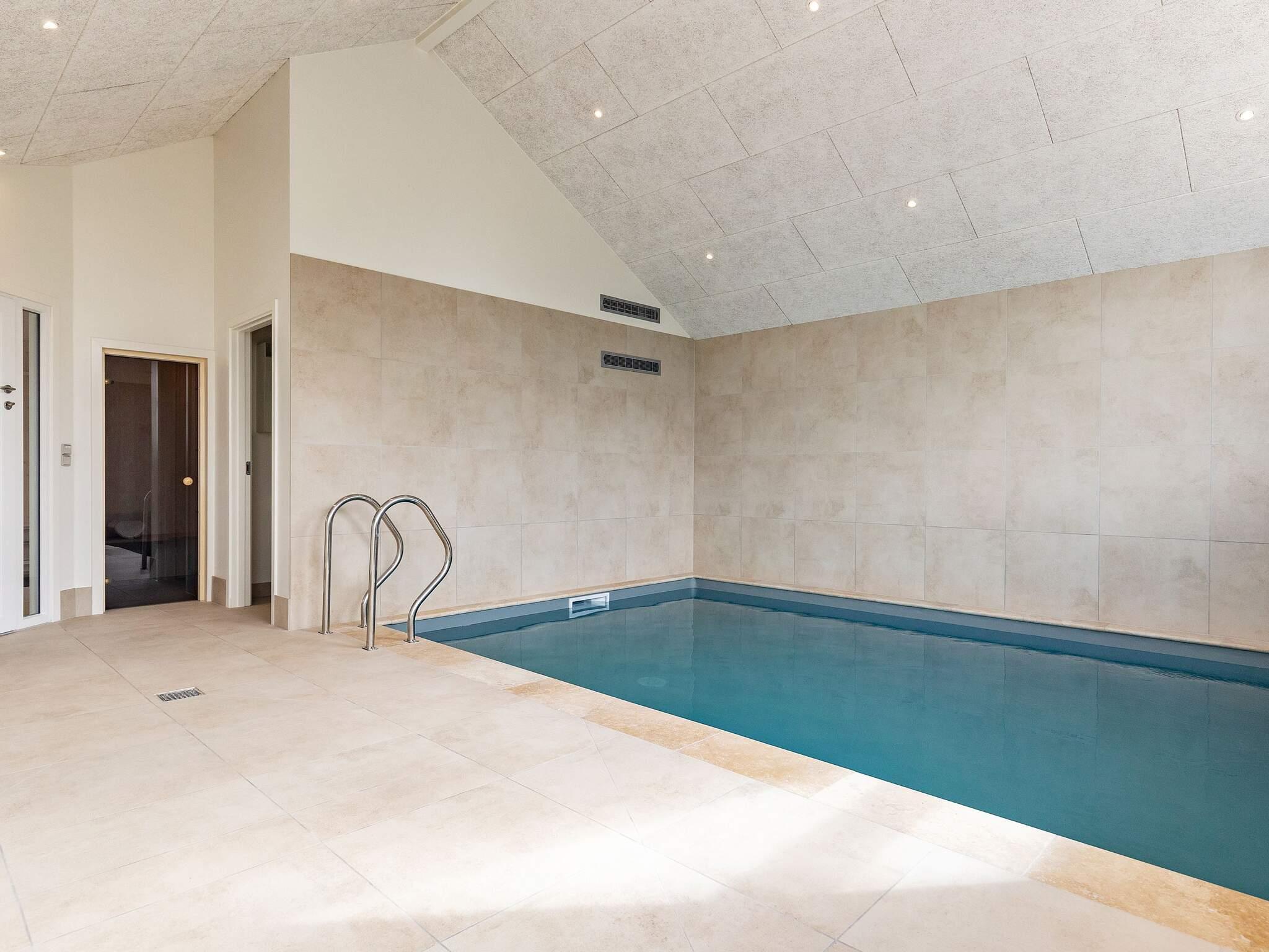 Til sommerhusets svømmehal/wellness område hører et 18 m2 stort bassin, som samtidig er saltvandssvømmebassin, der kræver minimal brug af kemikalier og undgår lugten af ??klor. Svømmehallen måler 4,8 x 3,70 x 1,50 m. Der er også en 4-personers sauna. Der er lyst badeværelse med badeplads, toilet, bruser og gulvvarme.