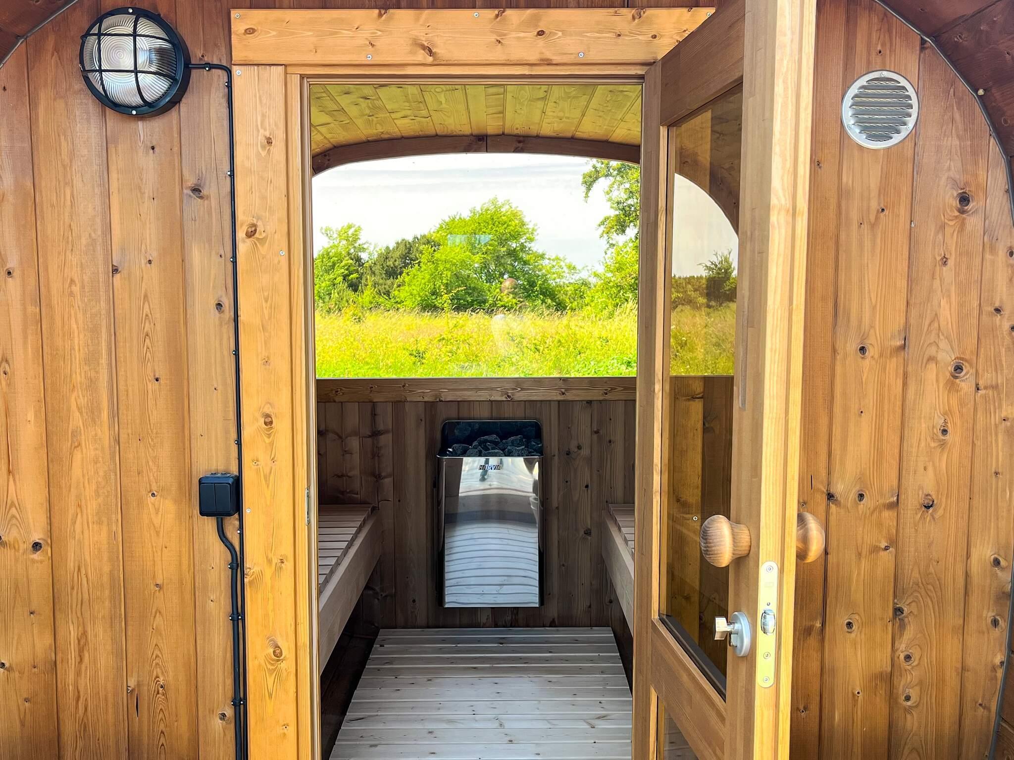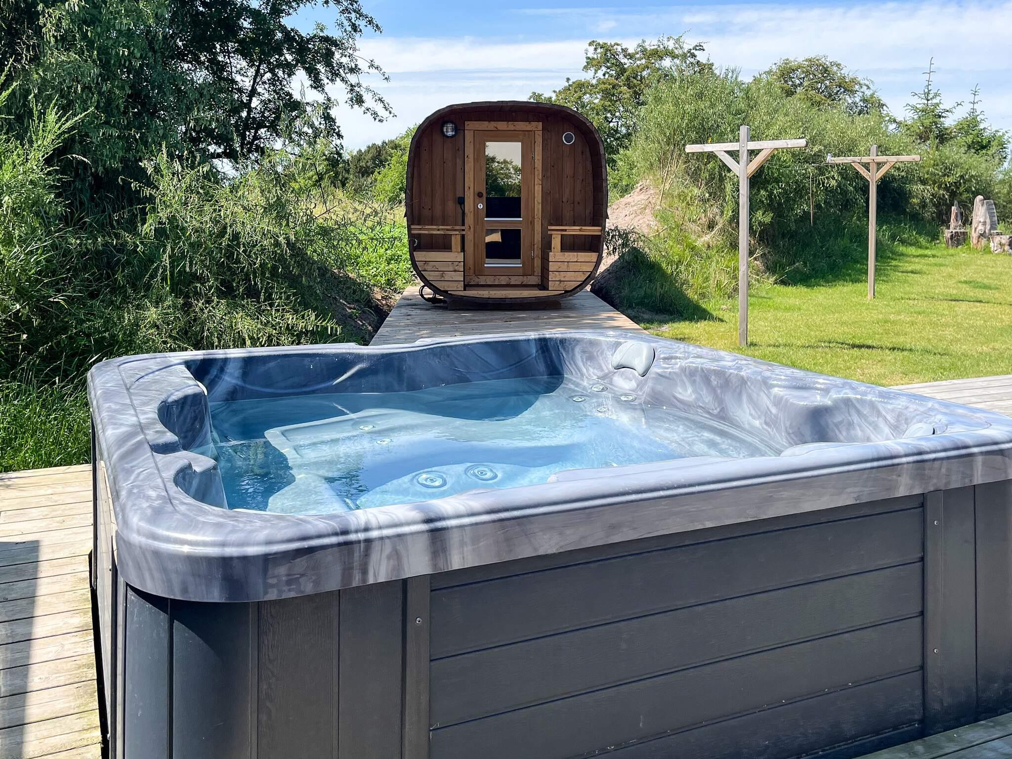 Der er direkte udgang til husets store træterrasse, hvor I finder husets udendørs spabad til 6 personer, som automatisk fyldes med vand fra husets swimmingpool og er derfor ca. 28 grader celsius og kan hurtigt opvarmes til den ønskede temperatur. Der er også en saunatønde og en udendørs bruser.