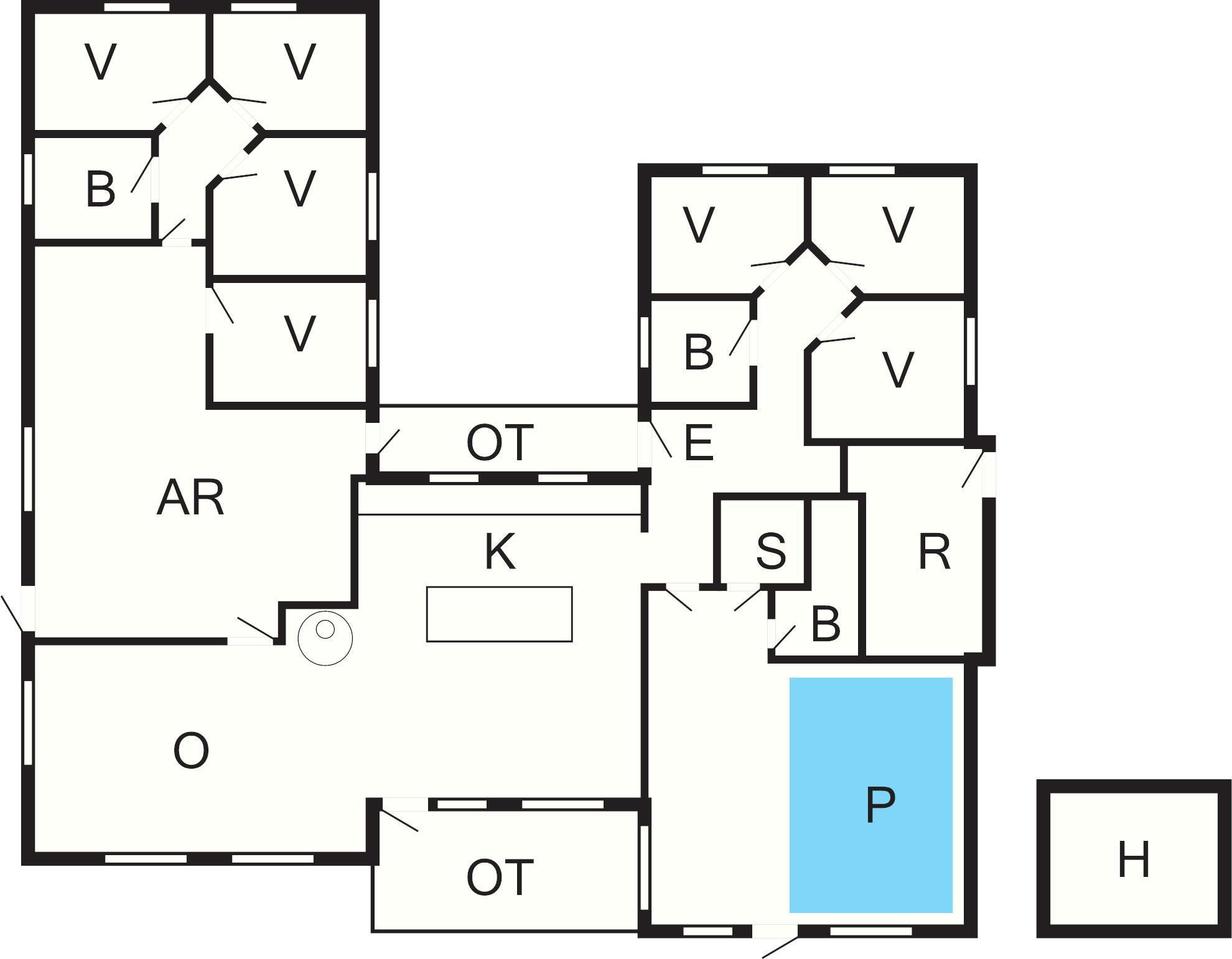 7 Soveværelser: (2S)+(2S)+(2S)+(2S)+(2S)+(2S)+(2S), barneseng