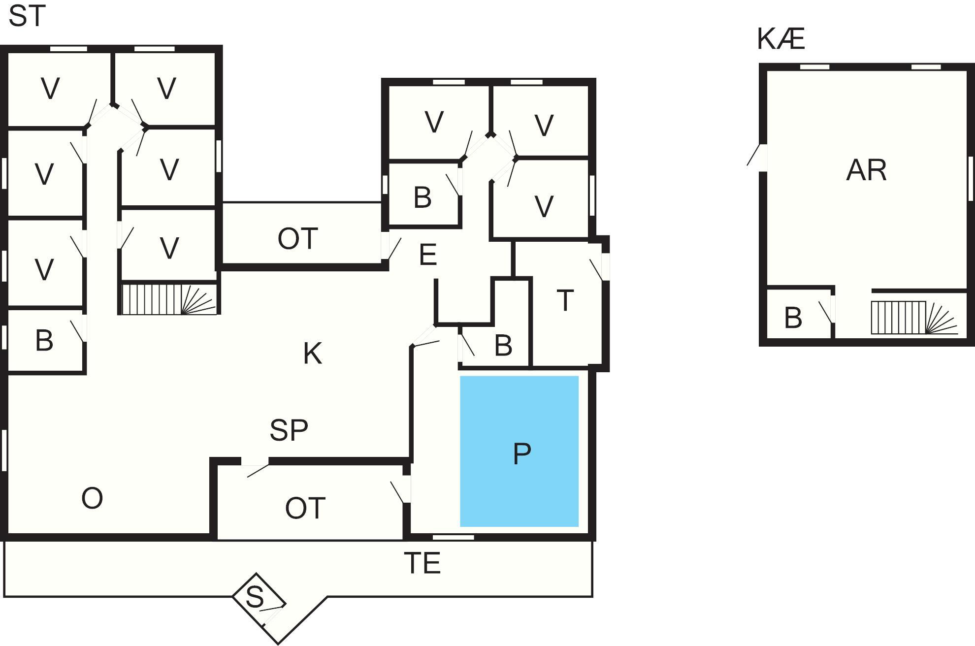 Sommerhusets svømmehal/wellnessområde byder blandt andet på en 19 m2 pool, som samtidig er en saltvandssvømmebassin, der kræver minimal brug af kemikalier og undgår lugten af ??klor. Svømmehallen måler 3,8 x 5,00 x 1,40 m. Der er lyst badeværelse med badeplads, toilet, bruser og gulvvarme.