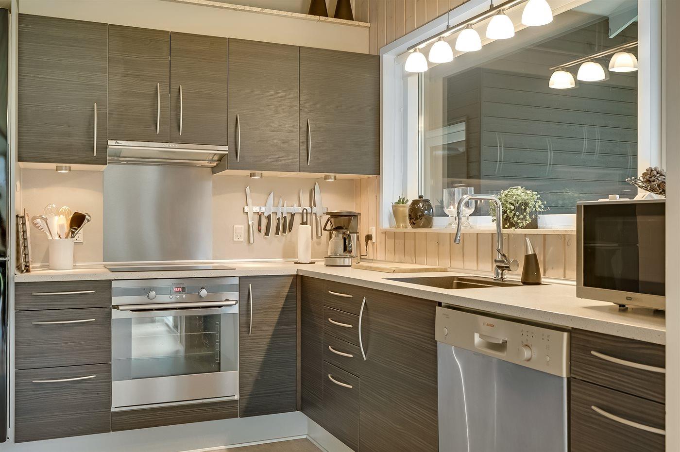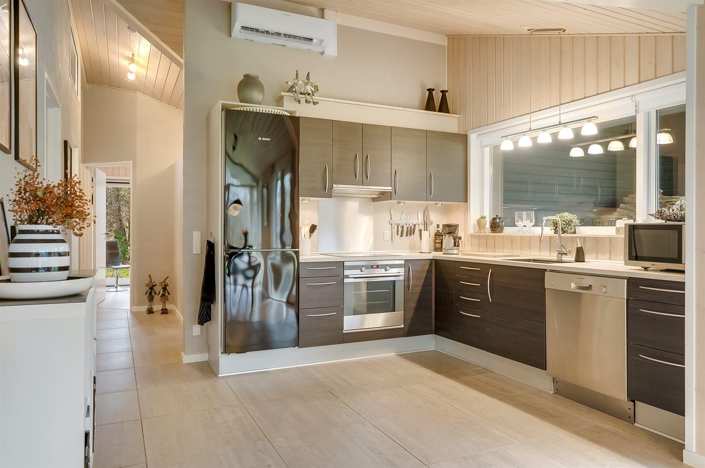 Køkkenet er udstyret med 1 køleskab. Der er 4 elkogeplader, varmluftovn, mikrobølgeovn samt opvaskemaskine Der er gulvvarme i køkkenet.