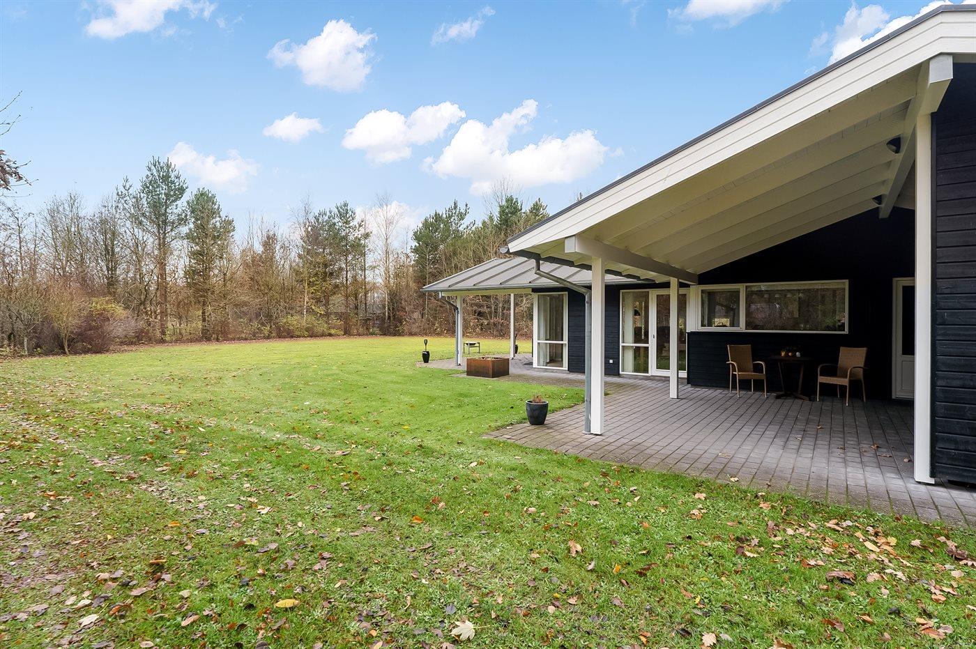 Ferieboligen er beliggende på en 2500 m² stor grund i skov/plantage. Der er 500 m til fjorden. Nærmeste forretning er beliggende i en afstand af 6000 m. Til ferieboligen hører åbent terrasseareal. Desuden er der overdækket terrasse. Gynge. Legetårn. Rutchebane. Grill til rådighed. Parkering ved ferieboligen.