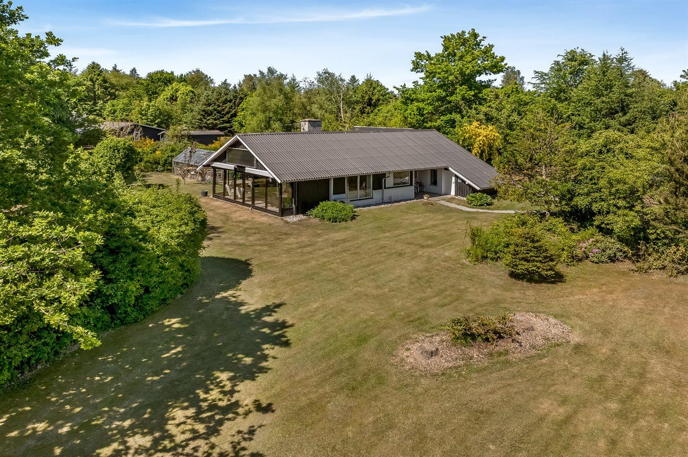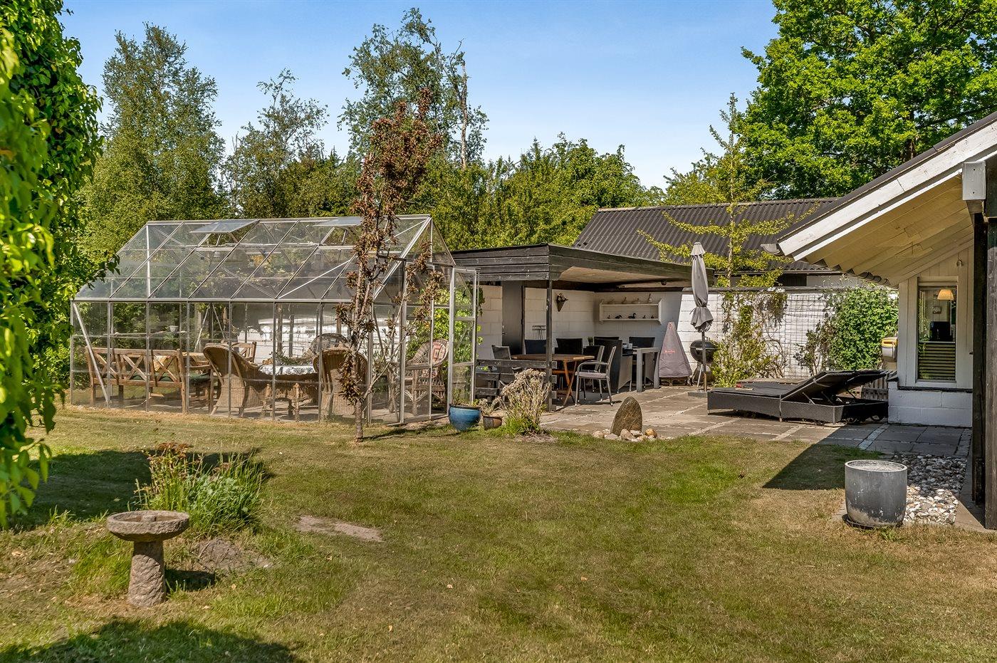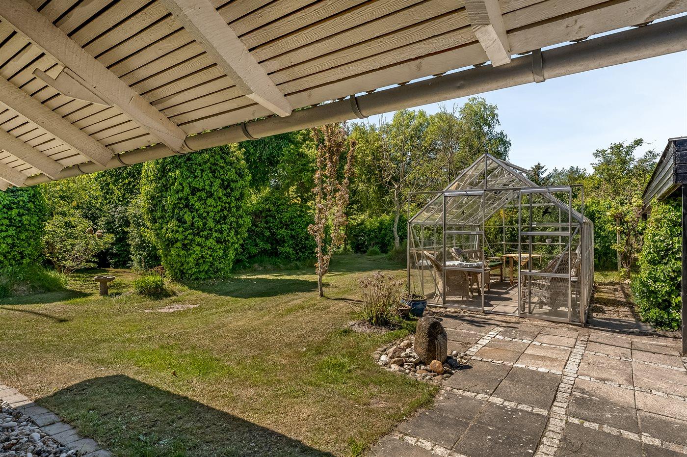 Til huset hører en stor grund, hvor du kan solbade og nyde de varmende stråler, spille bold eller lege tagfat med børnene. Der findes såvel åben som overdækket terrasse, hvor du kan tilbringe dejlige timer i det fri og skulle vejret vise sig fra sin til tider dårlige side, kan du sætte dig ind i den dejlige udestue.