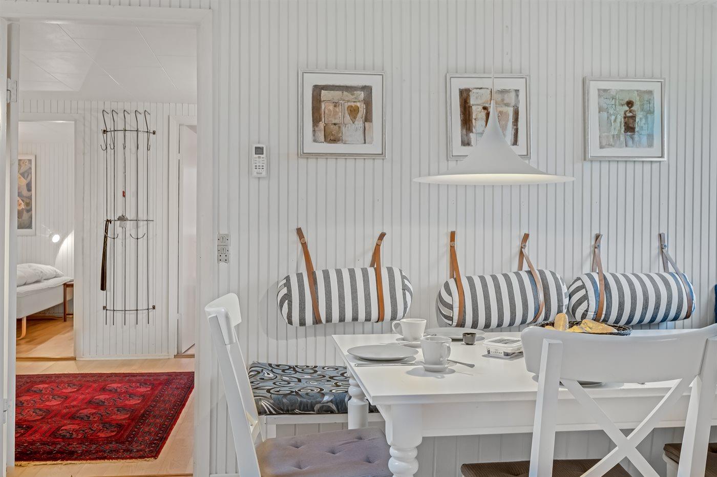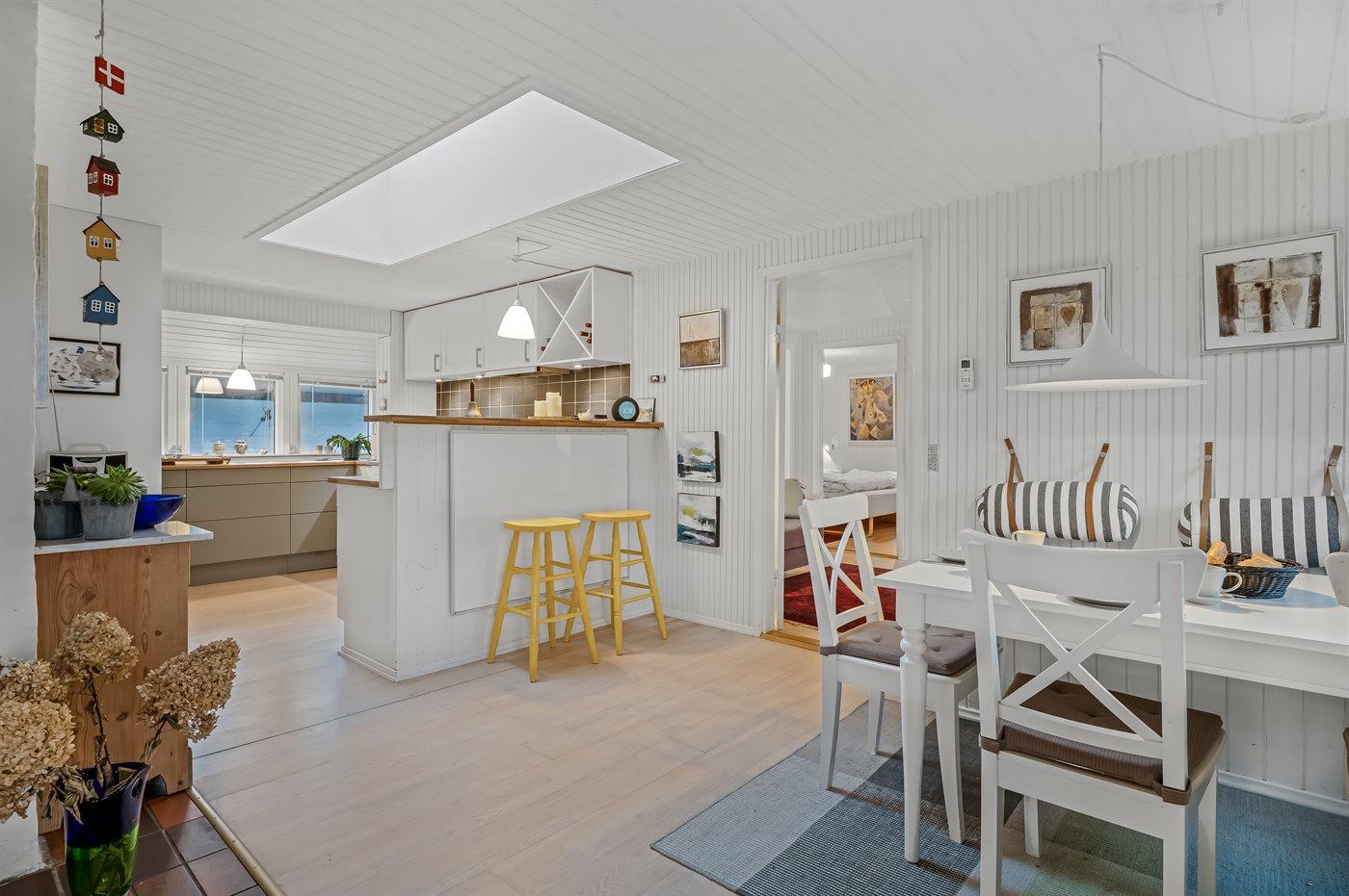 Køkkenet er udstyret med 1 køleskab. Der er 4 keramiske kogeplader, varmluftovn, mikrobølgeovn, Airfryer samt opvaskemaskine.