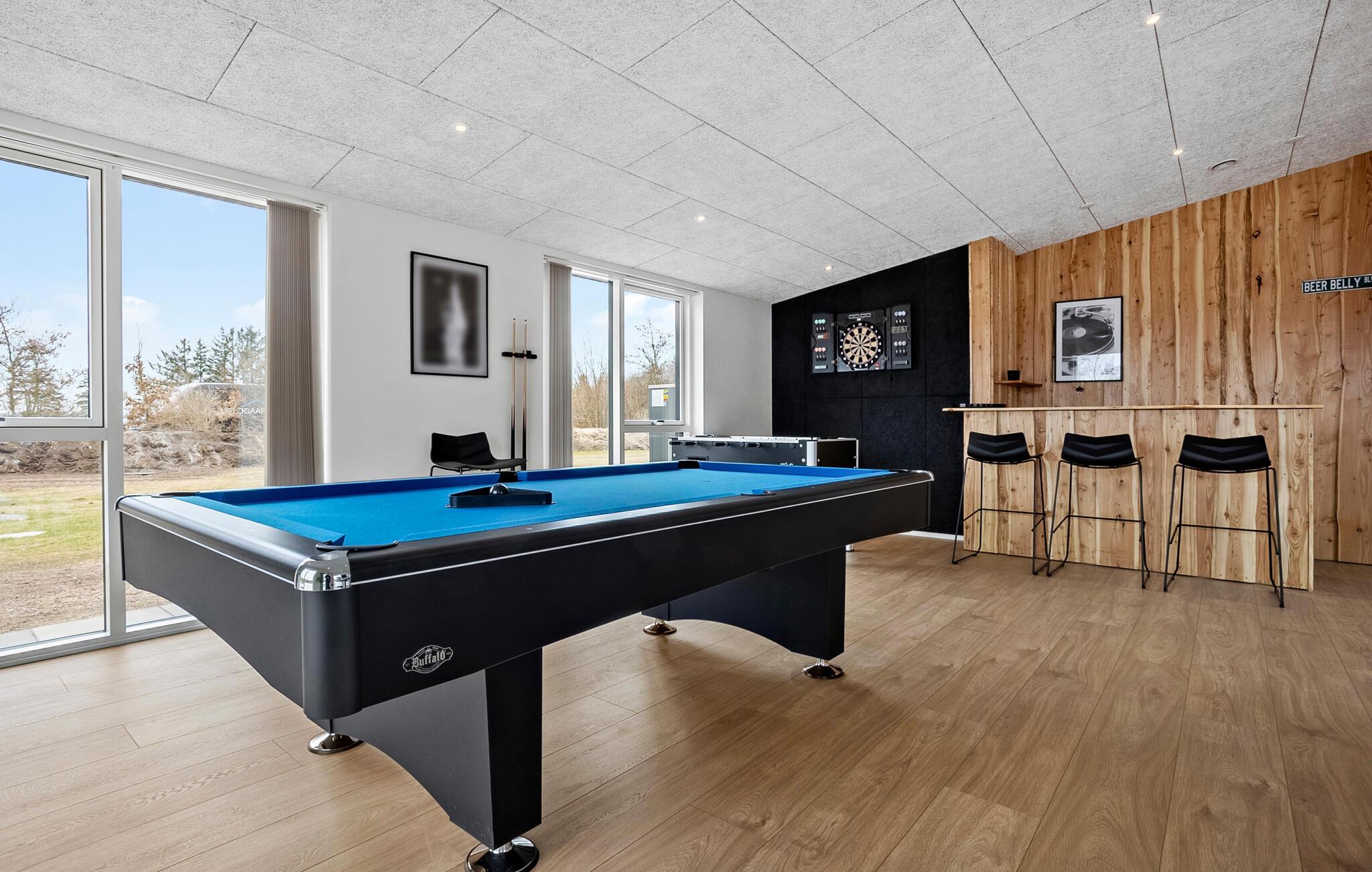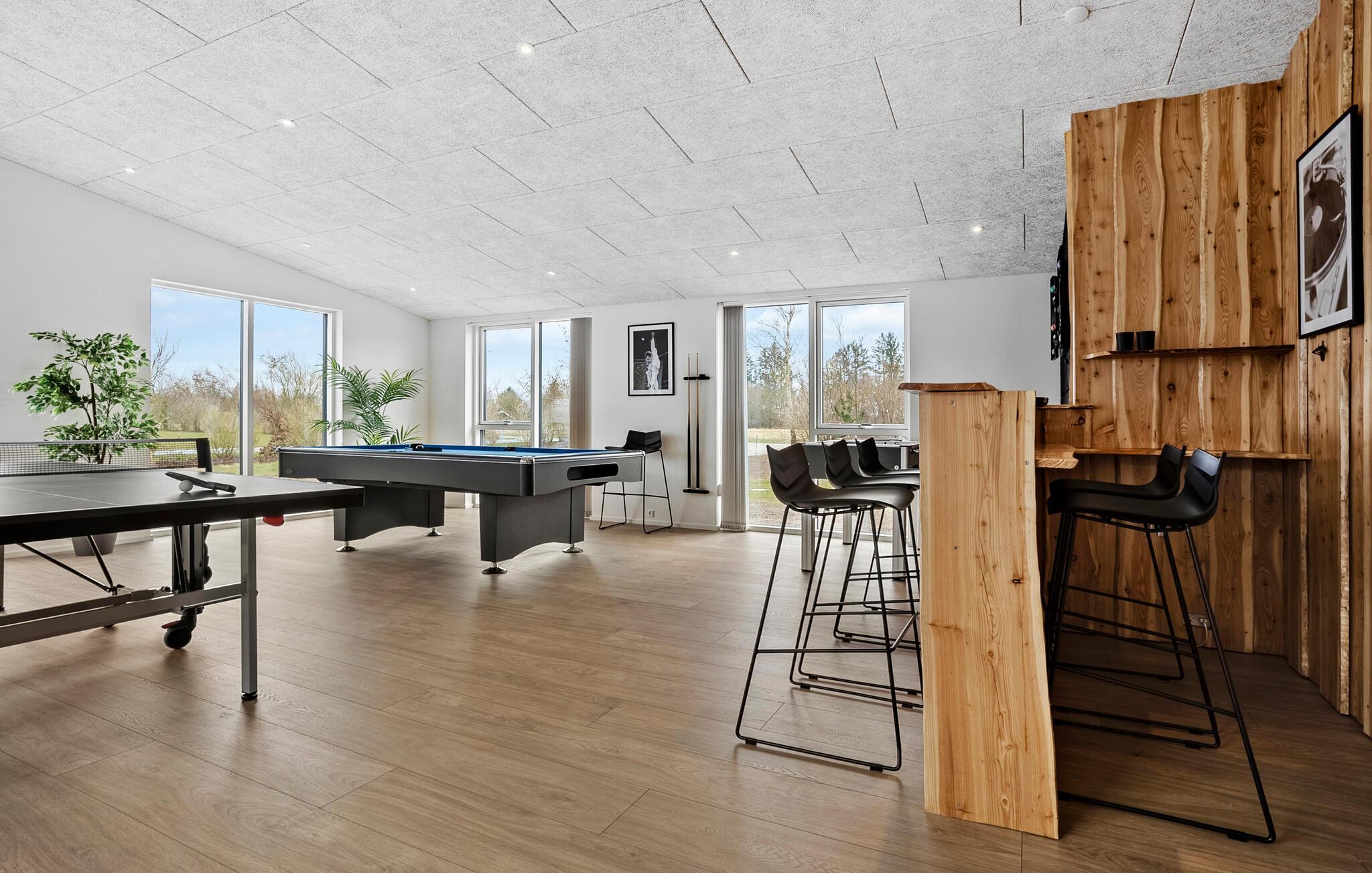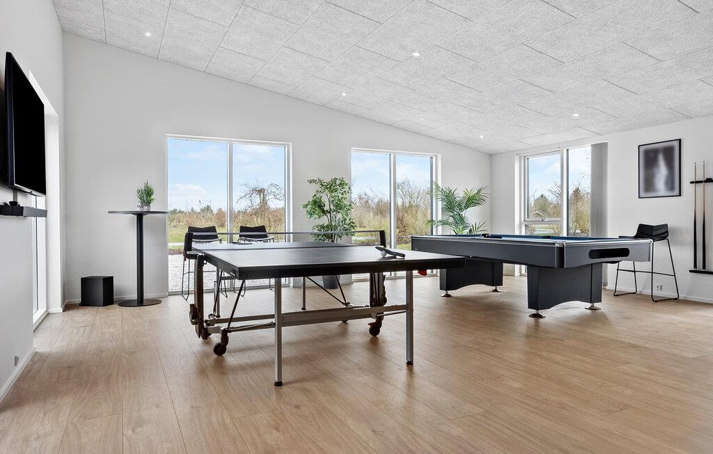Oplev en behagelig pause med familien eller en større gruppe i dette eksklusivt indrettede feriehus. Her finder I ideelle betingelser for afslapning, leg og hygge sammen. Gå ind i den lyse stue med højt til loftet og moderne møbler. Find jer godt til rette i et af de hyggelige sofahjørner eller træk jer tilbage på hemsen med en bog. Brug det åbne, moderne køkken med en rummelig kogeø og nyd måltiderne sammen ved det lange spisebord. Dyk ned i den rummelige indendørs pool med vandrutsjebane og afslut dagen i spabadet. Der tilbydes underholdning i aktivitetsrummet med bordtennis, billard og dart.