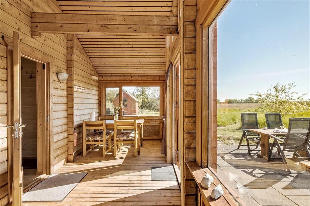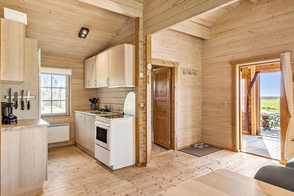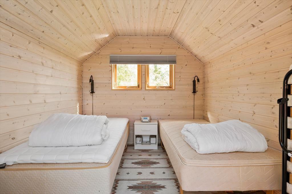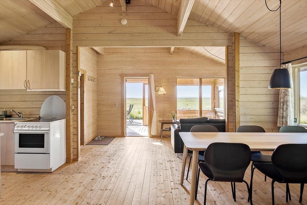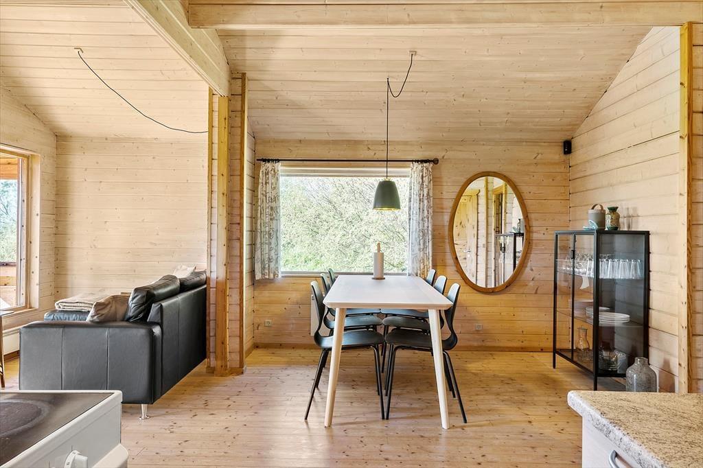 Når du træder indenfor i dette charmerende træhus, bliver du straks mødt af en lys og indbydende atmosfære, der emmer af feriestemning. Sommerhuset er ideelt indrettet til at skabe ro og afslapning med masser af naturligt lys, der strømmer ind gennem de store vinduespartier. Samlingspunktet er stuen, hvor komfortable møbler indbyder til hyggelige aftener foran brændeovnen. Det åbne køkken ligger i direkte forbindelse med spisepladsen, så samtalerne kan flyde frit, mens der laves mad. Til de yngste – eller dem, der bare trænger til lidt privatliv – er det lille, hyggelige anneks med to sovepladser en skøn mulighed.