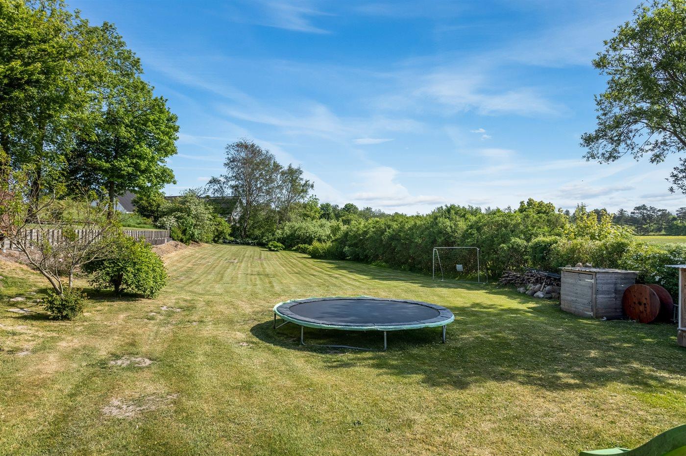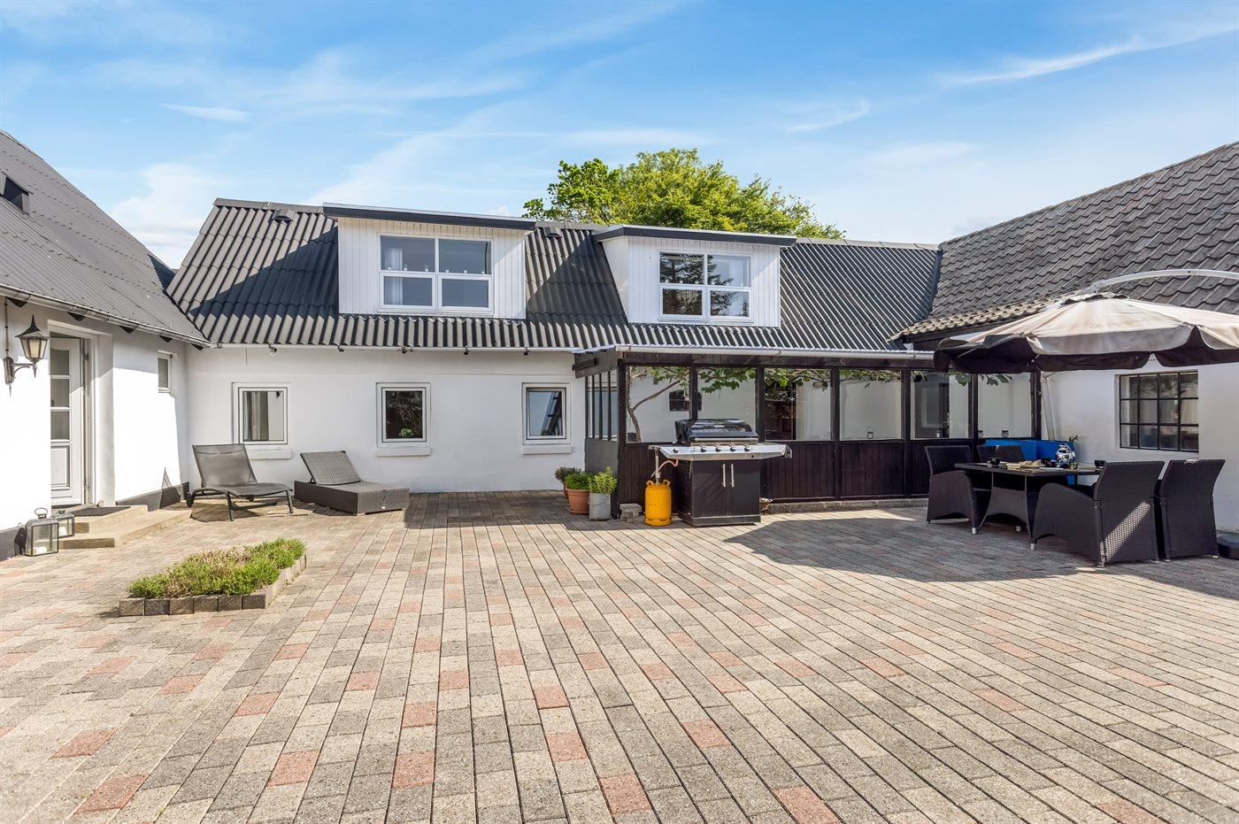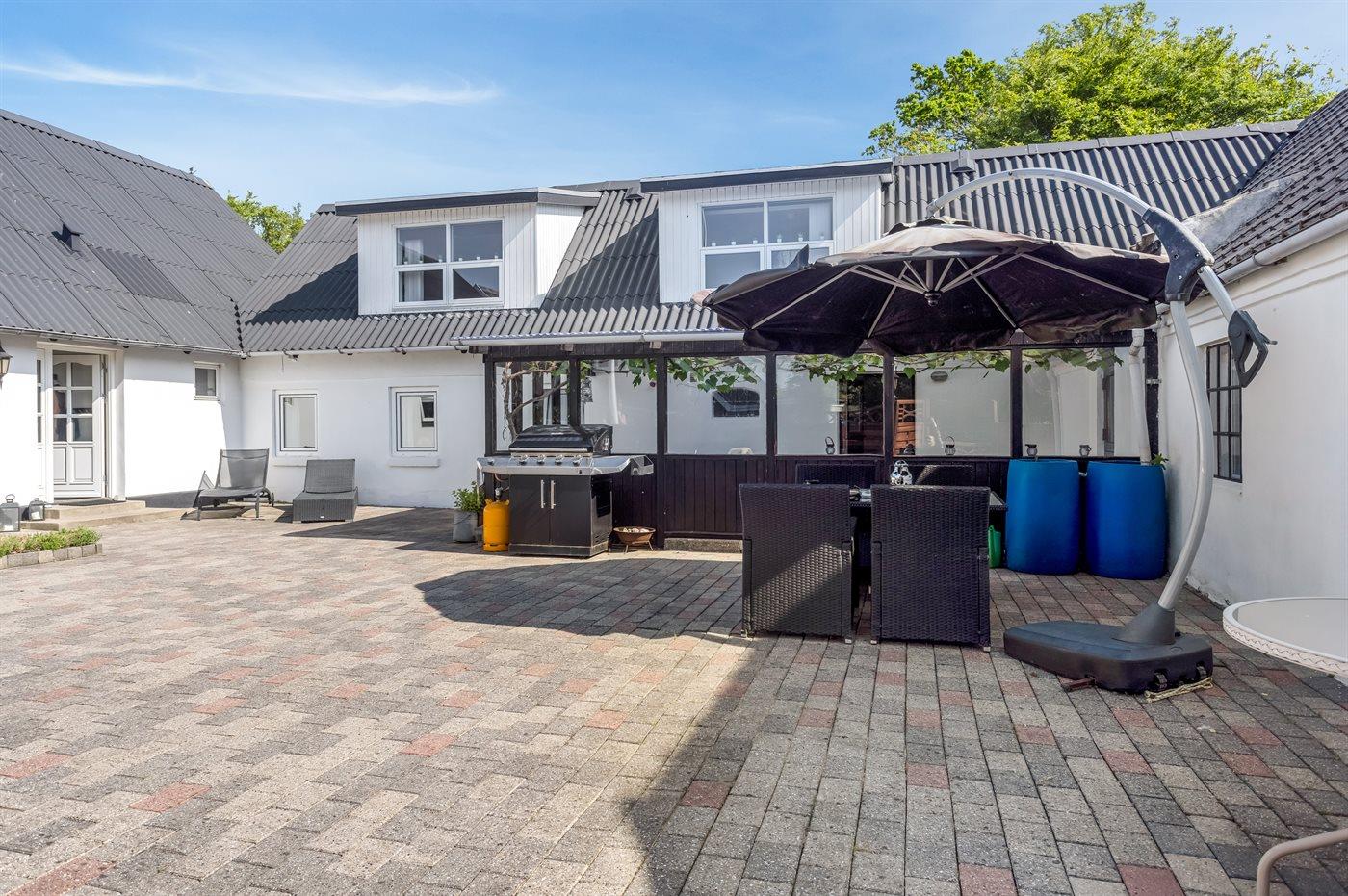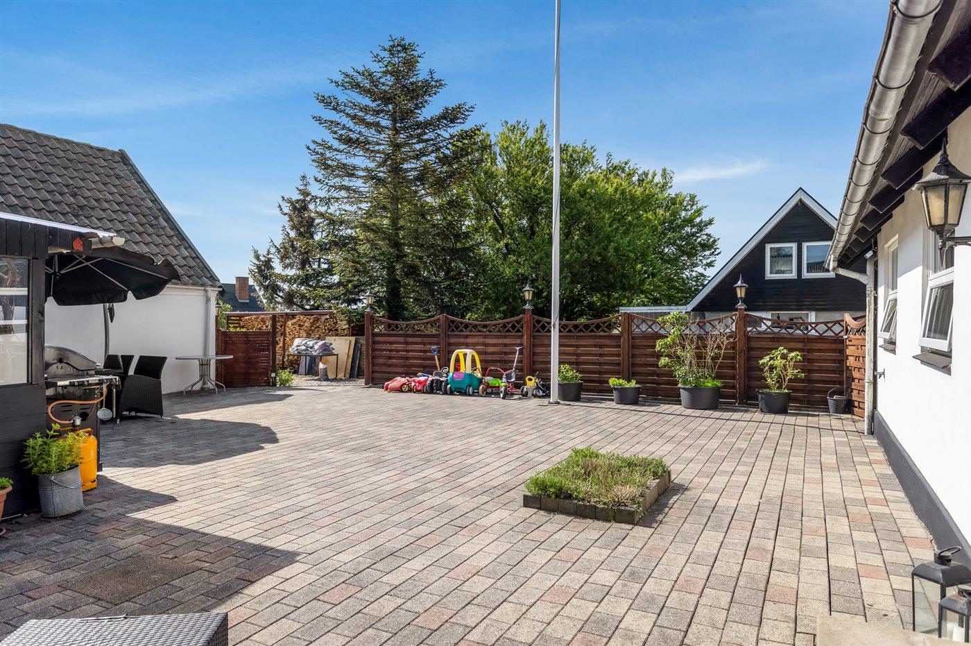 Til lejligheden hører der en privat overdækket terrasse på 20 m2 samt en stor åben terrasse mod øst (bag lejligheden) med udsigt til marker og havet. Nedenfor den åbne terrasse er der en stor fælles græsplæne med tilhørende legeplads, hvor der er plads til at spille bold, lege i sandkasse, gynge eller få en hoppetur på trampolinen. Det er også muligt at benytte den fælles gårdhave, hvor der er mulighed for at grille. Der er parkering ved ferieboligen.