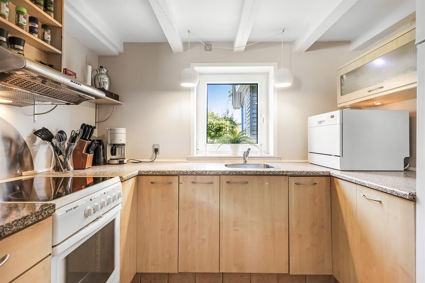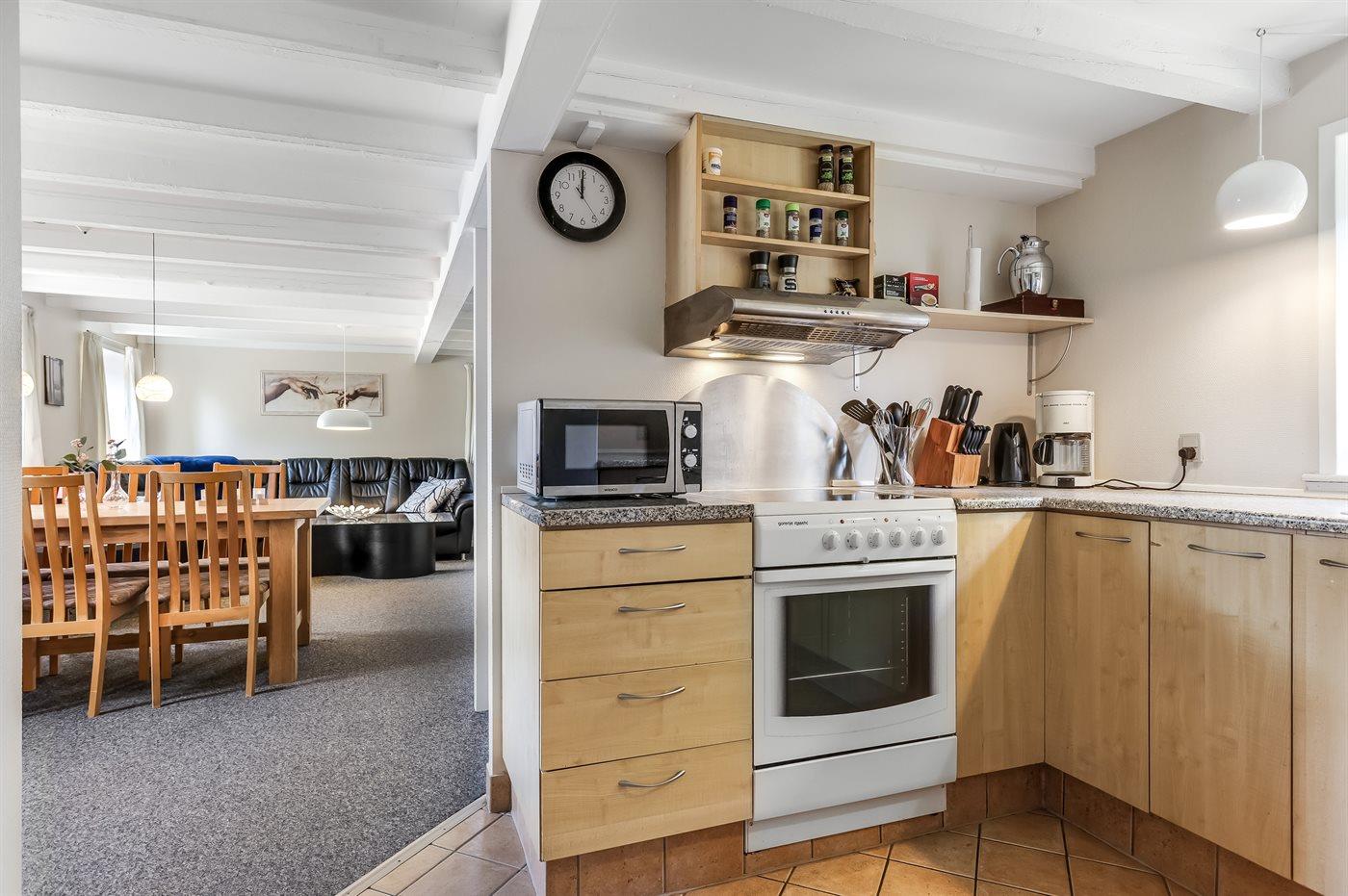 Køkkenet er udstyret med opvaskemaskine og 1 køleskab med indbygget fryser. Der er 4 keramiske kogeplader, varmluftovn, mikrobølgeovn.